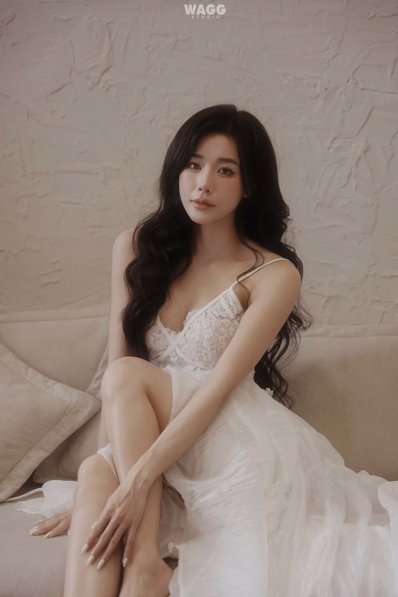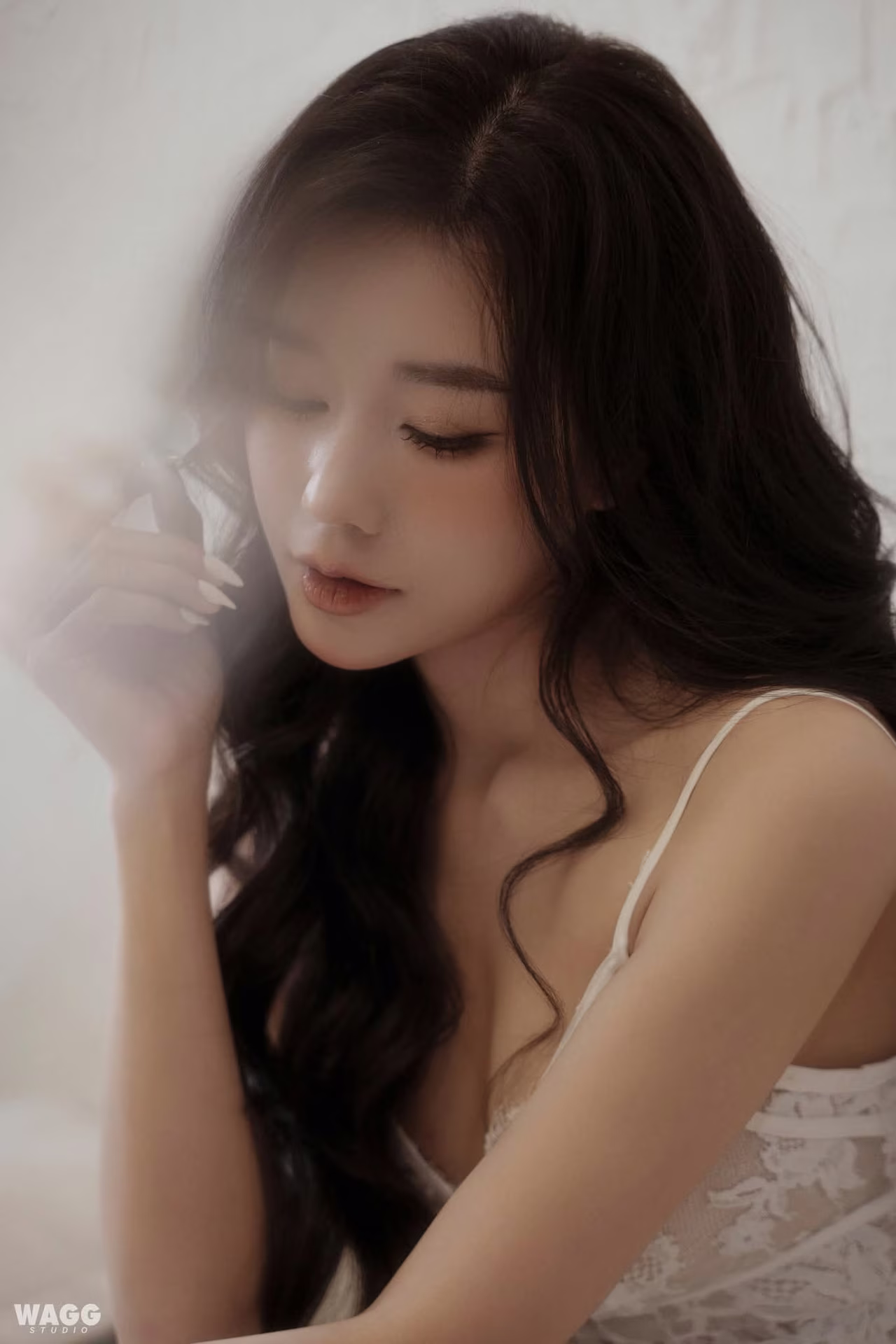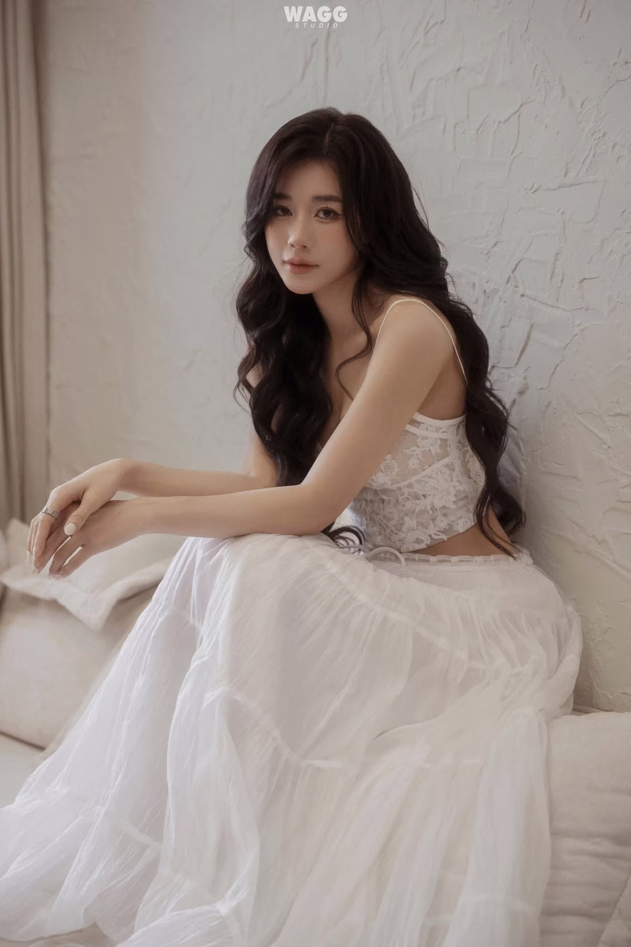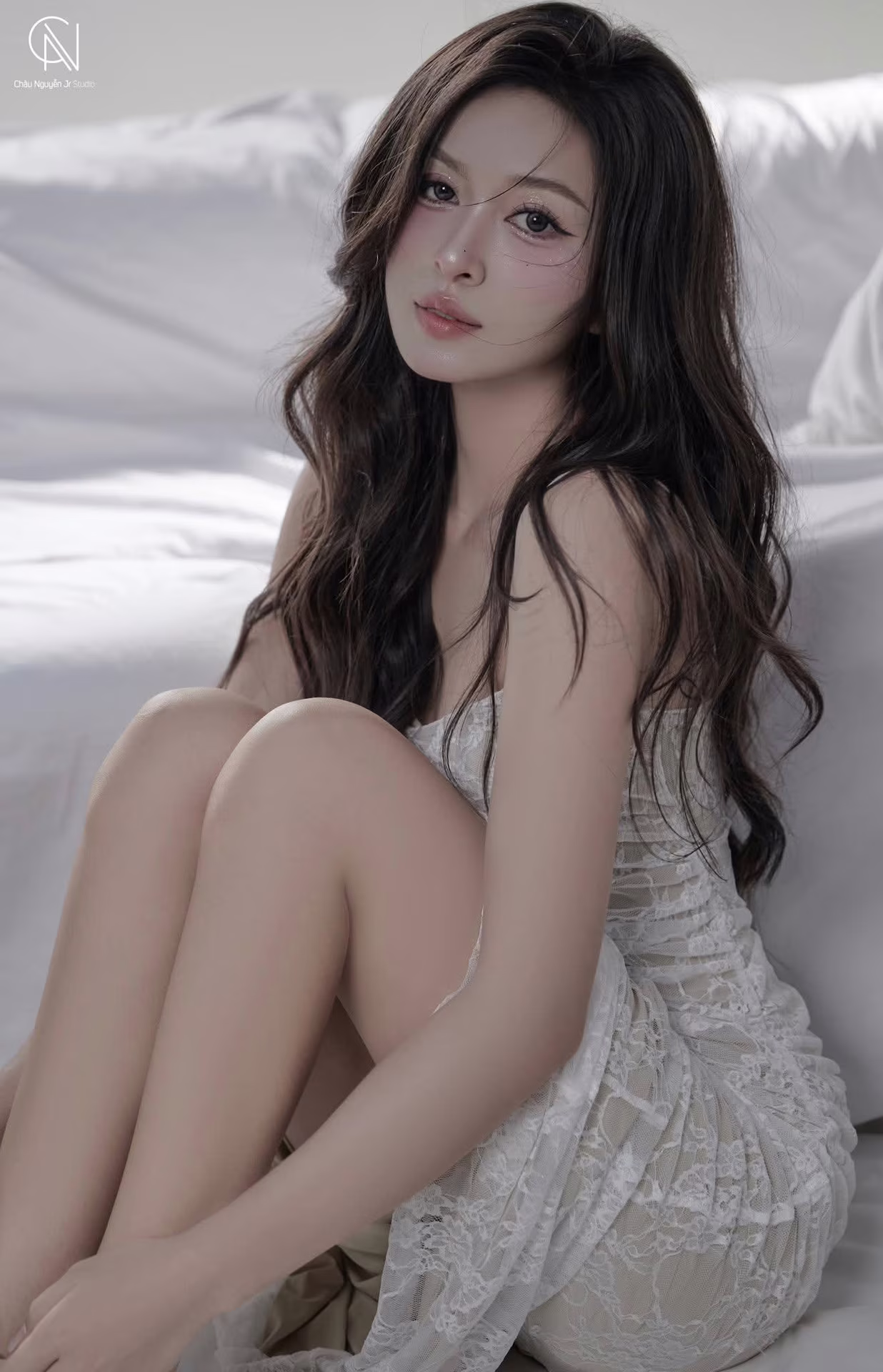This captivating image beautifully portrays a woman exuding gentle elegance and sophisticated allure. Dressed in a pristine white gown, possibly crafted from delicate lace or flowing silk, her graceful silhouette is perfectly accentuated. Her long, dark, wavy hair cascades naturally, adding a touch of mysterious charm as she gazes subtly over her shoulder. Soft, ethereal lighting illuminates her flawless complexion and refined facial features, enhancing her serene expression. The entire setting, with its minimalist white backdrop, radiates an air of timeless luxury and refined taste, blending inner beauty with external poise. This photograph is more than just a fashion statement; it is an artistic tribute to the pure, sensual, and captivating essence of modern femininity. #Vietnamese #pretty #charmVGU No.5: Unveiling the Elegant Artistic Beauty of a Vietnamese Woman