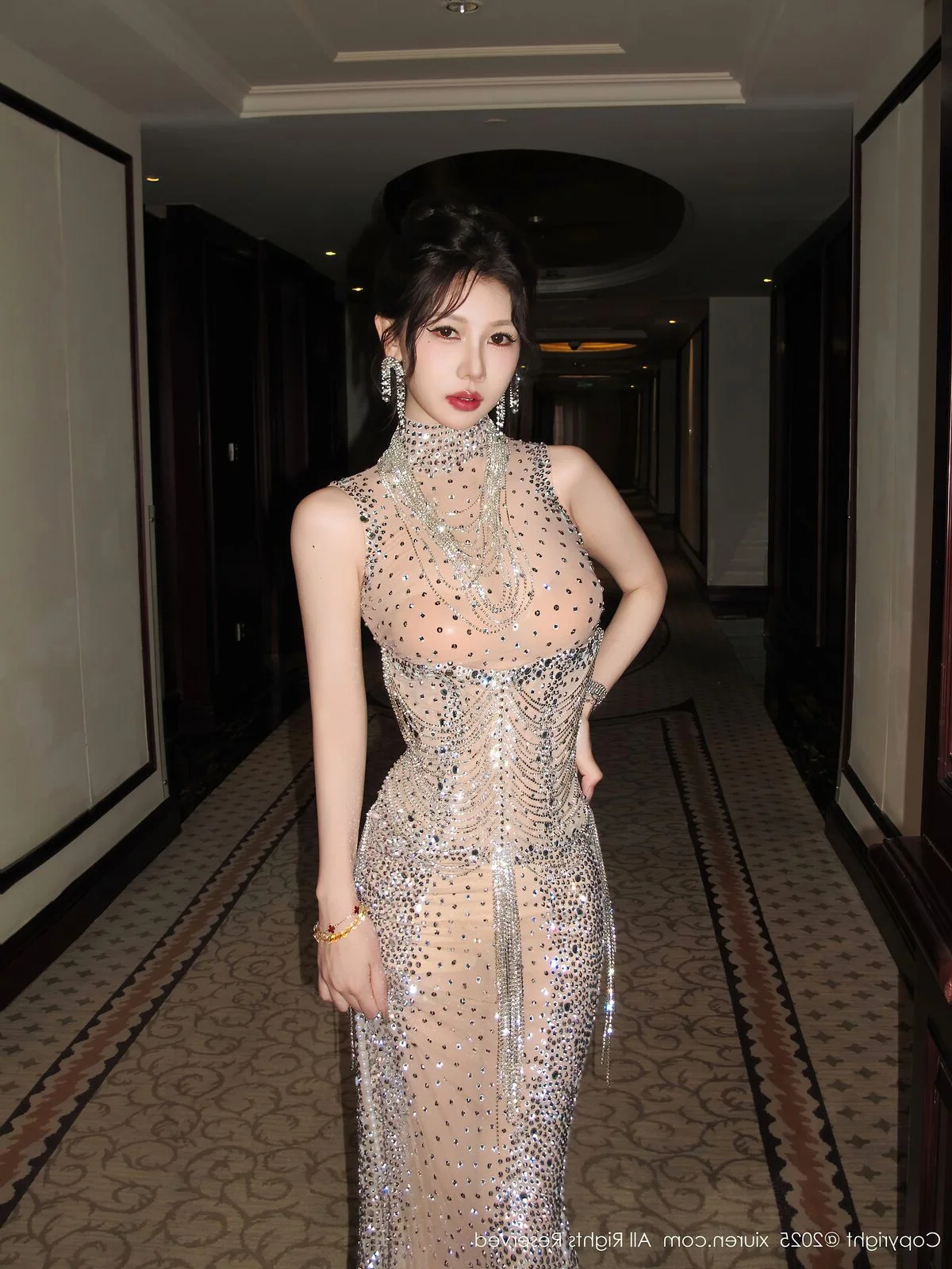Step into a world of cinematic nostalgia with Yin Tian Tian Sunny in this breathtaking XiuRen No.10802 collection. Set against the backdrop of a sophisticated, wood paneled interior that whispers tales of old world Shanghai, the visual storytelling here is truly captivating. The model shines in an exquisite high neck gown, intricately adorned with shimmering beads and crystals that catch the warm ambient light beautifully. Her poise and expression evoke a sense of timeless glamour, blending a touch of mystery with undeniable allure. The choice of sheer fabric combined with luxurious embellishments showcases a bold yet refined fashion sensibility. Every frame feels like a curated piece of art, where the rich textures of the vintage furniture meet the radiant glow of the outfit. It is a perfect harmony of vintage aesthetics and modern femininity, capturing a moment of pure, sophisticated beauty that resonates with anyone who appreciates the finer details of style and mood.#VintageGlamour #YinTianTianSunny #XiuRen #LuxuryLifestyle #HighFashionArt