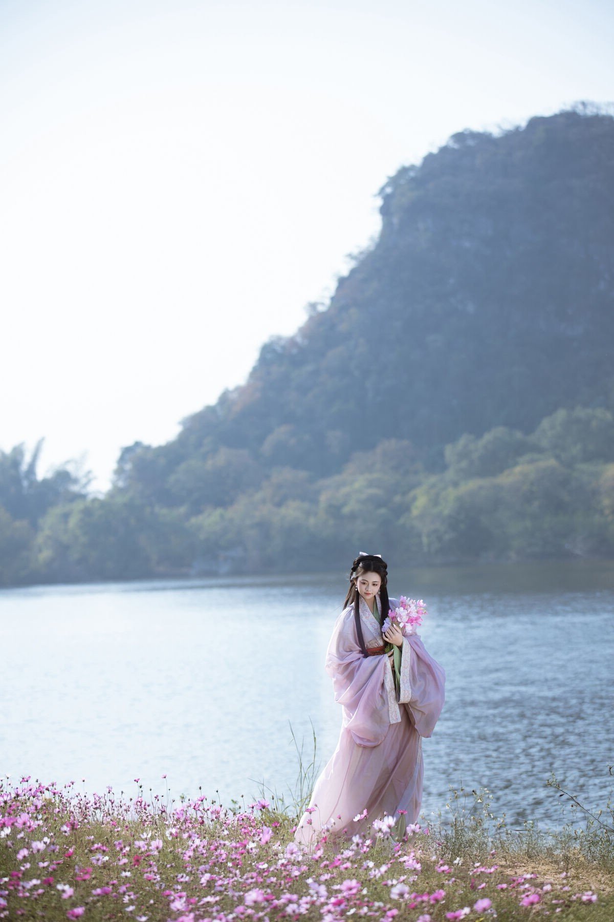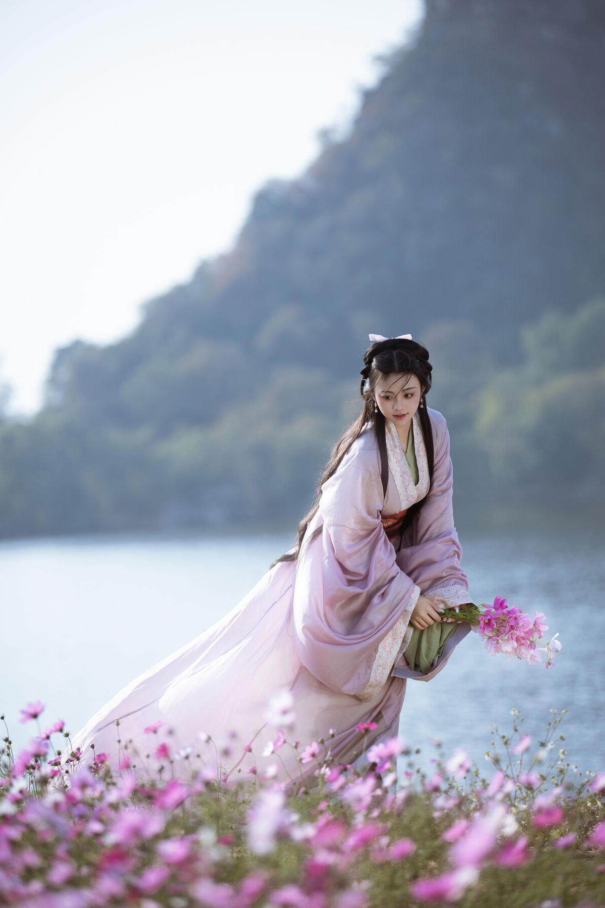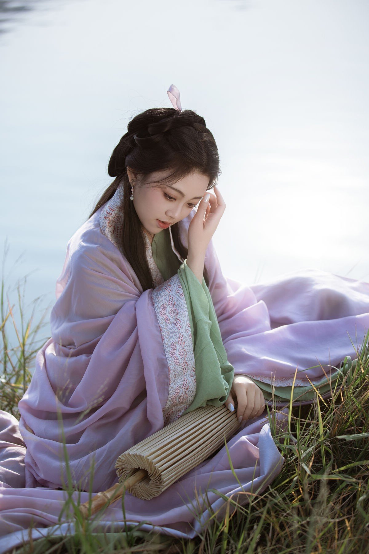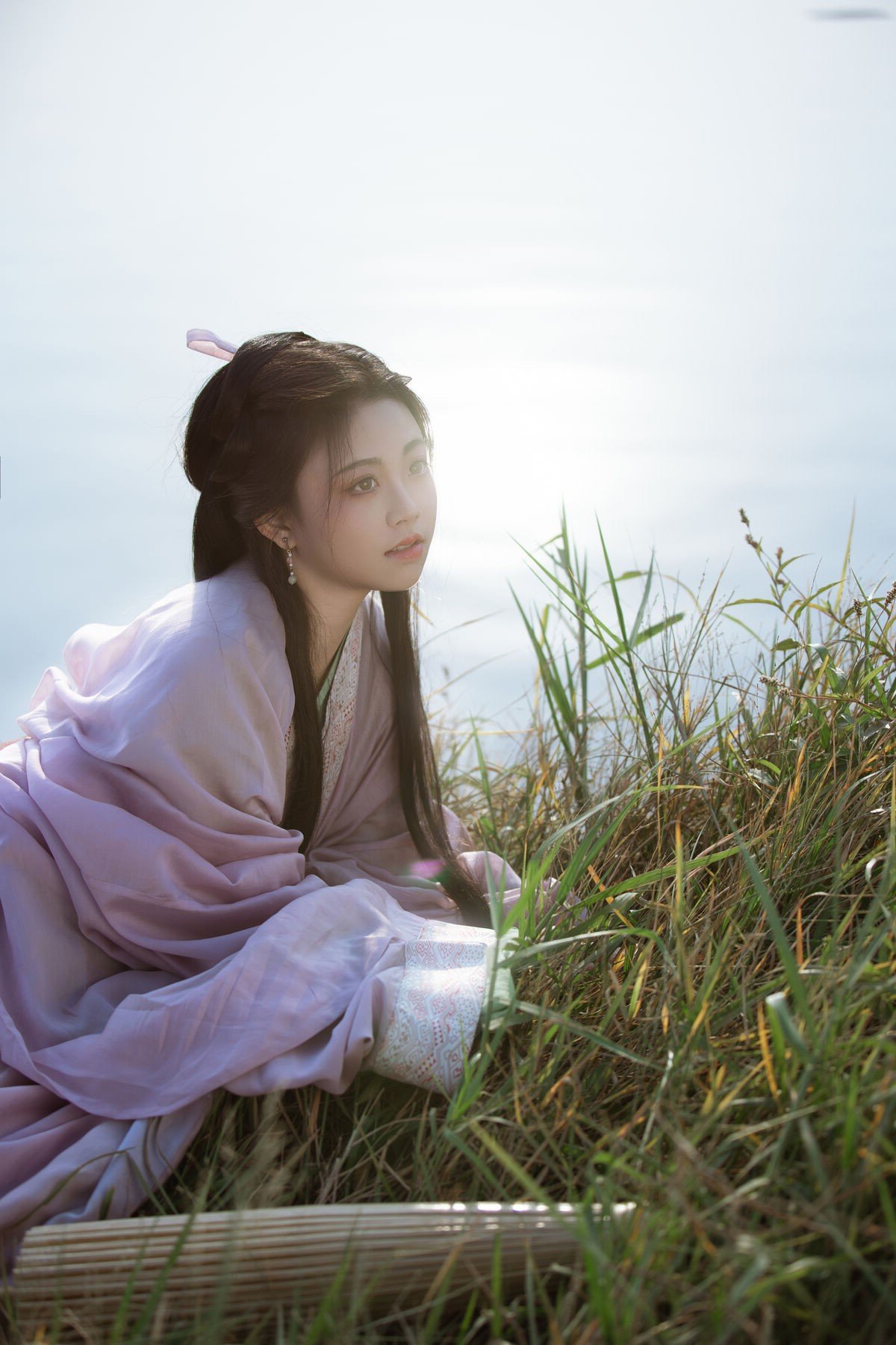 This exquisite photograph captures a graceful woman adorned in an elegant lavender Hanfu standing amidst a dreamy field of purple flowers. Her traditional beauty blends seamlessly with the serene natural landscape creating a poetic visual narrative. The delicate blossoms gently surround her crafting an ethereal atmosphere reminiscent of a fairytale. In the distance a tranquil lake and rolling mountains under a clear sky further enhance the pure charm of the maiden. More than just a fashion shot this image is a celebration of traditional aesthetics and sophisticated photography. The picturesque setting evokes a profound sense of peace and romance. YiTuYu Vol 8304 谨陬捌 offers a captivating visual journey into a fairytale world brought to life.Stories