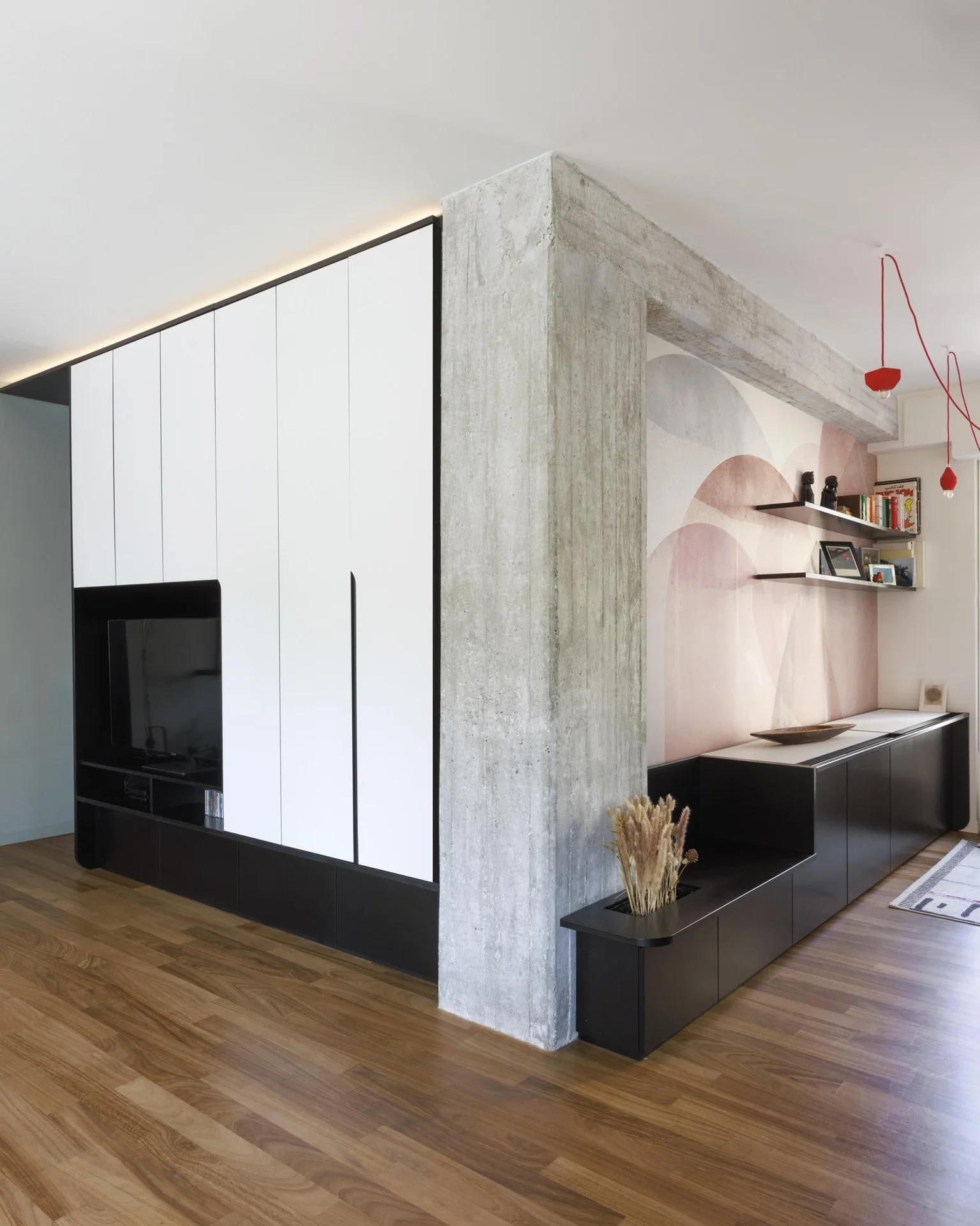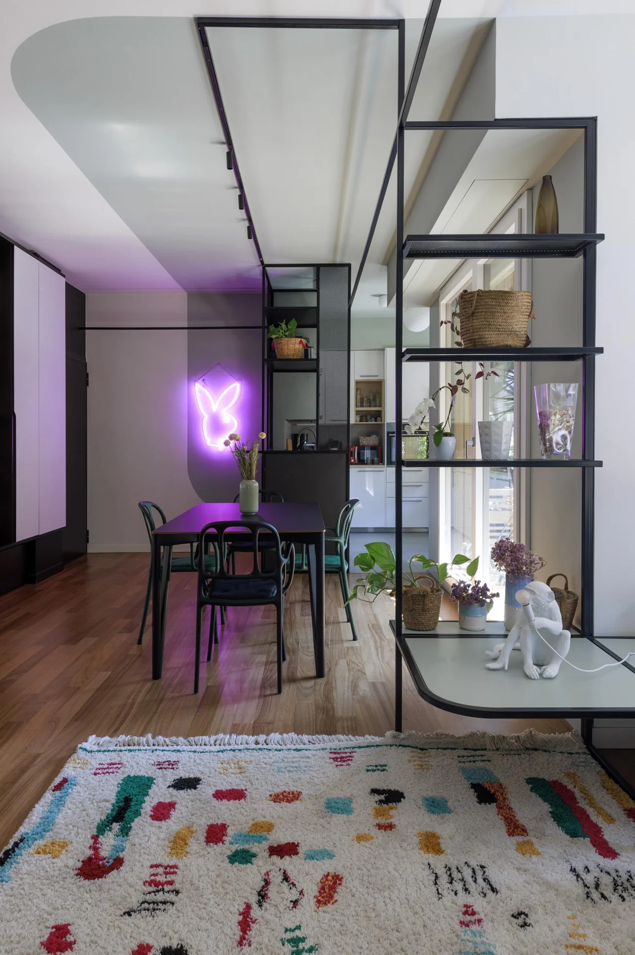 Step into the heart of Milan with Casa HG, a stunning example of how smart design can transform a compact 60m2 space into an airy sanctuary. The interior beautifully balances industrial elements like raw concrete and slender black iron frames with the warmth of natural wood floors. Large windows invite an abundance of sunlight, dancing across the deep blue sofa and the playful patterns of the area rug. This renovation proves that you do not need to tear down walls to create a sense of openness; it is all about the clever interplay of light, shadow, and minimalist structures. The vibe is quintessentially Milanese, sophisticated yet effortless, where every detail feels curated and purposeful. It is a masterclass in modern living, blending functionality with an artistic soul that inspires a slower, more intentional way of life. By using iron frames to define zones without blocking the view, the apartment maintains a seamless flow that feels much larger than its footprint, capturing the true essence of contemporary urban elegance.