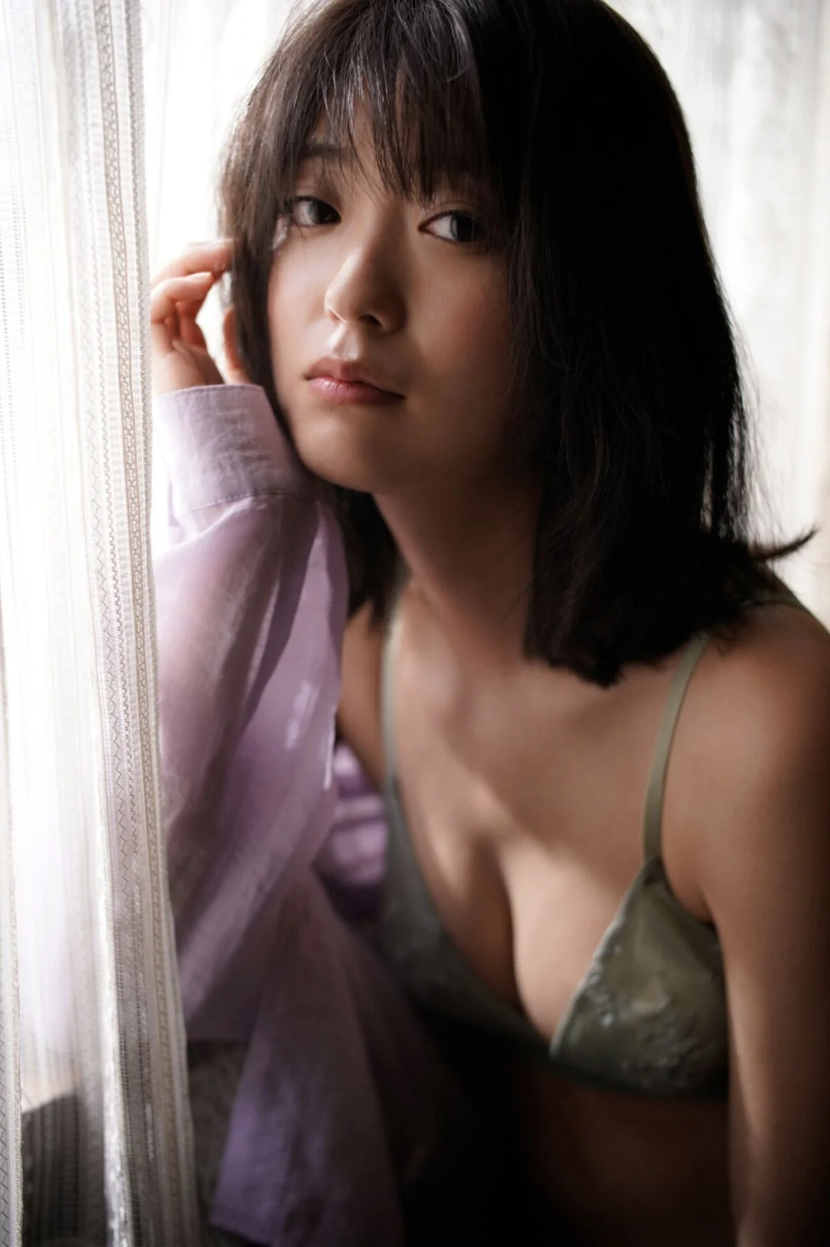 This stunning close up captures Mio Kudo in a moment of serene contemplation, bathed in the soft golden light of early summer. Her expression is a delicate balance of vulnerability and quiet strength, with eyes that seem to tell a story of peaceful mornings and slow living. The fashion choice here is impeccably simple yet effective, featuring a lavender linen shirt that feels both airy and sophisticated. The pastel hue beautifully complements the warm wooden tones of the background, creating a harmonious color palette that is pleasing to the eye. Her natural, slightly tousled hair adds to the effortless charm and authentic vibe of the shoot. It is a masterclass in visual storytelling, where every detail from the texture of the fabric to the gentle shadows contributes to an atmosphere of pure, understated elegance that defines the classic Japanese aesthetic.#MioKudo #PortraitPhotography #SoftAesthetic #JapaneseStyle #SummerGlow