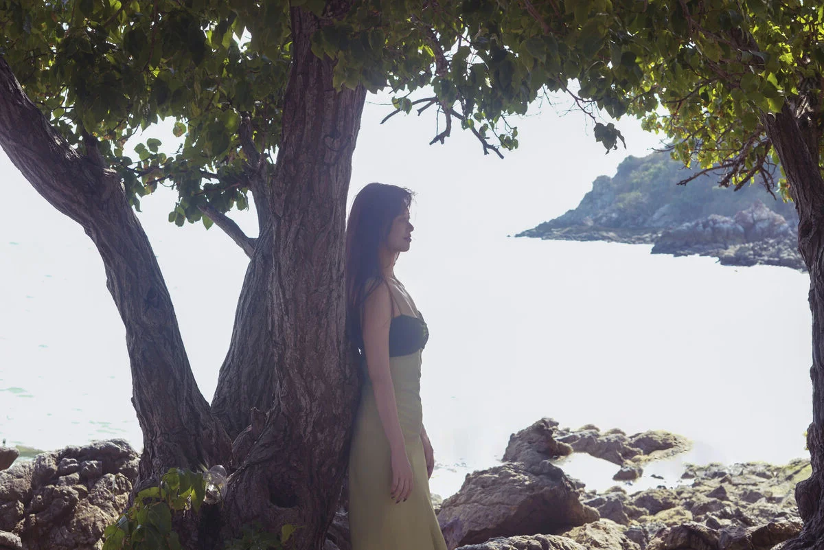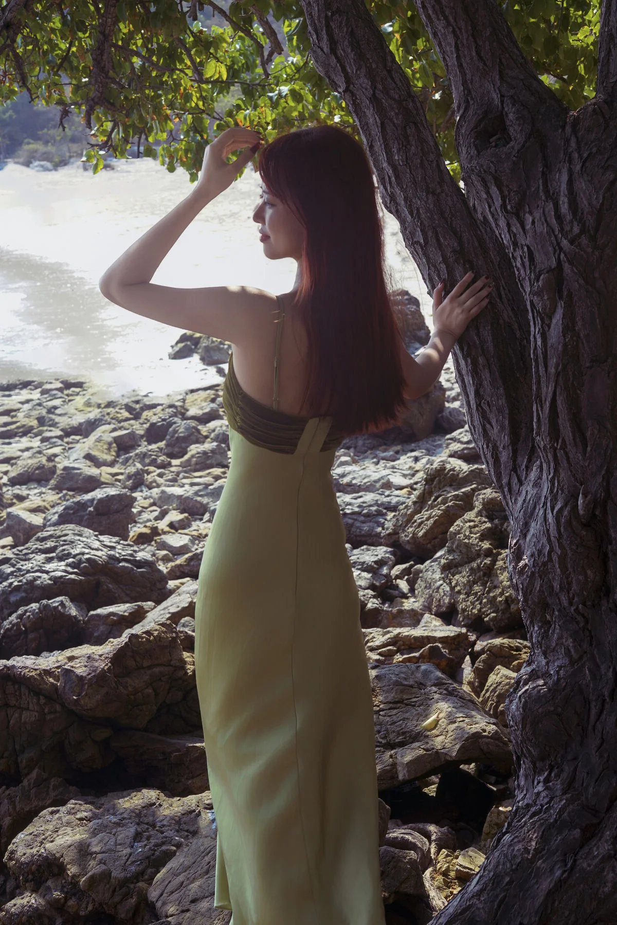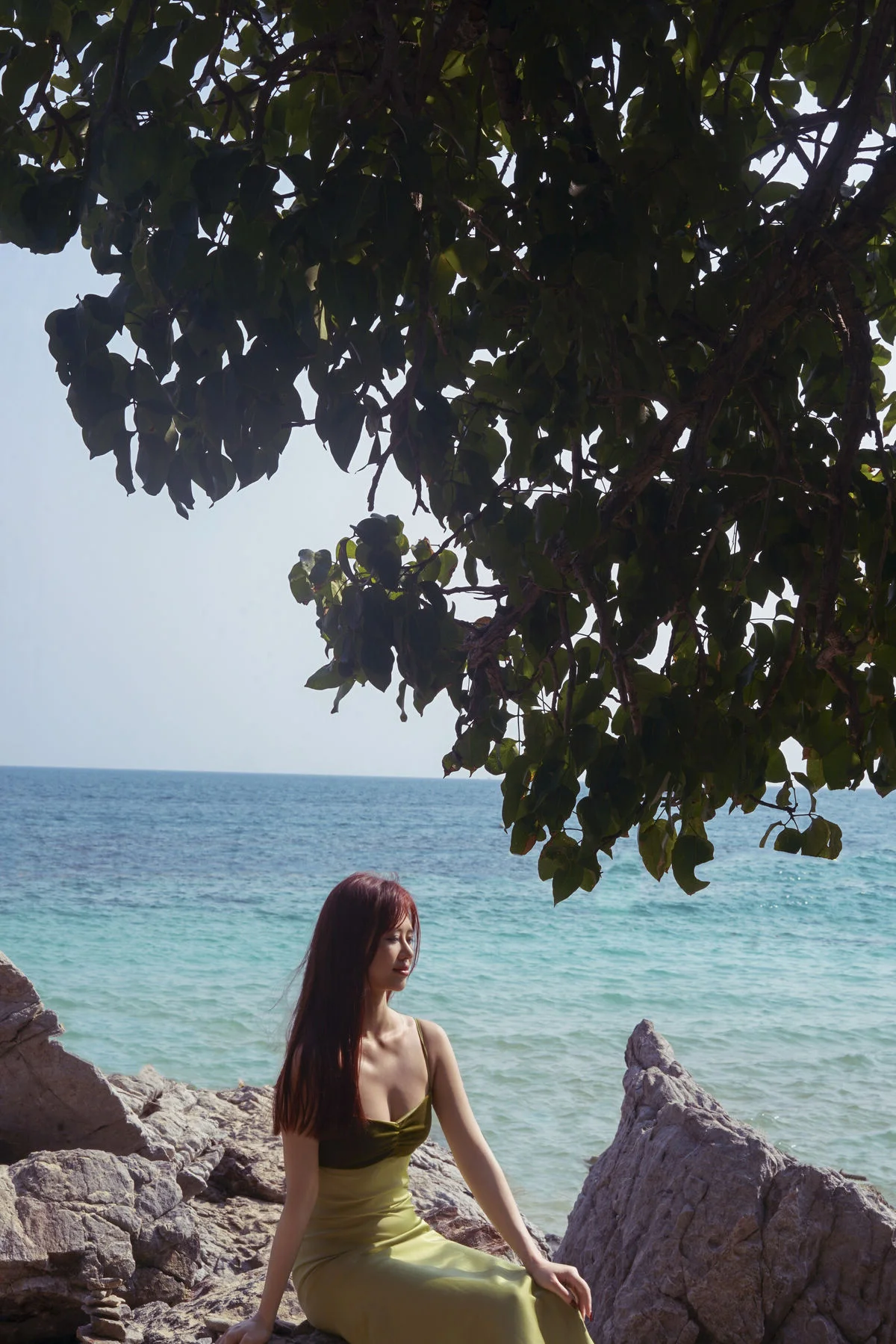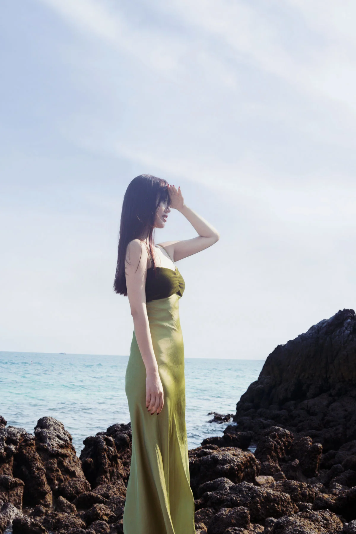 This stunning image captures a serene moment of model Chenaling_CL amidst majestic natural scenery. She sits gracefully on coastal rocks, her long flowing hair blending with the turquoise waters of the vast ocean. Her light green dress elegantly accentuates her slender figure, creating a wonderful harmony with the colors of the sea and the lush foliage above. Soft sunlight illuminates her delicate features and natural demeanor. The overall picture exudes a gentle, romantic, and poetic beauty, inviting viewers to appreciate the perfect fusion of human and nature. This is part of the exclusive YiTuYu Vol.8778 collection where beauty is defined through each artistic frame.#ChenalingCL #YiTuYu #BeachPhotoshoot #ModelPhotography #NatureBeauty