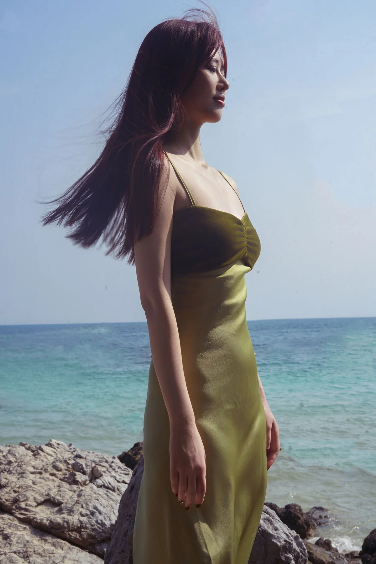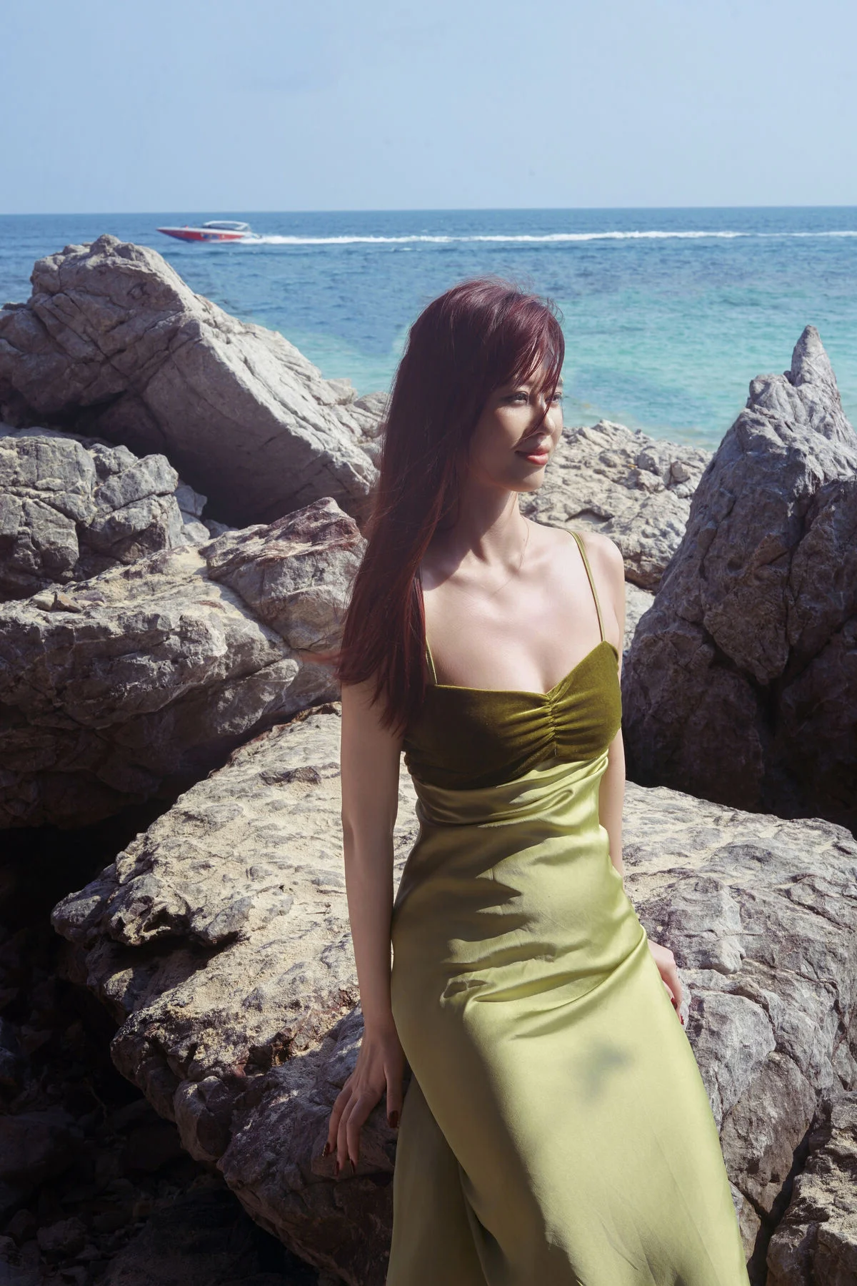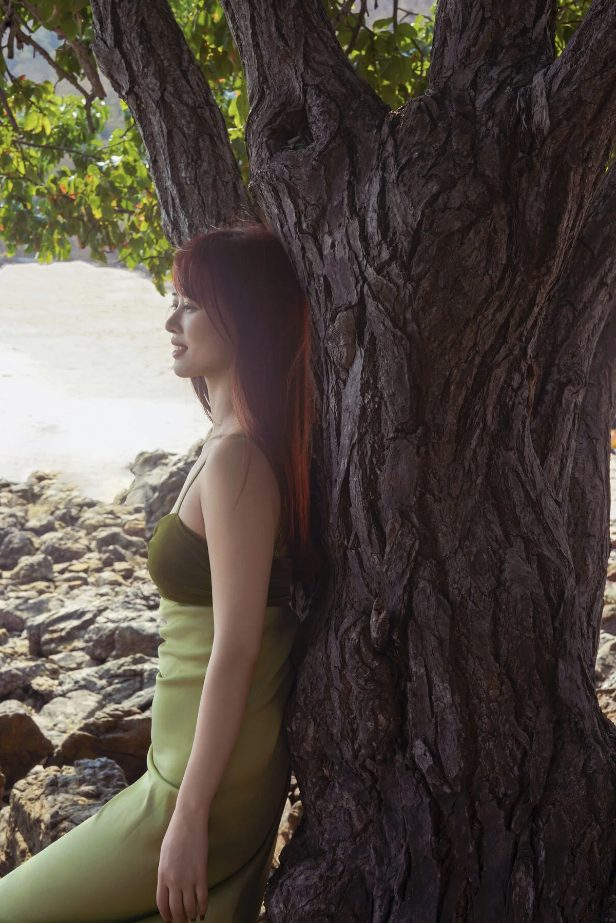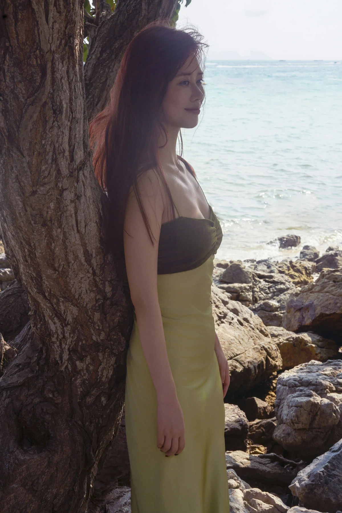 This stunning image captures a serene moment of model Chenaling_CL amidst majestic natural scenery. She sits gracefully on coastal rocks, her long flowing hair blending with the turquoise waters of the vast ocean. Her light green dress elegantly accentuates her slender figure, creating a wonderful harmony with the colors of the sea and the lush foliage above. Soft sunlight illuminates her delicate features and natural demeanor. The overall picture exudes a gentle, romantic, and poetic beauty, inviting viewers to appreciate the perfect fusion of human and nature. This is part of the exclusive YiTuYu Vol.8778 collection where beauty is defined through each artistic frame.#ChenalingCL #YiTuYu #BeachPhotoshoot #ModelPhotography #NatureBeauty