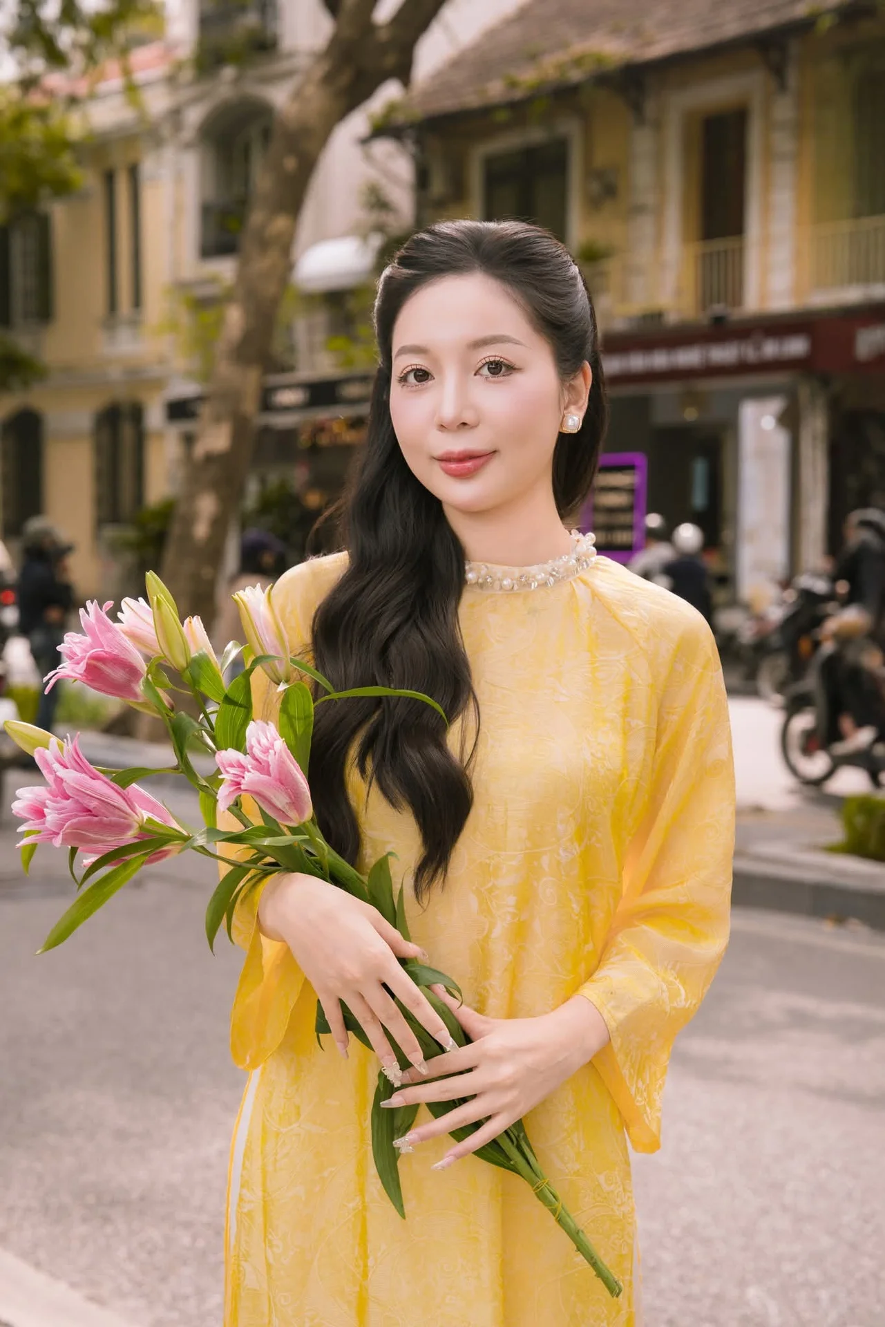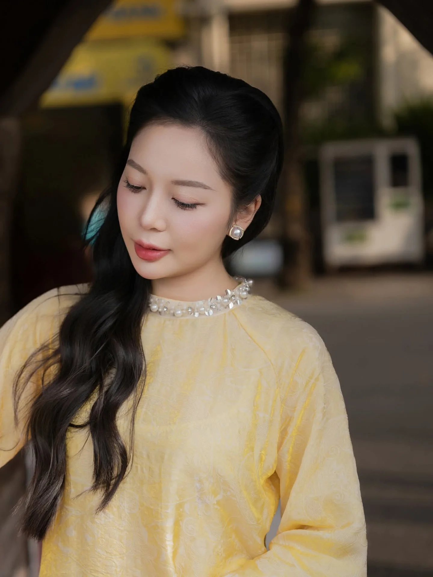 This image captures the gentle and elegant beauty of a Vietnamese girl With her long wavy dark hair and a contemplative gaze she exudes the unique grace of an East Asian woman She wears a sophisticated light yellow top perhaps a modern interpretation of traditional attire enhancing her charming and gentle demeanor The intricately embellished neckline further adds to her luxurious and noble appearance This blend of classic and modern beauty creates an irresistible allure The ancient archway in the background further highlights her ethereal beauty deeply imbued with Vietnamese soul This image represents youth timeless beauty and the confident poise of a contemporary woman#VietnameseBeauty #ElegantWoman #ModernTraditionalAttire #AsianCharm #GracefulStyle #AoDai
