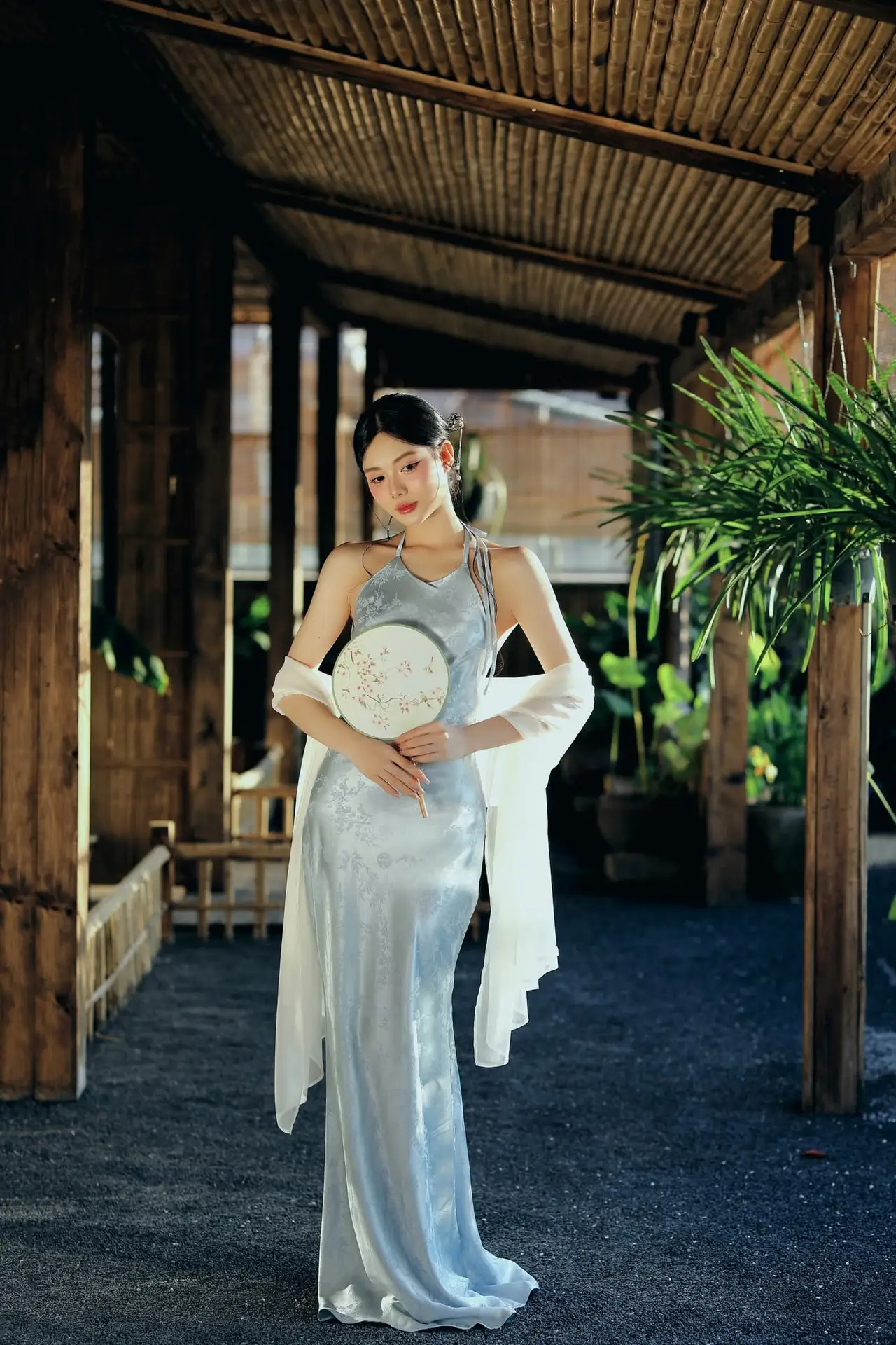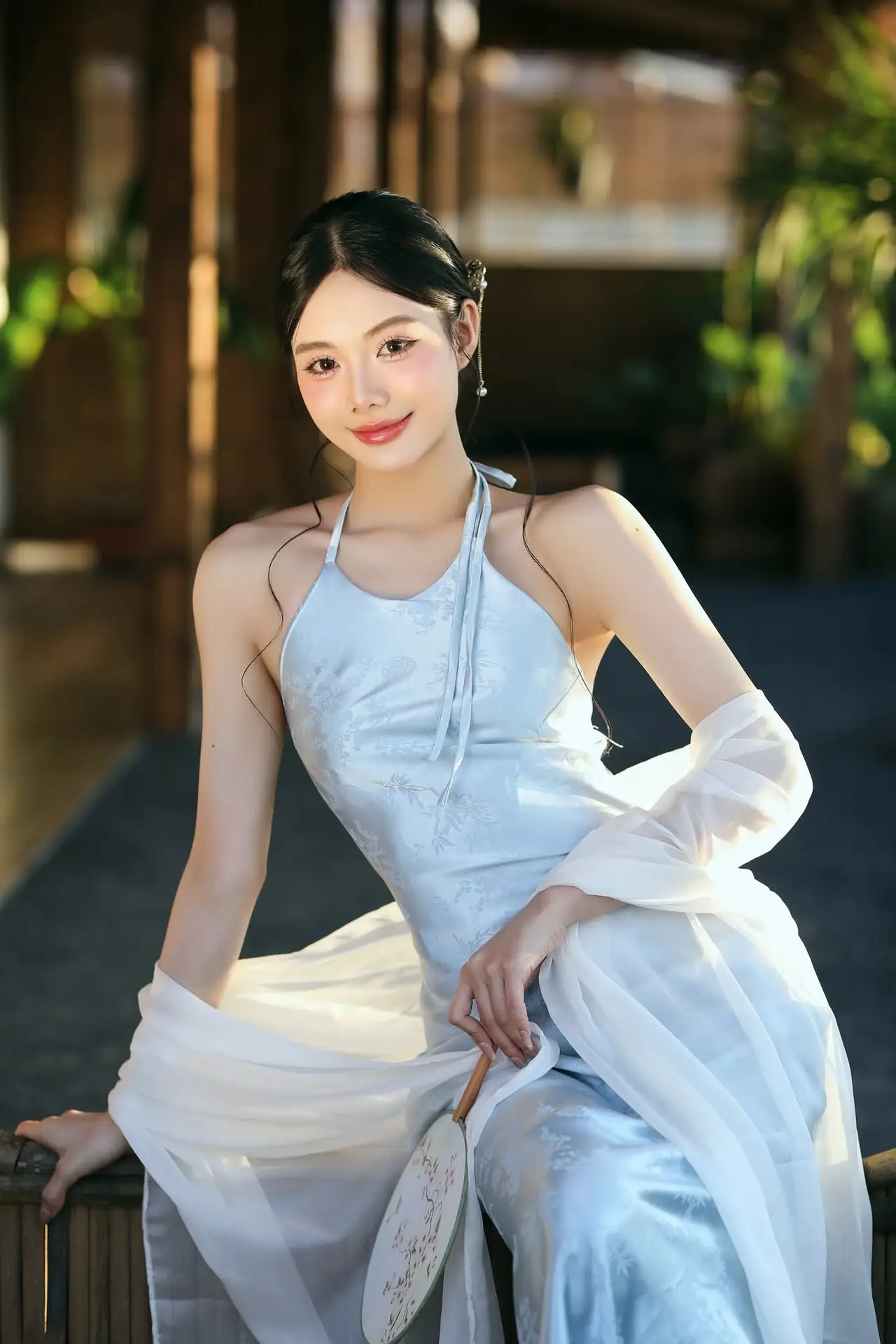 This visual masterpiece captures a moment of profound serenity and poetic beauty featuring a young woman draped in a traditional inspired ensemble that whispers stories of the past. The soft pastel pink silk adorned with delicate floral embroidery flows gracefully over layers of pristine white fabric creating a silhouette that is both ethereal and grounded. Her pensive gaze and gentle posture evoke a sense of quiet longing perfectly complemented by the muted sage green backdrop and the lush arrangement of pink blossoms. The interplay of light and shadow highlights the exquisite texture of the garments showcasing a sophisticated understanding of Vietnamese heritage fashion with a modern artistic twist. Every detail from the wisps of hair framing her face to the rustic wooden furniture contributes to a cinematic atmosphere that feels like a scene from a classic novel. It is a celebration of femininity grace and the enduring charm of cultural aesthetics in a contemporary setting that inspires any art lover.#ModernTraditional #MuseVibes #AsianAesthetics #PortraitPhotography #SilkFashion