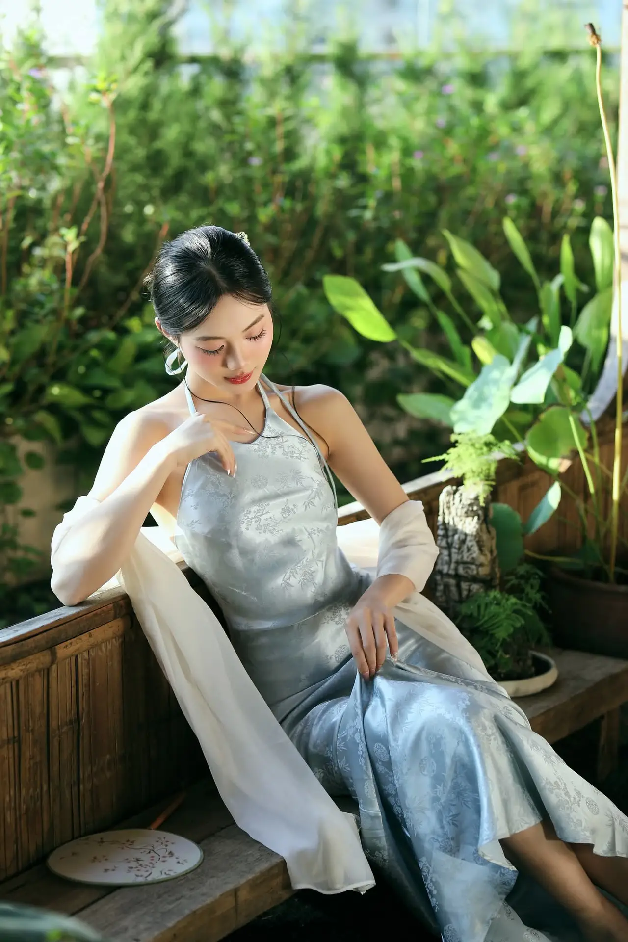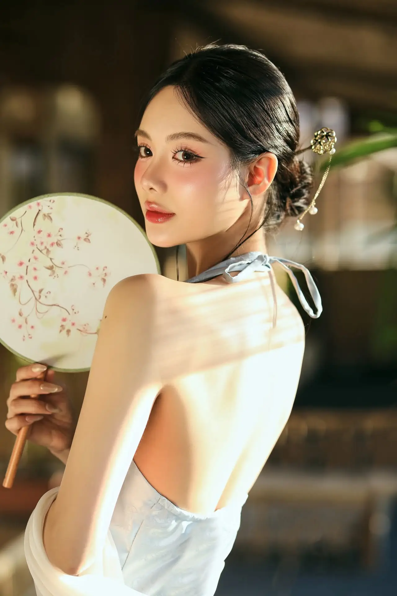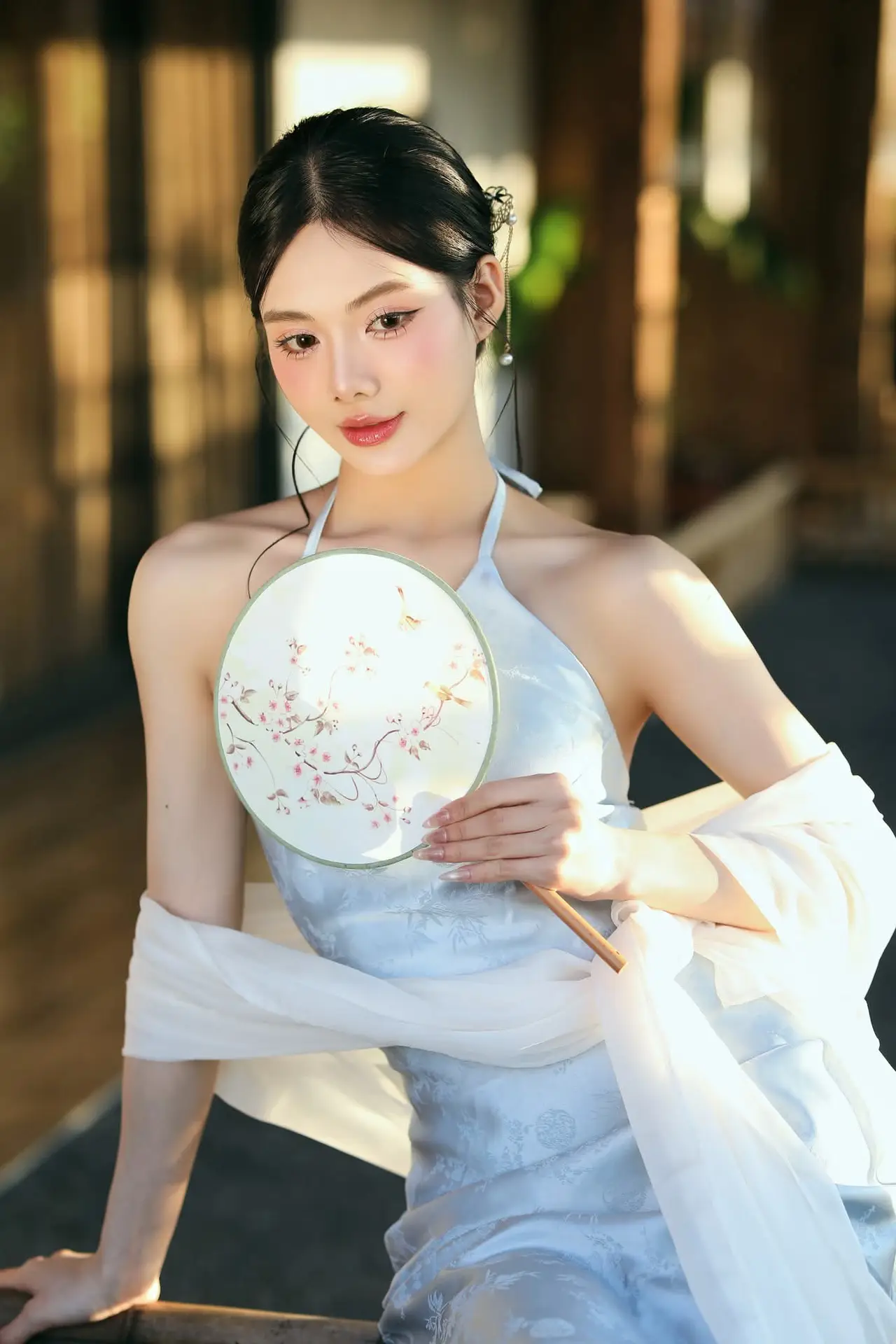 This photograph beautifully captures an East Asian girl with a delicate and graceful beauty. She wears a light, modernized traditional attire that highlights her elegant bare shoulders and refined style. Her dark hair is styled up, adorned with an exquisite hair ornament, further emphasizing a classic yet contemporary charm. Her gentle gaze carries a hint of contemplation, adding emotional depth to the image. Warm natural light streaming from the window illuminates her smooth skin and harmonious facial features. The entire scene exudes tranquility, elegance, and timeless beauty, leaving viewers captivated by the compelling aura of the subject. It is a perfect blend of tradition and modern flair.#EastAsianBeauty #ModernTraditionalWear #GracefulCharm #HairOrnament #ElegantStyle