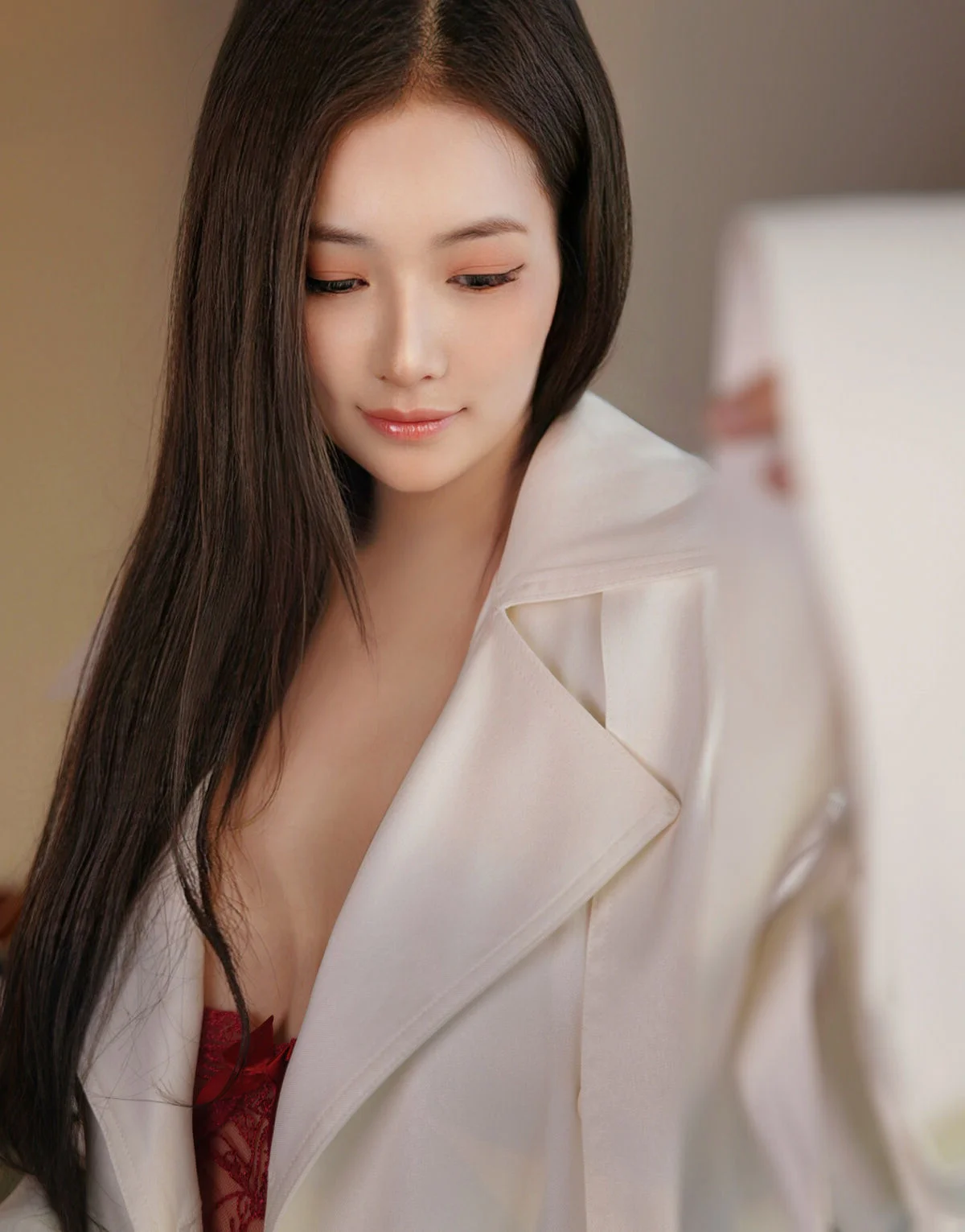 This captivating image captures model Ya Xuan ELVA in a moment of enchanting grace, elegantly clad in a pristine white trench coat. She emerges from a luxurious setting, her gaze thoughtfully cast downwards, creating an aura of sophisticated beauty mixed with an irresistible mystery. The trench coat, more than just an attire, acts as a delicate veil, subtly hinting at what lies beneath and evoking curiosity, perfectly aligning with the red temptation under the trench coat theme of the series. Every detail, from her pose to the immaculate garment, exudes refinement, highlighting her graceful figure and confident demeanor. This collection promises viewers an exploration into Ya Xuan ELVA's profound emotions and distinctive allure, exclusively presented by XiuRen. It's a photographic art piece where fashion and feeling beautifully intertwine.#YaXuan #ELVA #WhiteTrenchCoat #MysteriousBeauty #XiuRen #Model #ElegantStyle