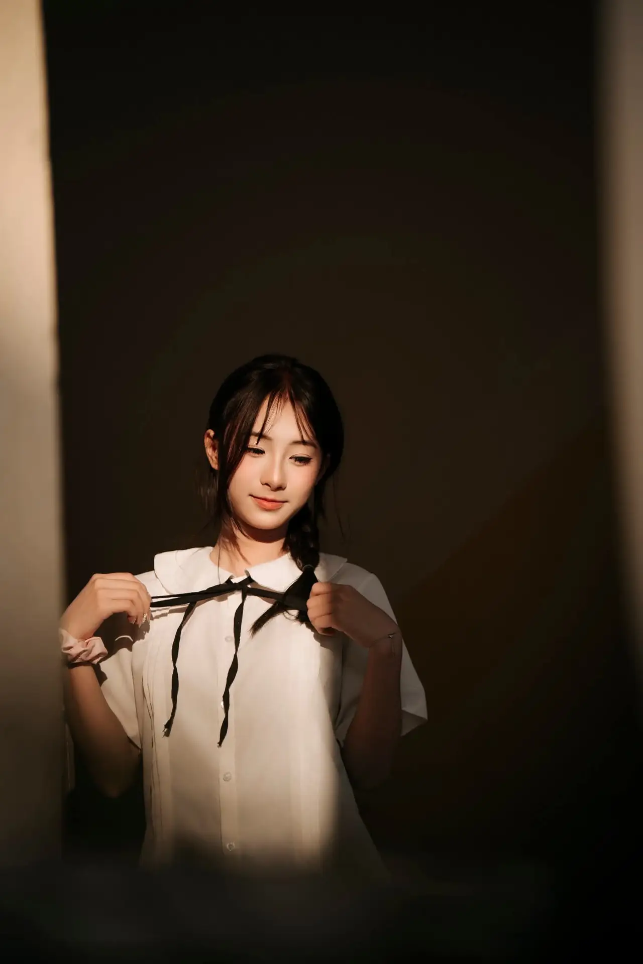 This photograph captures a poetic moment of a young woman exuding gentle and pure beauty. Warm golden sunlight delicately illuminates the delicate features on her face, creating a stunning light effect reminiscent of a sunset. With neatly braided hair and a pristine white shirt, the girl presents an elegant image with a touch of innocence. This is not just a simple portrait but also a story of serenity natural beauty and subtle emotions drawing viewers into a dreamy space. This image will surely captivate those who appreciate pure beauty and tranquil moments.#youngwoman #portraitphotography #naturallight #asianbeauty #gentleportrait #JKUniform #JK #Student