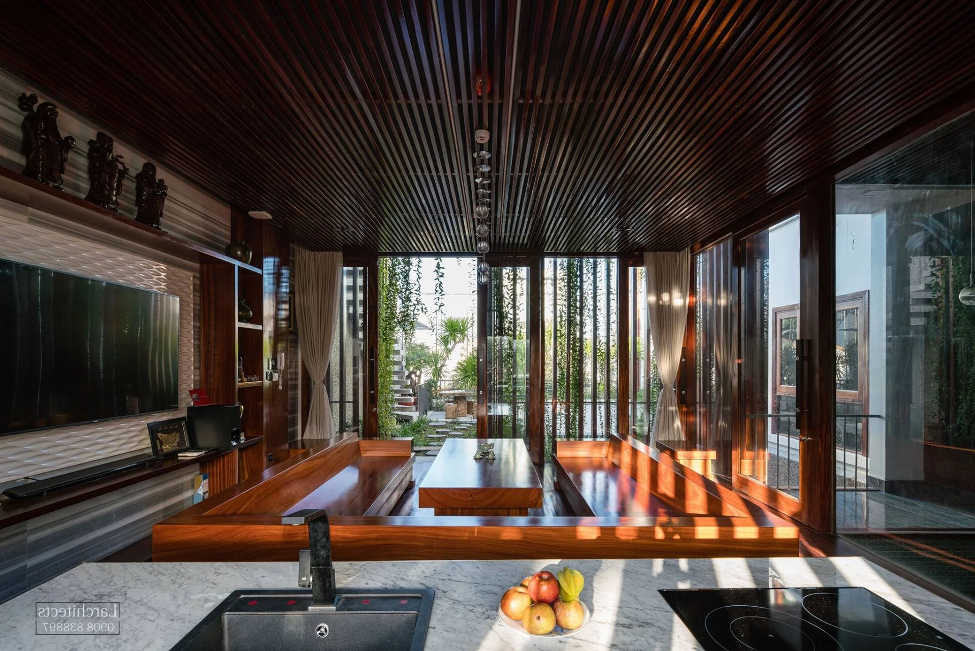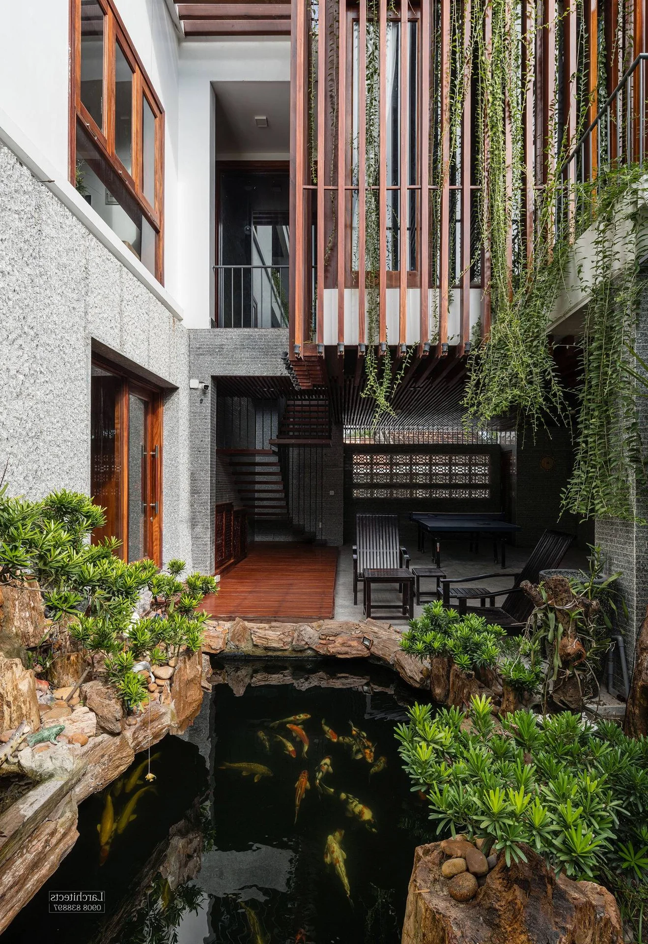Nestled in the heart of the coastal city of Nha Trang, this stunning renovation project known as Roof Gardens serves as a poetic sanctuary from the urban rush. The image captures a breathtaking view where modern architecture gracefully bows to the beauty of nature. Cascading greenery and meticulously placed wooden slats create a rhythmic play of light and shadow, casting a warm, inviting glow over the tranquil koi pond below. The atmosphere is one of profound peace, inviting a slow-living lifestyle where every breath feels like a connection to the earth. You can almost hear the gentle trickle of water and the rustle of leaves as people gather in the courtyard, their relaxed postures reflecting a deep sense of belonging. The visual palette is a sophisticated blend of raw textures and organic tones, showcasing a masterful understanding of minimalist aesthetics and tropical design. It is a testament to the homeowner’s refined taste, transforming two old houses into a living work of art that celebrates the simple joys of gardening and quiet contemplation amidst the vibrant energy of Nha Trang.#TropicalModernism #SlowLiving #InteriorDesign #NatureInspiration #ArchitecturalPhotography