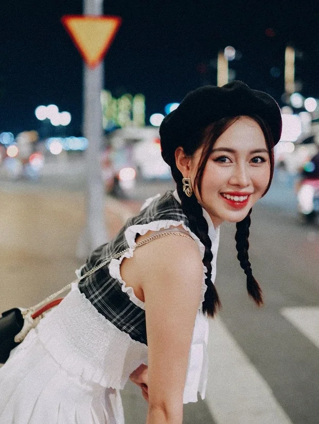 The shimmering city lights at night provide a perfect backdrop for Viet Phuong Thoa's radiant smile and vibrant energy. Embracing a playful yet chic aesthetic, she pairs a classic black beret with a stylish plaid vest and a delicate white pleated outfit that exudes a sense of youthful elegance. Her signature pigtail braids add a touch of charm, creating a look that is both approachable and fashion forward. Her expressive eyes and confident posture reflect the remarkable journey of a dedicated content creator who rose from humble beginnings to become a social media phenomenon. This visual captures more than just a street style moment it embodies her perseverance and the positive aura she shares with millions of followers. The blend of textures and the warm bokeh effect in the background create a nostalgic yet modern atmosphere, showcasing her refined taste in fashion and visual storytelling. It is a beautiful testament to how creativity and authenticity can transform a simple moment into a work of art that resonates with the soul of a modern traveler and fashion enthusiast.