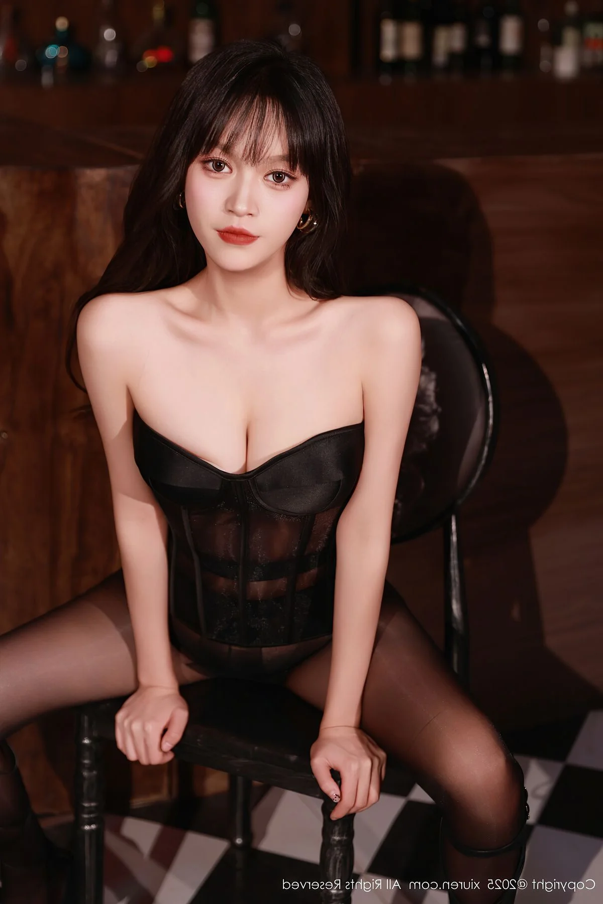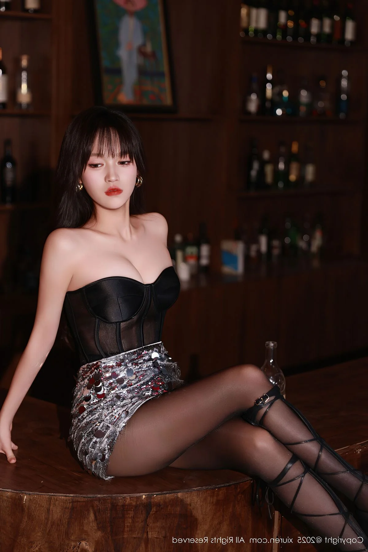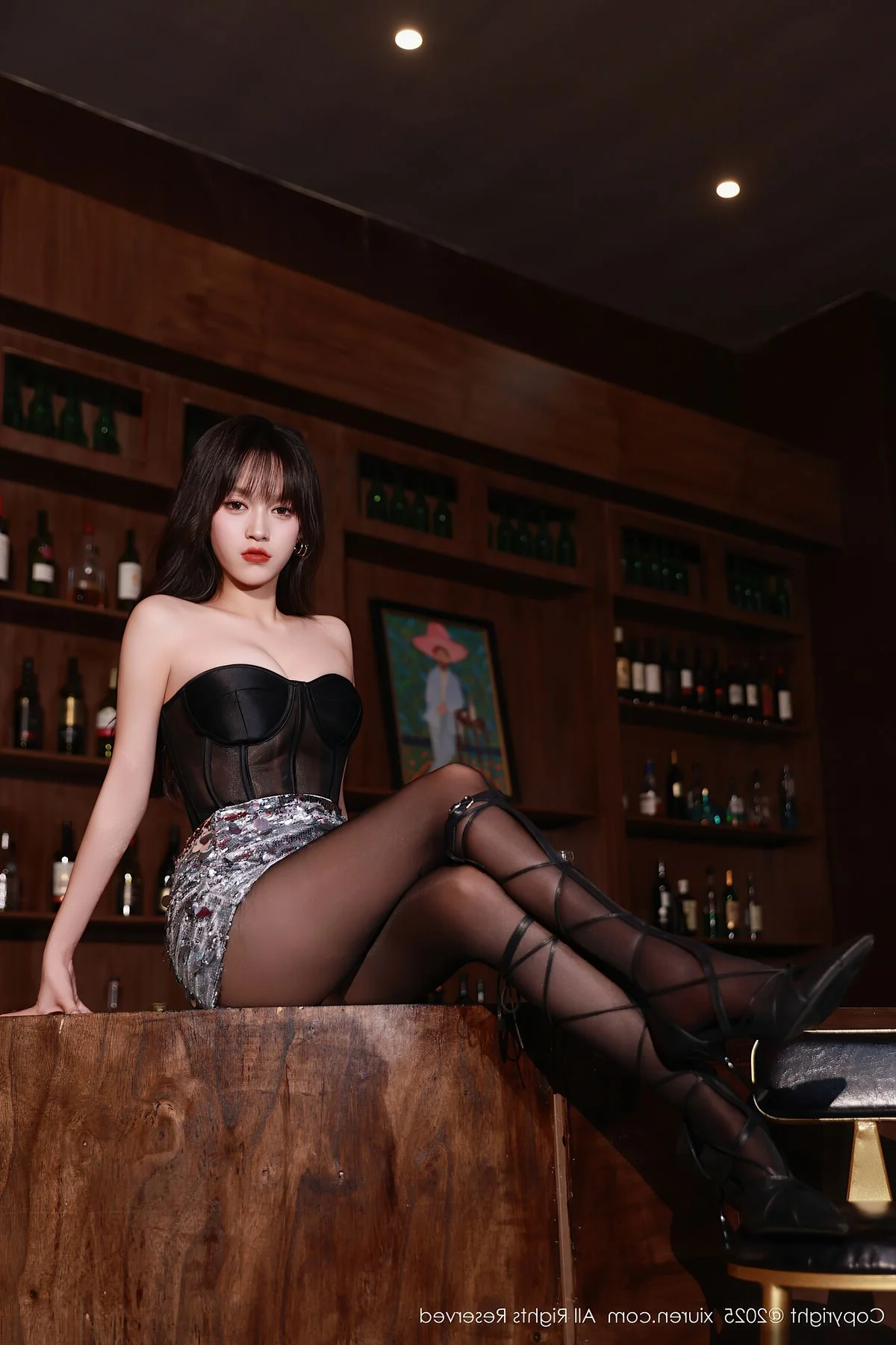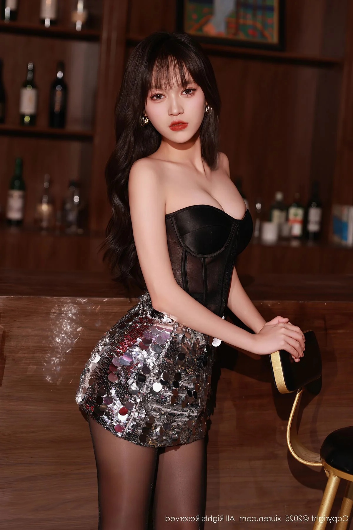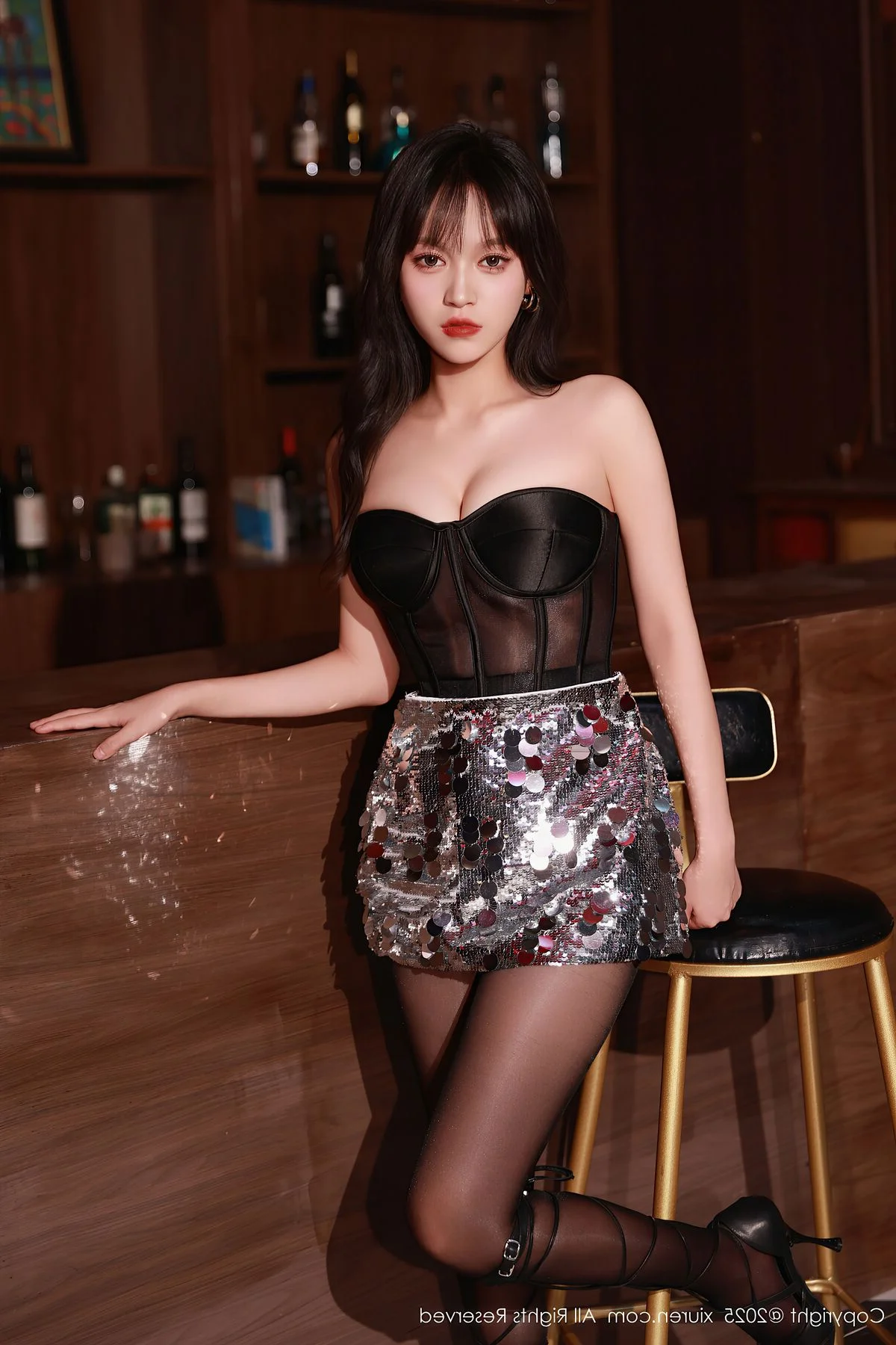 The XiuRen No.10772 collection presents Nuo Mi in an absolutely captivating light. Within the sophisticated ambiance of a dimly lit bar, Nuo Mi radiates confidence and allure. She wears a chic black strapless top paired with a dazzling sequined skirt, crafting a stylish and modern ensemble. Her sheer black stockings, intricately laced, and elegant high heels gracefully highlight her long, statuesque legs. Each pose and direct gaze from Nuo Mi conveys a compelling charm, making this photoshoot a truly artistic and emotionally rich experience that defines her unique style.#NuoMi #XiuRen #NightFashion #AlluringStyle #AsianModel #BlackStockings