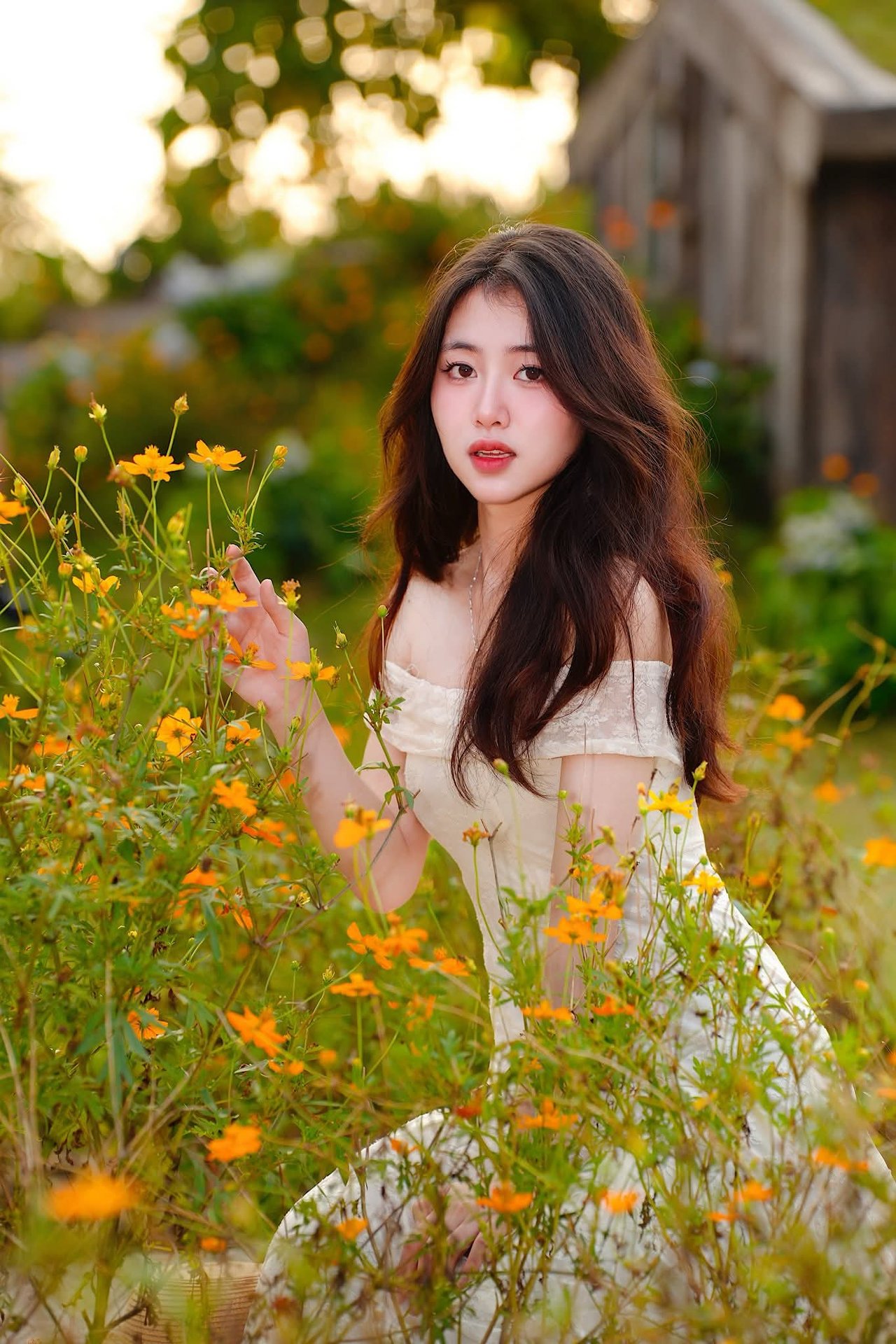 This image XVG No.2 captures the gentle and ethereal beauty of a Vietnamese girl amidst a space overflowing with vibrant flowers. She sits gracefully on a simple wooden chair in a pristine white off-shoulder dress with her long dark hair softly cascading. Her gaze is distant conveying a dreamy and peaceful aura as she delicately holds a small yellow flower. Surrounding her is a lush green landscape adorned with tiny orange and yellow blossoms creating a romantic and lively natural setting. This scene not only celebrates the traditional charm of Vietnamese women but also evokes a profound harmony between humanity and nature a truly captivating moment of tranquility.Captivating Modern Ao Dai - Unique Design Showcasing Elegant Vietnamese Beauty