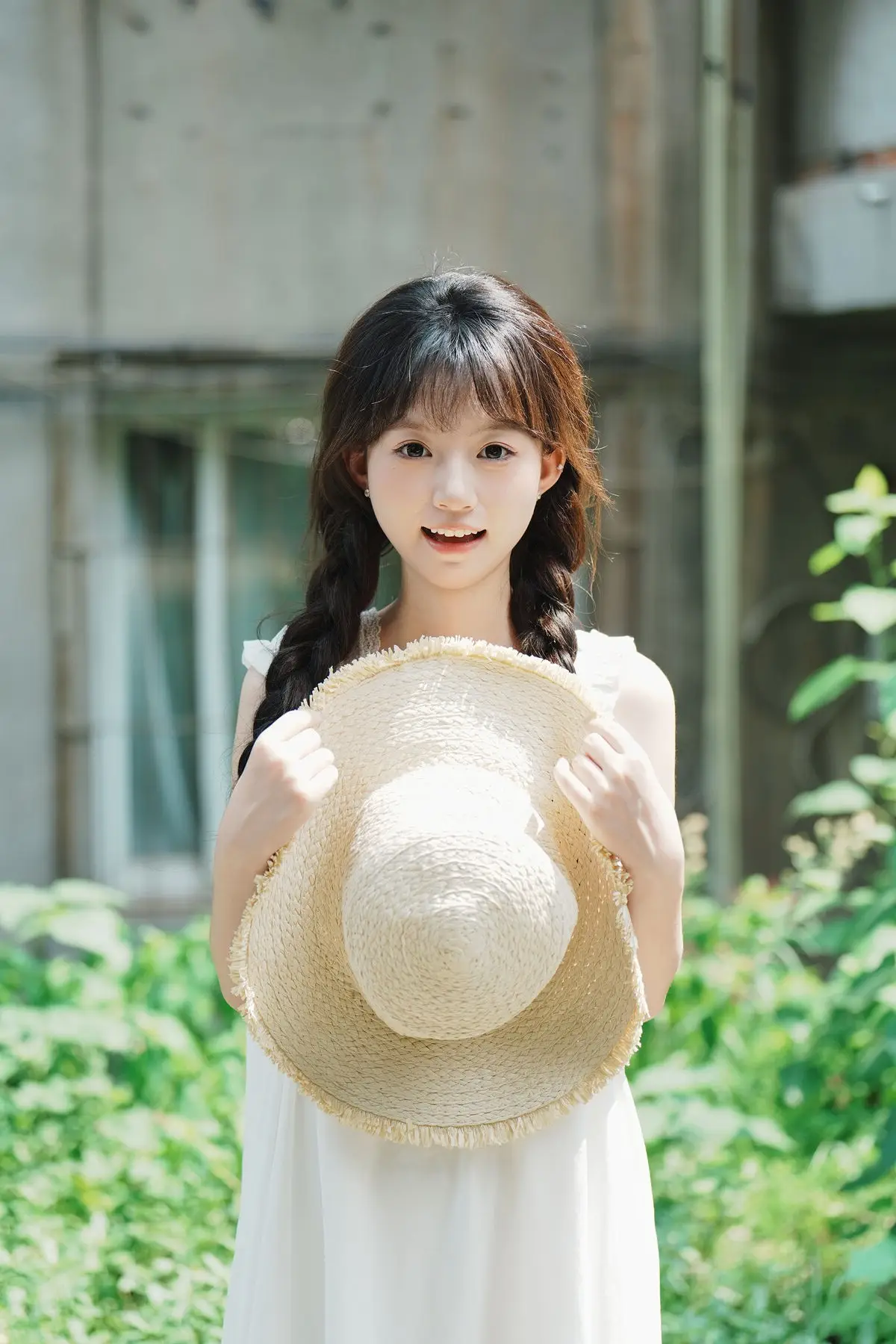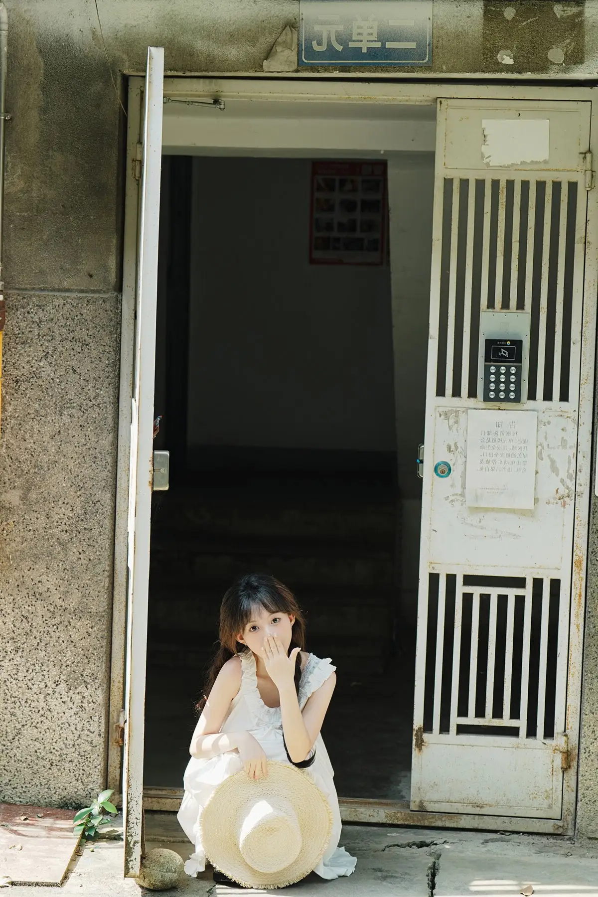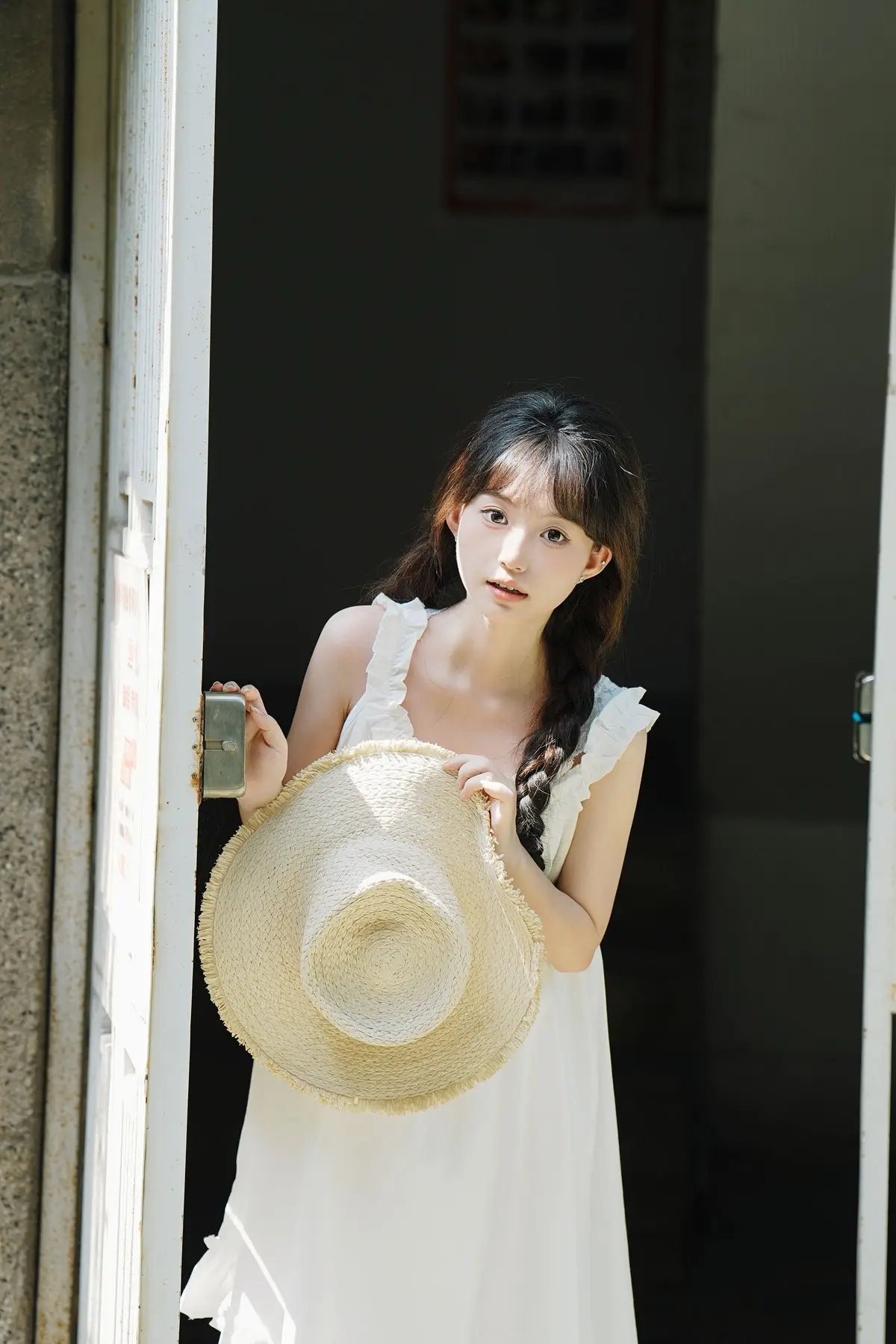 This image captures a serene moment of Qi E Luo Bo Guai a model featured in the YiTuYu Vol.8726 collection She stands gracefully within an ancient doorway bathed in soft morning light that embraces her figure in a pristine white dress The rustic straw hat and her gentle gaze create a pure nostalgic beauty evoking memories of tranquil summer days The simple yet vibrant scenery of an old community is beautifully portrayed through this muses image It tells a story of peace and natural charm unpretentious yet captivating