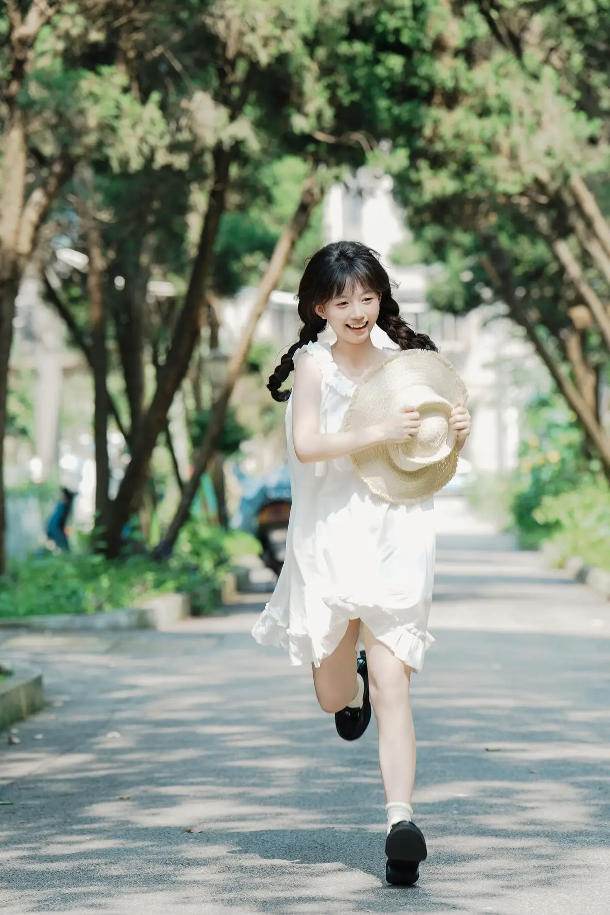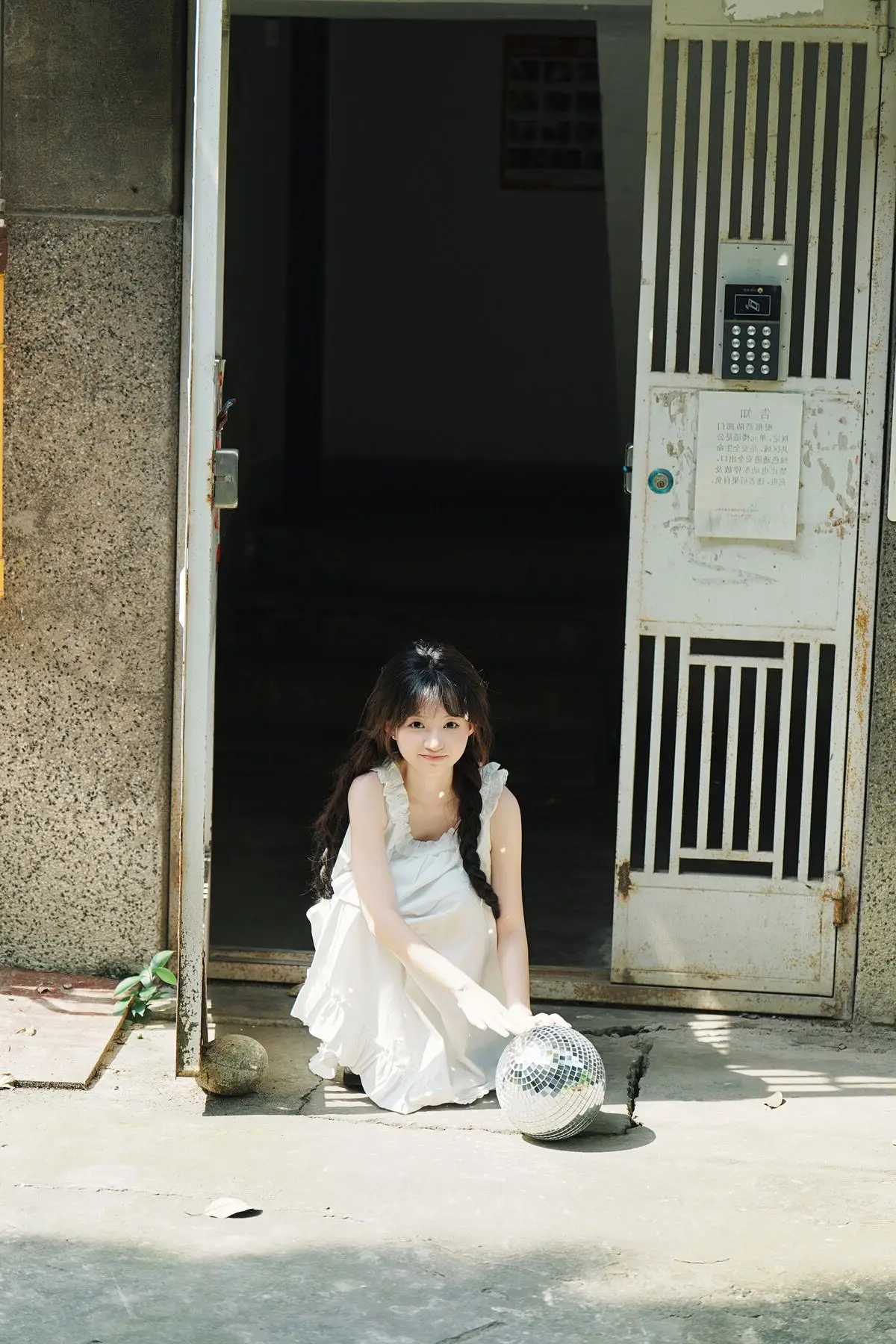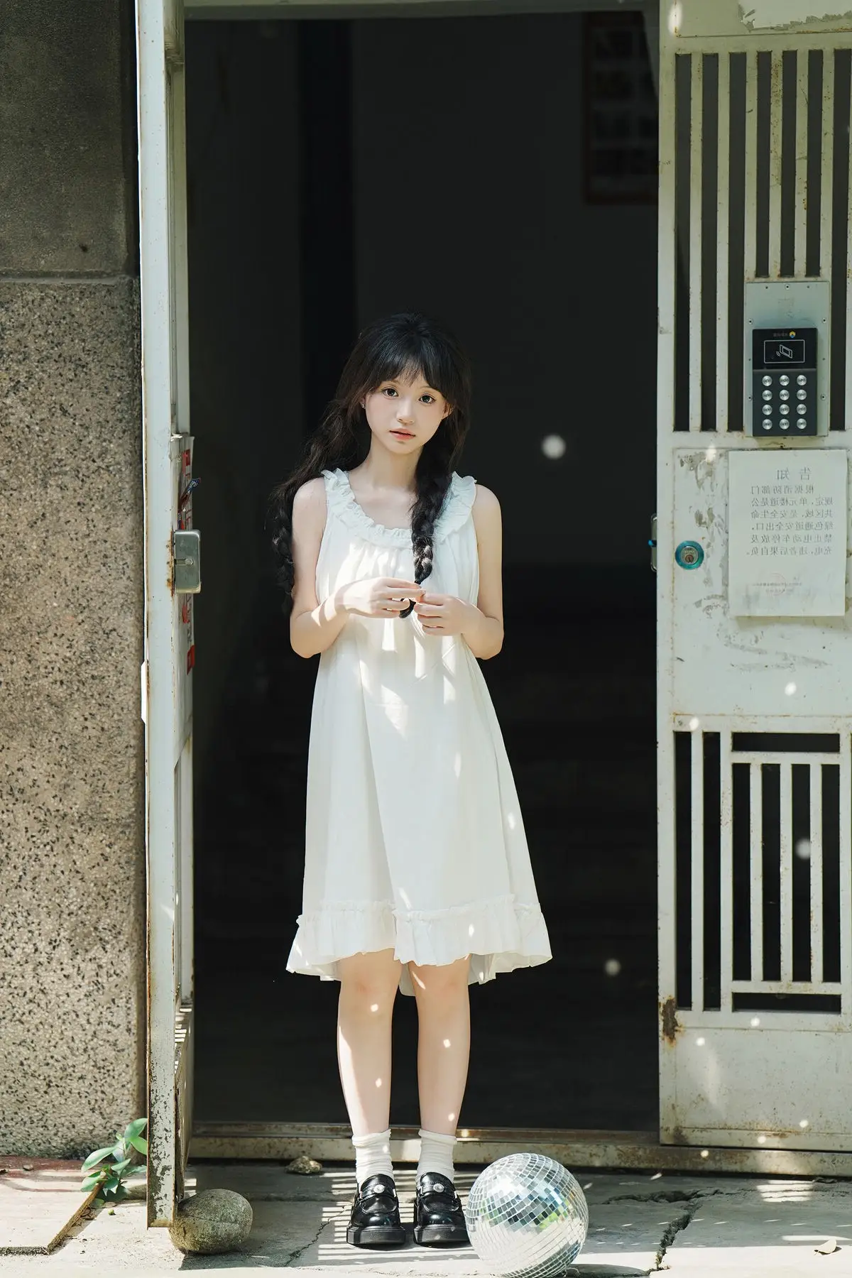 This image captures a serene moment of Qi E Luo Bo Guai a model featured in the YiTuYu Vol.8726 collection She stands gracefully within an ancient doorway bathed in soft morning light that embraces her figure in a pristine white dress The rustic straw hat and her gentle gaze create a pure nostalgic beauty evoking memories of tranquil summer days The simple yet vibrant scenery of an old community is beautifully portrayed through this muses image It tells a story of peace and natural charm unpretentious yet captivating