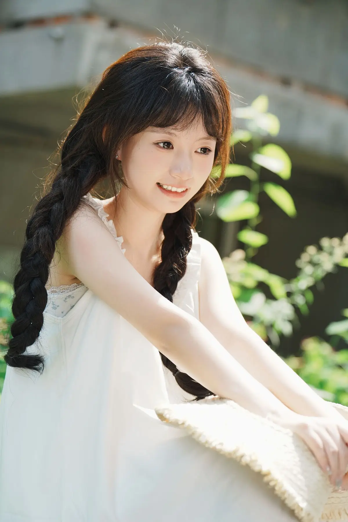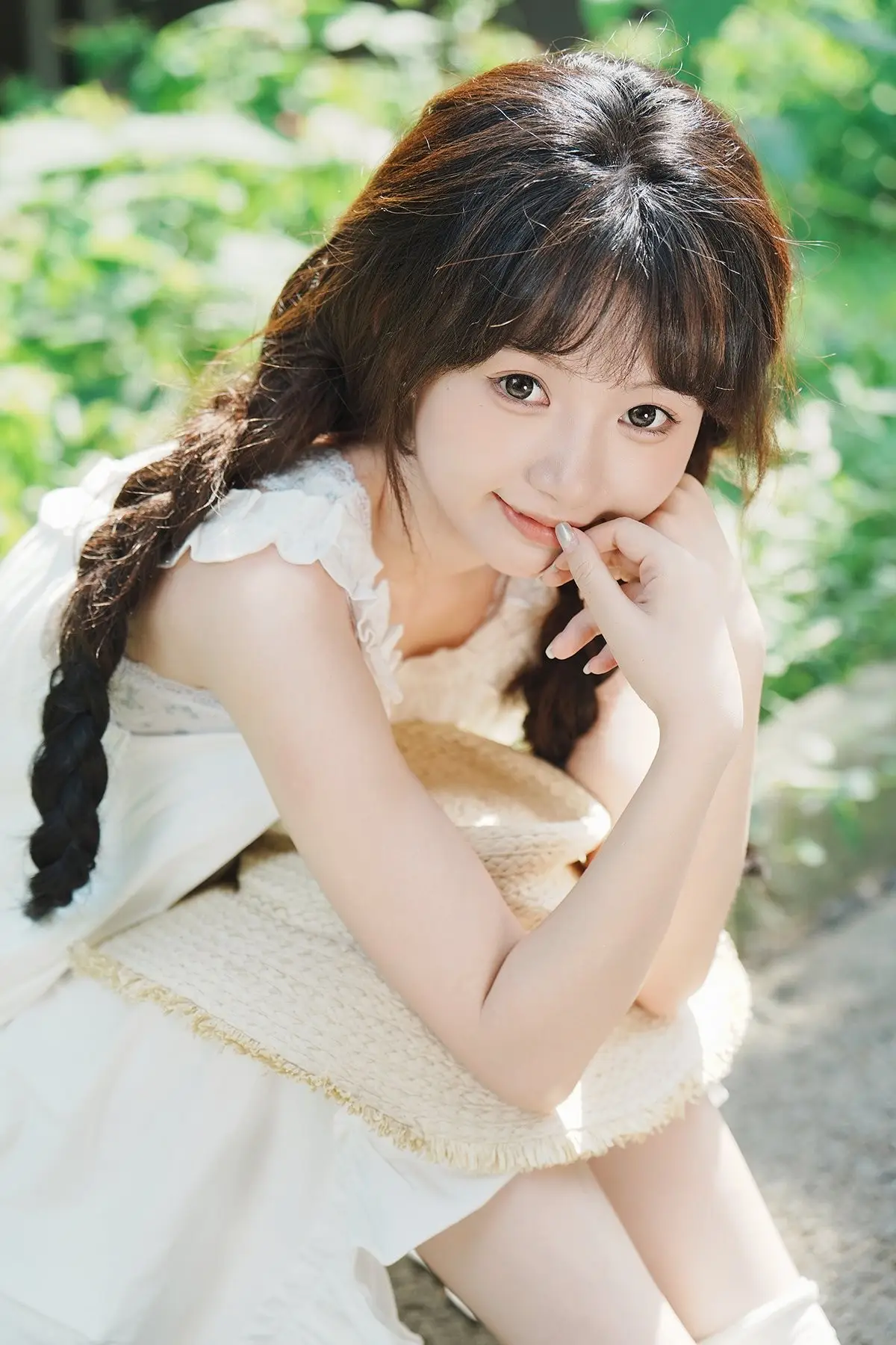 In the YiTuYu Vol.8827 collection model Jia Yi emerges as an otherworldly muse exuding pure and captivating beauty. She dons a flowing ivory-white dress its soft silk fabric embracing her figure creating an ethereal and refined elegance. Gentle light cleverly illuminates her highlighting her fair skin and dreamy aura. Every detail in the photograph speaks of meticulous artistry from her lustrous dark hair to her deep alluring gaze. The surrounding lush green foliage further enhances her natural charm allowing viewers to perceive a perfect harmony between art and humanity a tranquil moment filled with emotion.