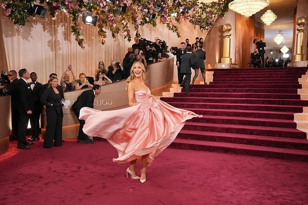 Jennifer Lawrence graced the Golden Globes red carpet with an enchanting presence, looking like a muse straight out of a fairy tale garden. Her gown, featuring delicate sheer fabric and intricate floral embroidery, perfectly balances modern allure with classic romanticism. The soft, neutral tones and ethereal texture highlight her sophisticated aura and timeless elegance, making her stand out as a true vision of grace. With her signature blonde hair styled with a youthful fringe and a soft makeup look, she exudes a sense of effortless glamour that has become her hallmark. This look is more than just a fashion choice, it is a statement of refined taste and artistic expression that resonates with the soul of high fashion. Every detail, from the subtle jewelry to her confident yet gentle gaze, contributes to a visual masterpiece that captures the essence of cinematic magic. It is a moment where style meets emotion, leaving an indelible mark on the history of red carpet excellence.
