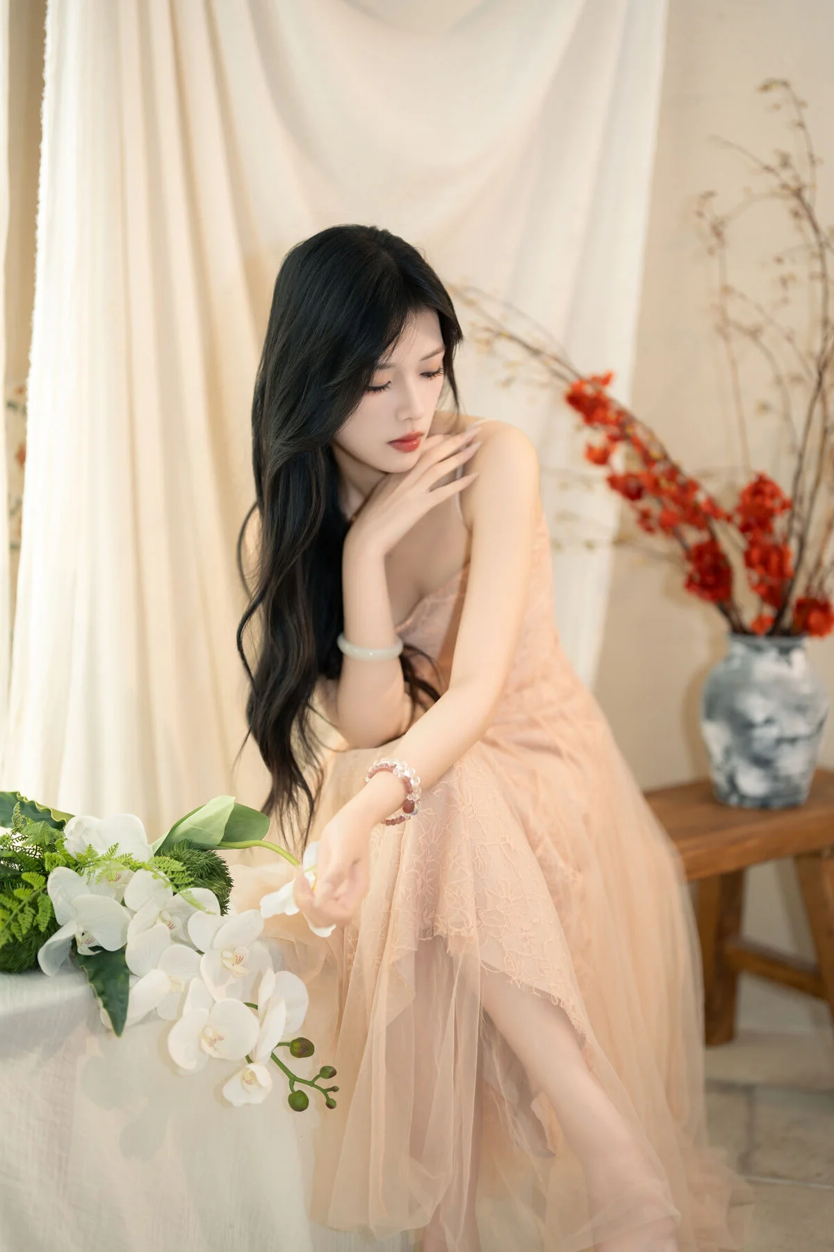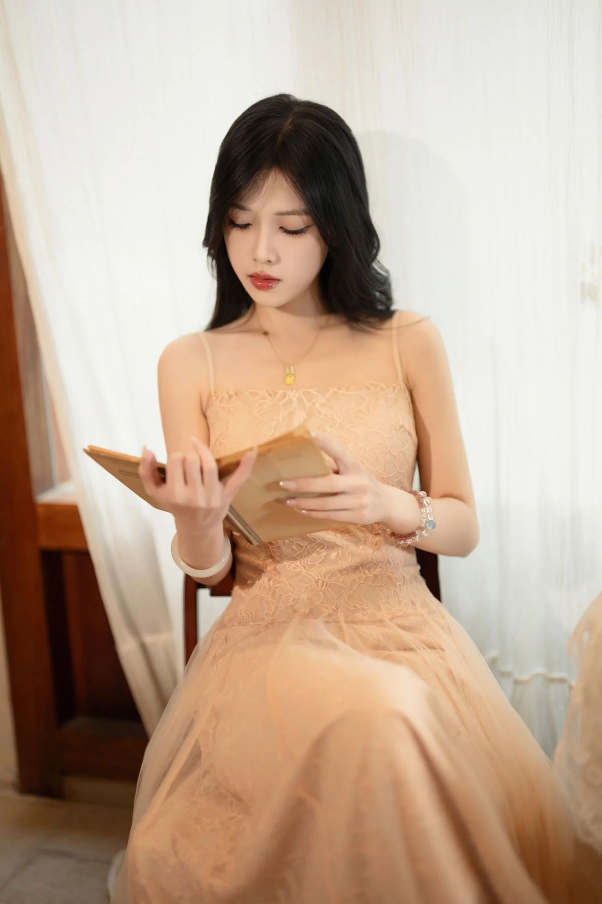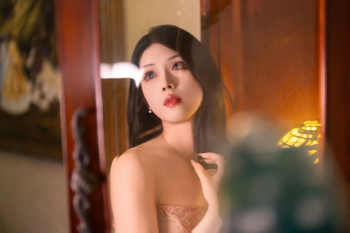 From a technical perspective, the photography utilizes soft-focus lighting to enhance the textures of the lace and the natural glow of the model. The color palette—a sophisticated blend of blush pinks and neutral undertones—evokes a sense of serenity and high-fashion sensibility. For creators, designers, and photography enthusiasts, this volume serves as a profound source of inspiration for mood-boarding and artistic direction. It is a celebration of the 'Art Language' philosophy, where every frame is a silent dialogue between the subject and the lens, capturing a moment of pure, unadulterated beauty.
