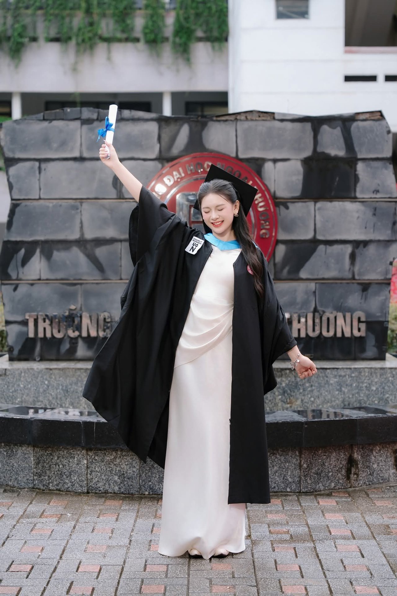 This photo captures a proud moment of a female student on her graduation day. Dressed in a dignified graduation gown and a cap symbolizing knowledge the young woman radiates beauty and immense joy. Her bright smile along with the vibrant pink rose bouquet beside her further highlights the happiness of completing her academic journey at Can Tho University. This is not only a significant milestone marking the end of one chapter but also the beginning of a wide-open future promising many new successes. This moment stands as a testament to the continuous effort and thirst for knowledge of the young generation.