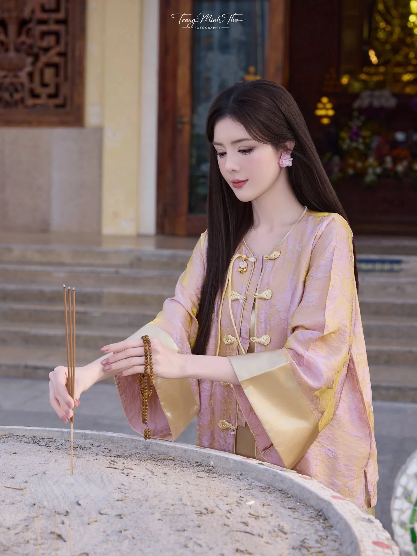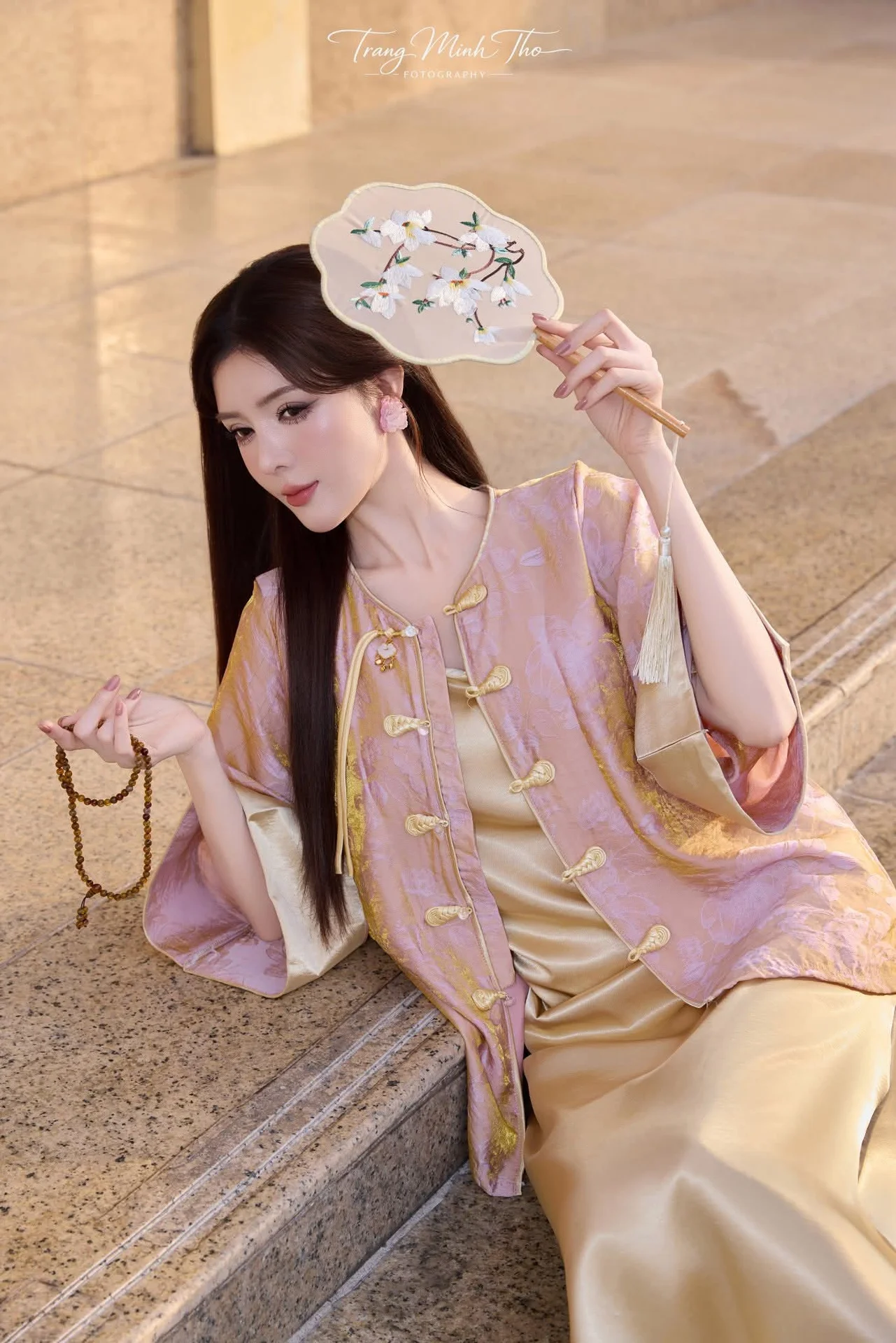 This visual masterpiece captures the essence of classic Vietnamese femininity through a lens of soft nostalgia and poetic grace. The subject exudes a serene and sophisticated aura, her gentle gaze and poised body language reflecting a deep sense of inner beauty. She is adorned in a stunning pink silk gown, reminiscent of the traditional Ao Ngu Than, featuring delicate patterns that shimmer beautifully under the warm indoor lighting. The choice of premium fabric and the vibrant yet soft palette highlight a refined taste in heritage fashion, perfectly complemented by a handcrafted sandalwood fan. Every detail, from the neatly styled hair to the vintage wooden backdrop filled with antique ceramics 1000029563.jpg, tells a story of cultural pride and timeless elegance. The overall mood is one of quiet contemplation and artistic beauty, inviting the viewer to appreciate the intricate craftsmanship of the past. It is a beautiful fusion of fashion and art, where every element works in harmony to celebrate the enduring charm of the Vietnamese soul and its aesthetic legacy in a modern world.#TimelessBeauty #VietnameseCulture #SilkFashion #ClassicStyle #ArtisticPhotography