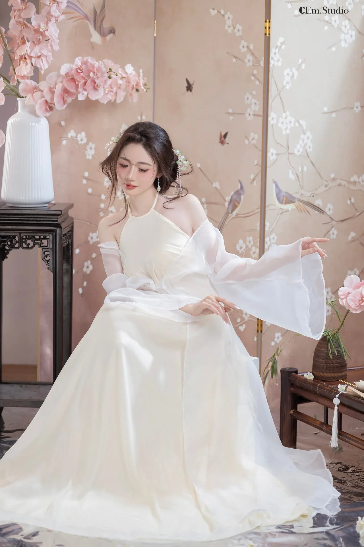 This image captures a moment of pure serenity, reminiscent of a poetic scene from a nostalgic film. The muse, with her gentle downward gaze and delicate posture, exudes an aura of grace and timeless elegance while posing beside bamboo and blooming orchids. Her outfit is a masterful blend of tradition and modernity, featuring a stylized halter top paired with a sheer silk outer robe. The soft, translucent fabric in pristine white beautifully complements her radiance, creating a look that is both modest and subtly alluring. This fashion choice reflects a sophisticated aesthetic, celebrating the fluid beauty of silk and the intricate details of Oriental style. Every element, from the classic updo adorned with a traditional hairpin to the warm, soft lighting, contributes to an artistic atmosphere that feels like a living painting. It is an inspiring visual journey that honors femininity and the enduring charm of cultural heritage in a contemporary light.#EtherealBeauty #OrientalStyle #VietnameseVibe #SilkFashion #ClassicElegance
