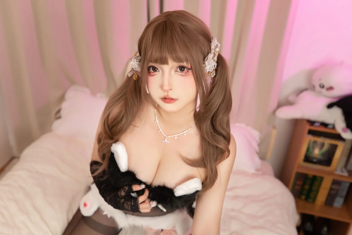 Coser Kagurazaka Mafuyu captivates with her enchanting portrayal of a sweet cat girl, radiating both innocence and allure. Her playful twin tails perfectly complement the form-fitting silk stockings that elegantly highlight her figure. Posing gracefully on a soft bed bathed in a gentle pink glow, Kagurazaka Mafuyu’s clear gaze and subtle smile evoke a dreamy and romantic atmosphere. This meticulously crafted cosplay showcases not only the intricate details of her costume but also her remarkable ability to embody the character’s adorable charm, leaving a lasting impression on admirers and fans alike.#Coser #Kagurazaka #Mafuyu #CatGirlCosplay #TwinTails #SilkStockings