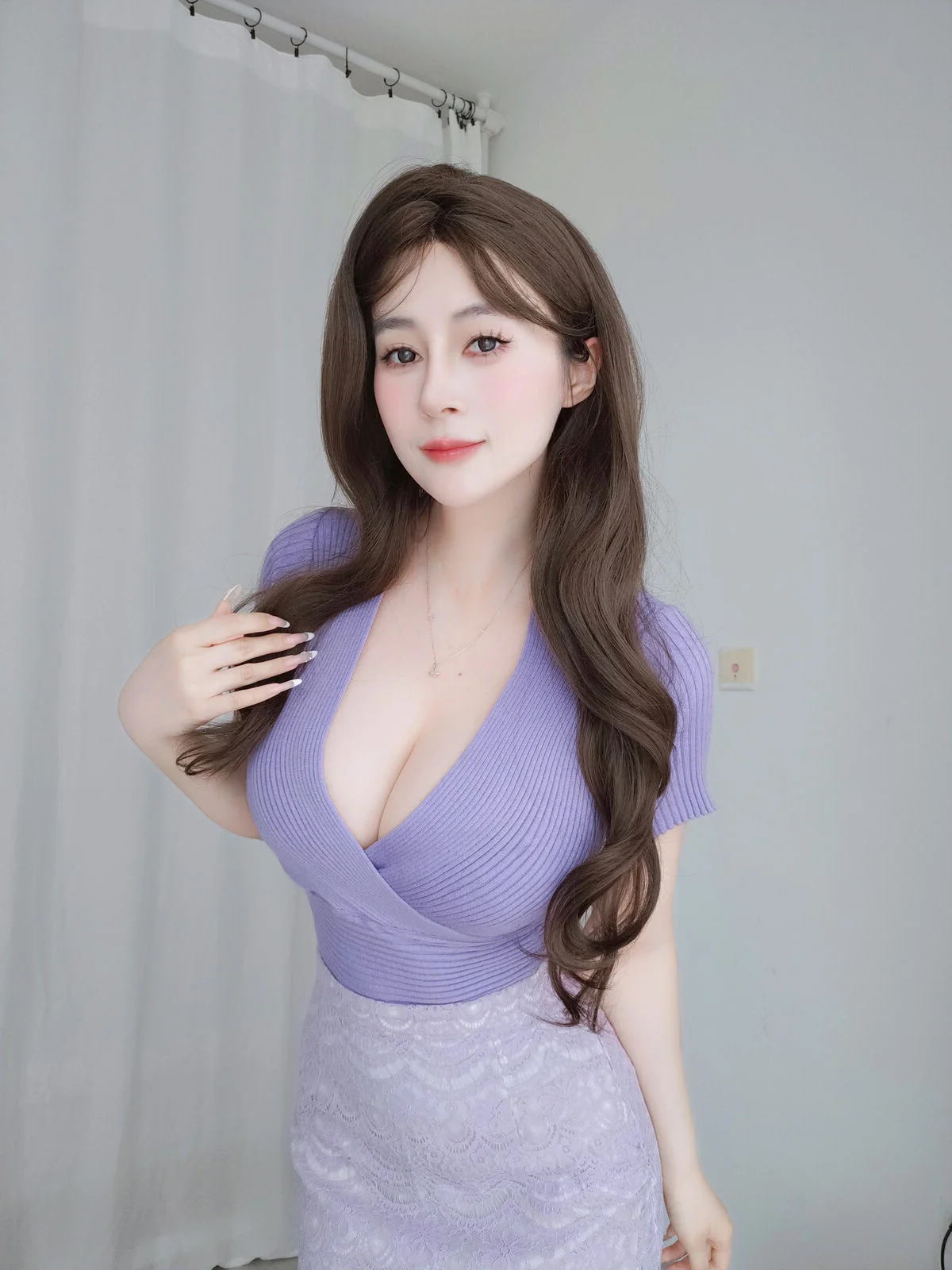 Stepping into a world of soft hues and poetic grace, Coser BaiYin81 captivates the lens in her latest Fantia 2024.10 collection. The ensemble features a harmonious blend of purple tones, combining a fitted V-neck top with an intricately patterned skirt that exudes a sense of modern elegance and feminine charm. The minimalist backdrop allows her natural beauty and expressive gaze to take center stage, creating an atmosphere of quiet sophistication and artistic depth. Every detail, from the texture of the fabric to the gentle curve of her posture, reflects a high sense of aesthetic taste and visual harmony. This visual story is a celebration of femininity and the timeless appeal of lavender shades, evoking feelings of serenity and understated luxury. It serves as a perfect inspiration for those who appreciate minimalist yet impactful fashion photography where emotion and style intertwine seamlessly in a dreamlike setting.#SoftAesthetics #BaiYin81 #MinimalistFashion #PurpleStyle #VisualArt