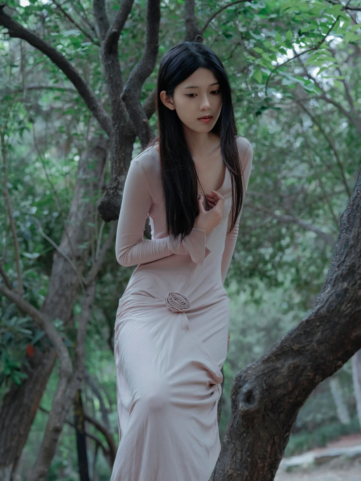 Amidst the tranquil whispers of the forest, Yu Qing Feng embodies the essence of a modern day dryad in this YiTuYu Vol.9000 collection. Dressed in a floor length gown of dusty rose, the soft fabric clings gracefully to her silhouette, reflecting a refined sense of minimalist fashion. The subtle rosette detail at her waist adds a touch of romanticism to the natural backdrop. Her pensive expression and downward gaze evoke a sense of poetic melancholy, perfectly capturing the Art Language theme. The interplay between the vibrant greenery and the delicate pink of her attire creates a visual harmony that celebrates the vitality of spring. This aesthetic journey is more than just a photoshoot, it is an exploration of visual storytelling where lighting and mood converge to create a serene, dreamlike atmosphere. Her effortless style and the organic textures of the woods invite us into a world of quiet beauty and artistic inspiration.#YuQingFeng #YiTuYu #ArtLanguage #ForestCore #SoftAesthetic #PortraitPhotography #SpringVitality