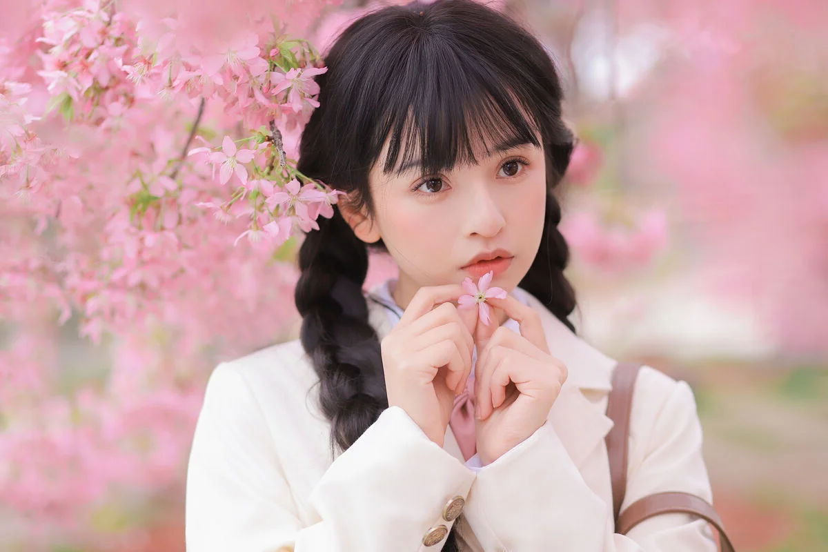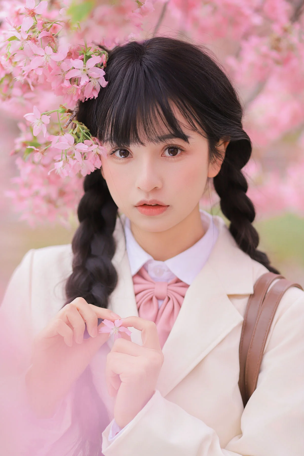 Capturing the essence of a fleeting spring morning, this image transports us to a world of soft pastels and youthful nostalgia. The girl, dressed in a classic JK school uniform, embodies a timeless elegance that perfectly complements the blooming cherry blossoms overhead. Her white blazer and pleated lavender skirt create a refreshing palette, reflecting a sophisticated yet innocent fashion sense that is highly popular in contemporary Asian street style. The choice of braided hair adds a touch of playfulness to her serene expression, making the overall vibe feel like a scene from a romantic coming of age movie. The composition, with the soft pink railing and the blurred floral background, emphasizes a minimalist yet emotional aesthetic. Every detail, from the texture of her outfit to the gentle lighting, is carefully curated to evoke a sense of peace and wonder. It is a beautiful celebration of natural beauty and the artistic language of fashion, where the environment and the subject blend into a single, poetic moment of tranquility.#SpringAesthetic #SchoolgirlStyle #JKUniform #PortraitPhotography #SoftGirlVibes #JK