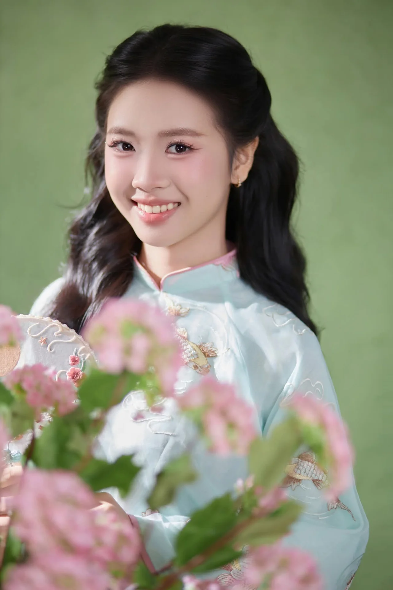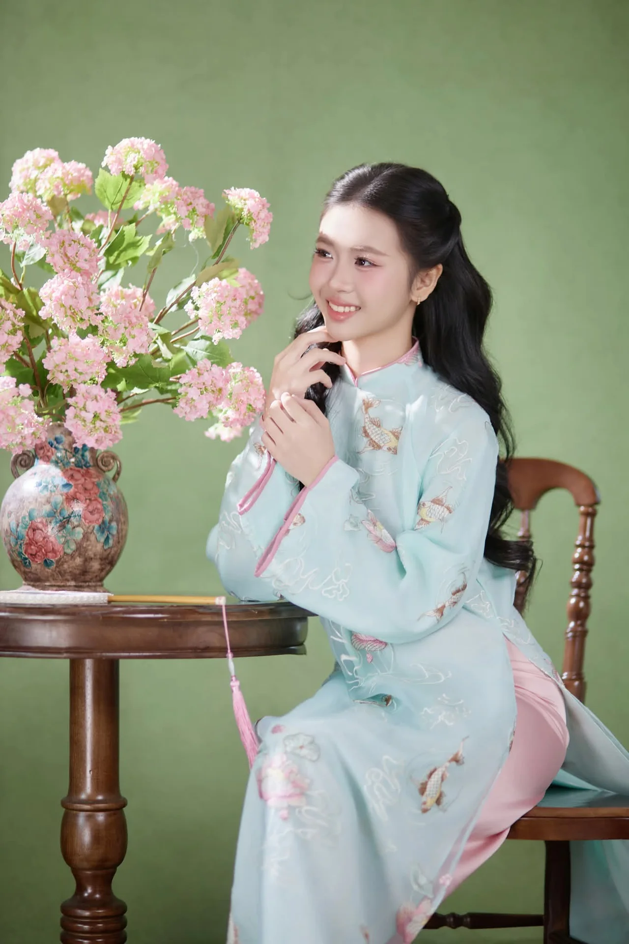 This portrait captures a moment of pure grace and poetic beauty, where the young woman's sparkling eyes and radiant smile steal the spotlight. Dressed in a traditional inspired outfit with a soft pastel blue hue, the delicate fabric and intricate embroidery evoke the timeless charm of a classic muse. The harmonious blend of the cool blue attire and the sweet pink blossoms in the foreground creates a vibrant palette that feels like a breath of fresh spring air. Her confident yet gentle expression, paired with naturally flowing dark hair, achieves a perfect balance between vintage aesthetics and modern elegance. It is more than just a photograph; it is a celebration of refined taste and visual storytelling, where fashion meets emotion to portray a soul that is both peaceful and profoundly beautiful. The soft green backdrop further enhances the ethereal mood of this artistic capture.#VietnameseBeauty #TraditionalChic #SpringAesthetics #PortraitPhotography #ElegantStyle