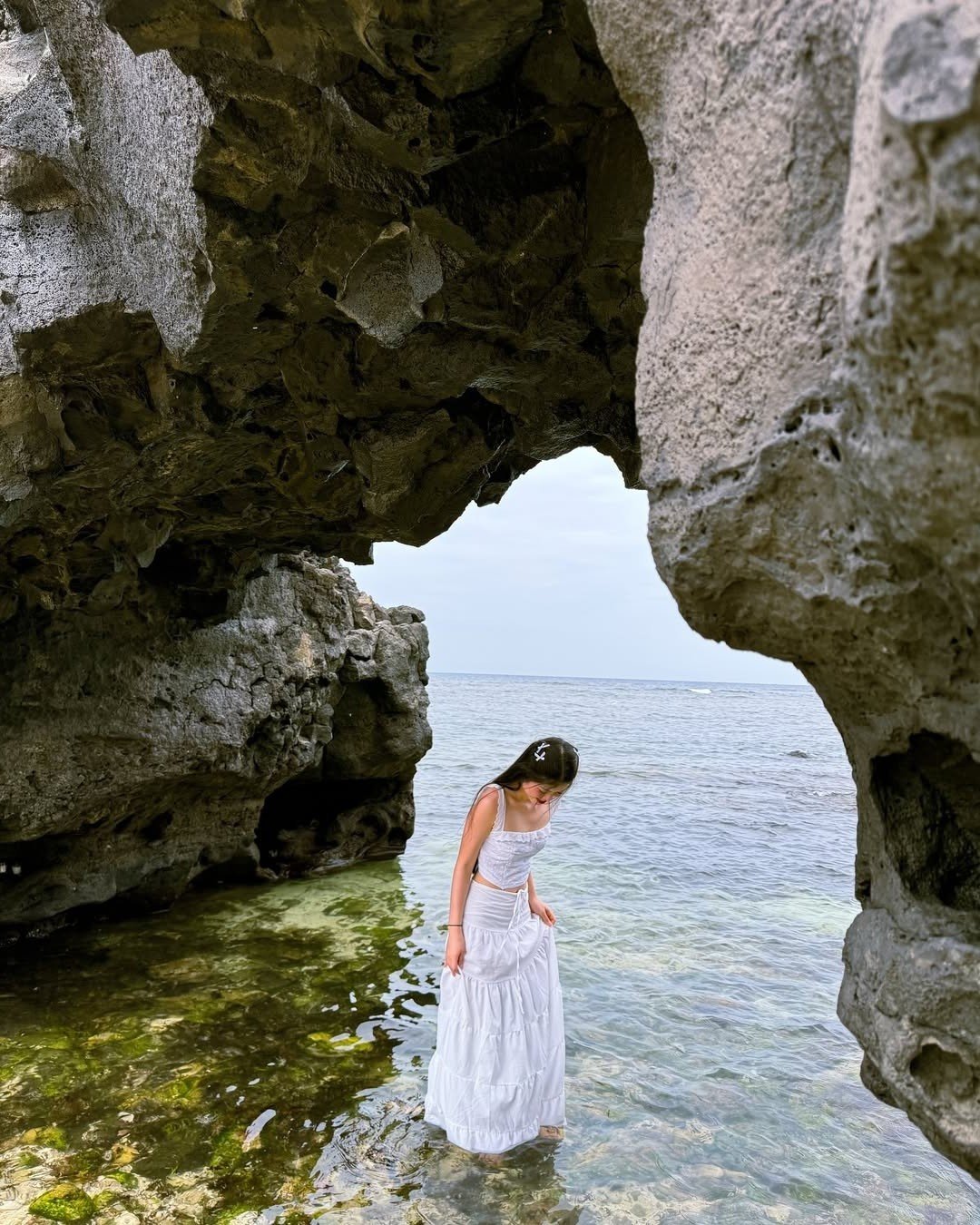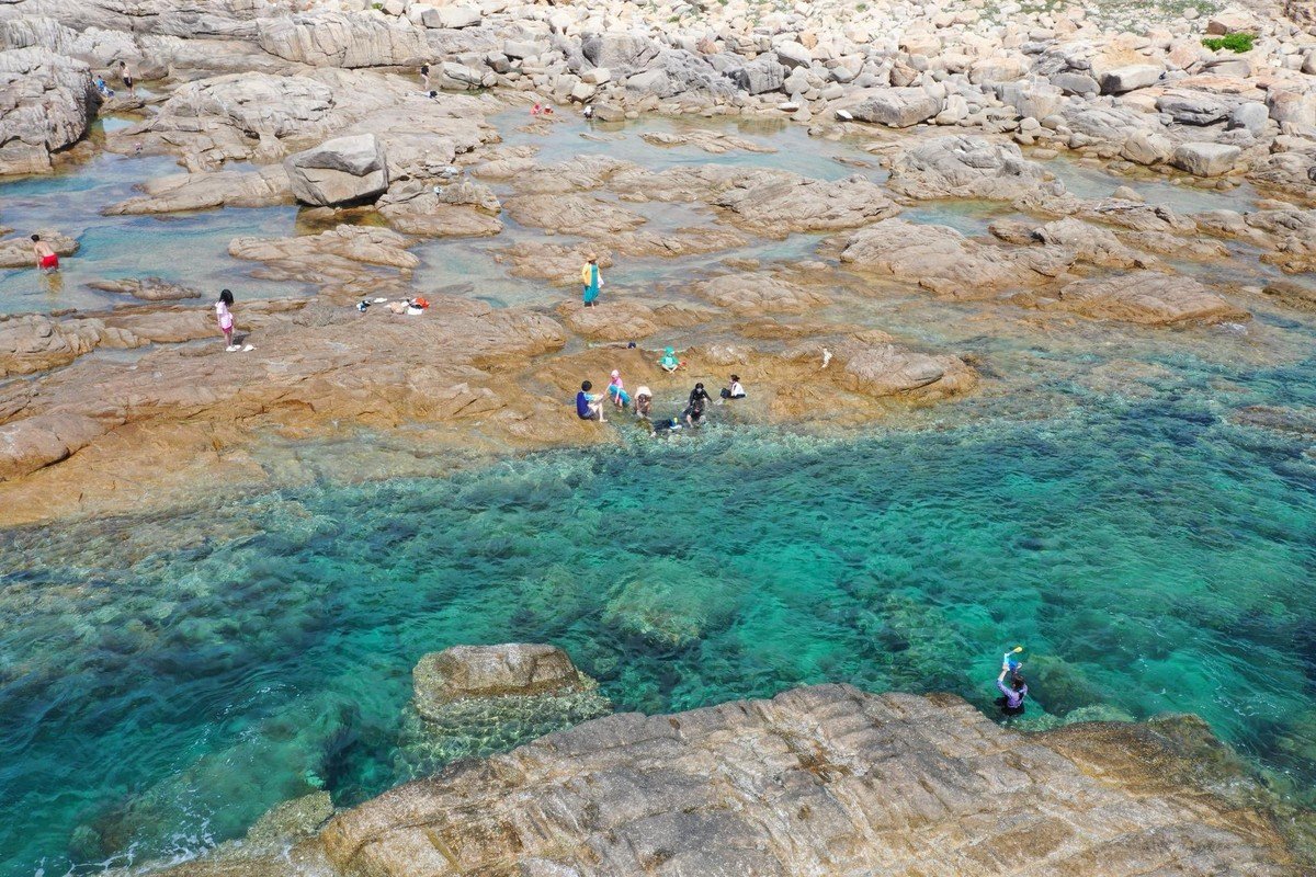 The photo reveals a majestic natural landscape at a coastal rocky outcrop where crystal clear blue water embraces natural rock formations This is an ideal location to explore wild beauty and capture unique virtual living moments The exposed rocky cliffs with diverse shapes create an impressive scenic painting inviting visitors to immerse themselves in the peaceful ambiance of the sea The water is so clear that you can see the rocks beneath the surface offering a sense of tranquility and coolness An unmissable destination for nature lovers seeking unique photo opportunities at Ganh Da Dia Dak Lak