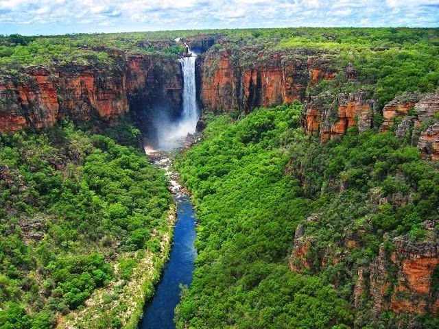 This breathtaking photo unveils the majestic spectacle of a pristine waterfall cascading dramatically from towering cliffs weaving through a lush green canyon It is a stunning vista within Kakadu National Park Australias ecological gem and a priceless treasure Kakadu is not merely a UNESCO-recognized natural and cultural heritage site but also a vibrant testament to unparalleled diverse nature The river and waterfall ecosystems here create a wild magnificent beauty that captivates every gaze This landscape is not only an ideal destination for nature photography but also underscores the crucial importance of world heritage conservation It holds immensely rich historical and biological values inviting visitors to explore and marvel at the pristine awe-inspiring grandeur of creation