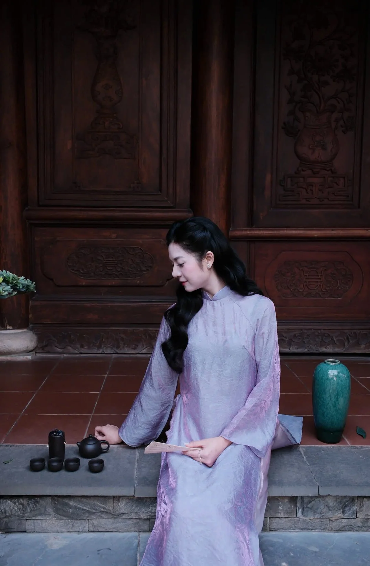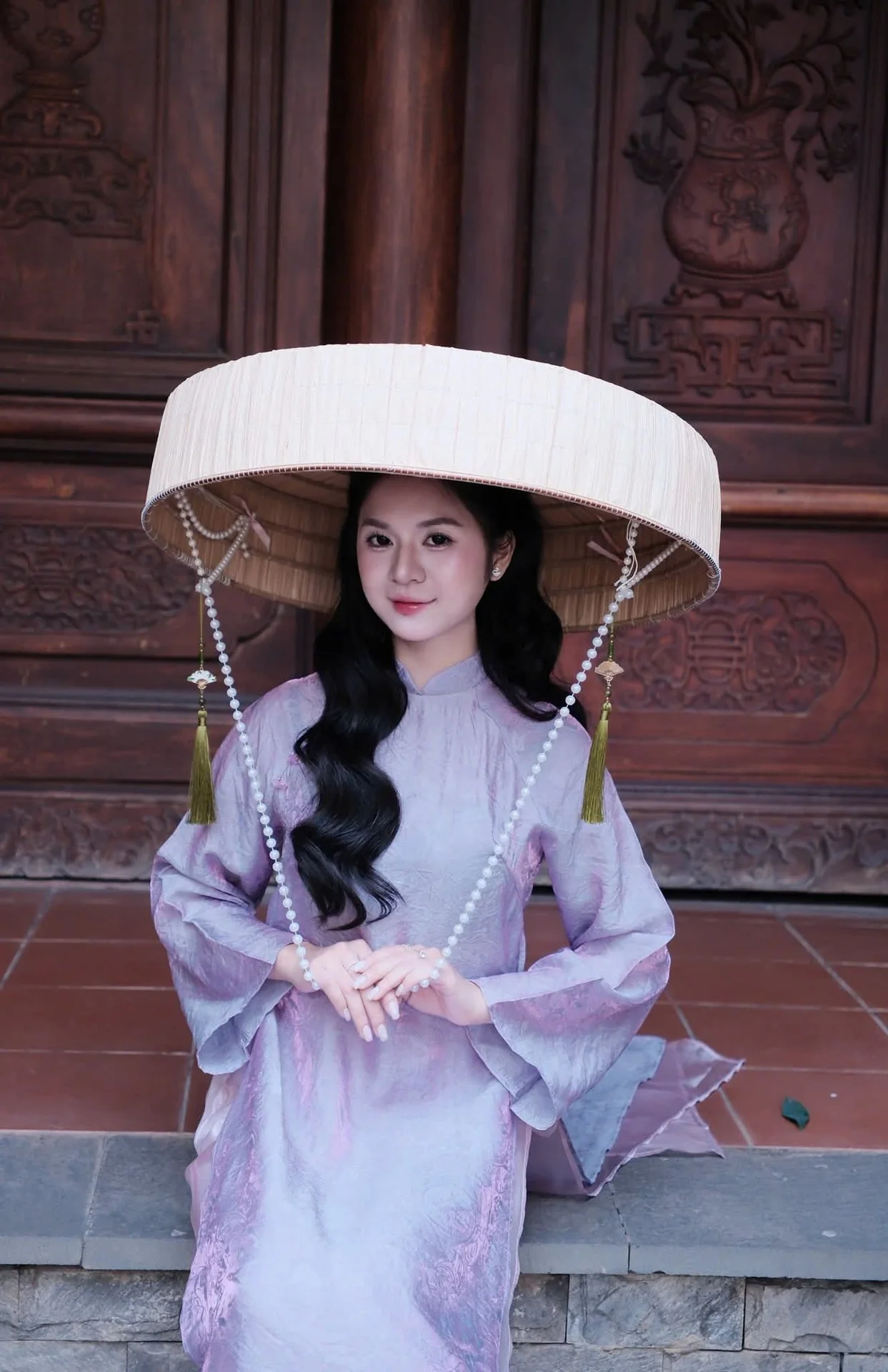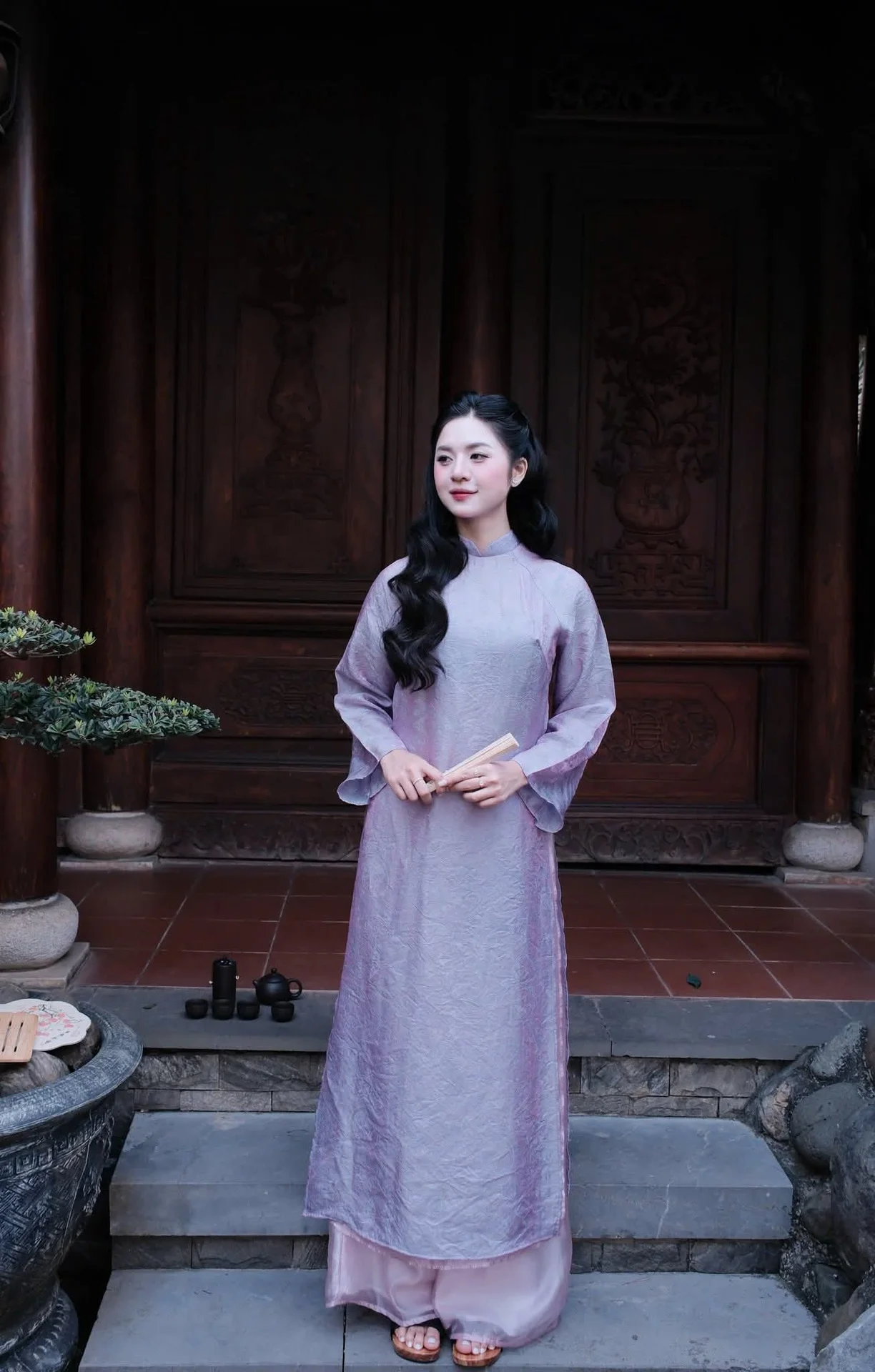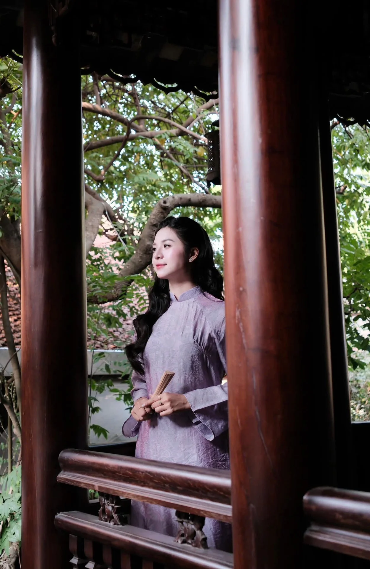 Standing amidst the quietude of traditional wooden pillars and weathered tiled roofs, the image of a young woman in a soft lavender Ao Dai unfolds like a poetic tribute to timeless beauty. Her gentle gaze and subtle smile radiate an aura of serenity, blending perfectly with the nostalgic atmosphere of the ancient surroundings. The delicate fabric of the dress, with its shimmering texture under natural light, highlights a sophisticated fashion sense that honors Vietnamese heritage while maintaining a modern, youthful charm. The composition captures a moment where architecture and human emotion intersect, creating a visual narrative filled with peace and longing. Every detail, from the way she holds the traditional fan to her cascading wavy hair, contributes to a refined aesthetic that feels both intimate and grand. This snapshot, identified as 1000029601.jpg, is more than just a portrait; it is an invitation to appreciate the harmony between cultural identity and the artistic soul in a world that often moves too fast, offering a sense of tranquility to any travel or fashion enthusiast.