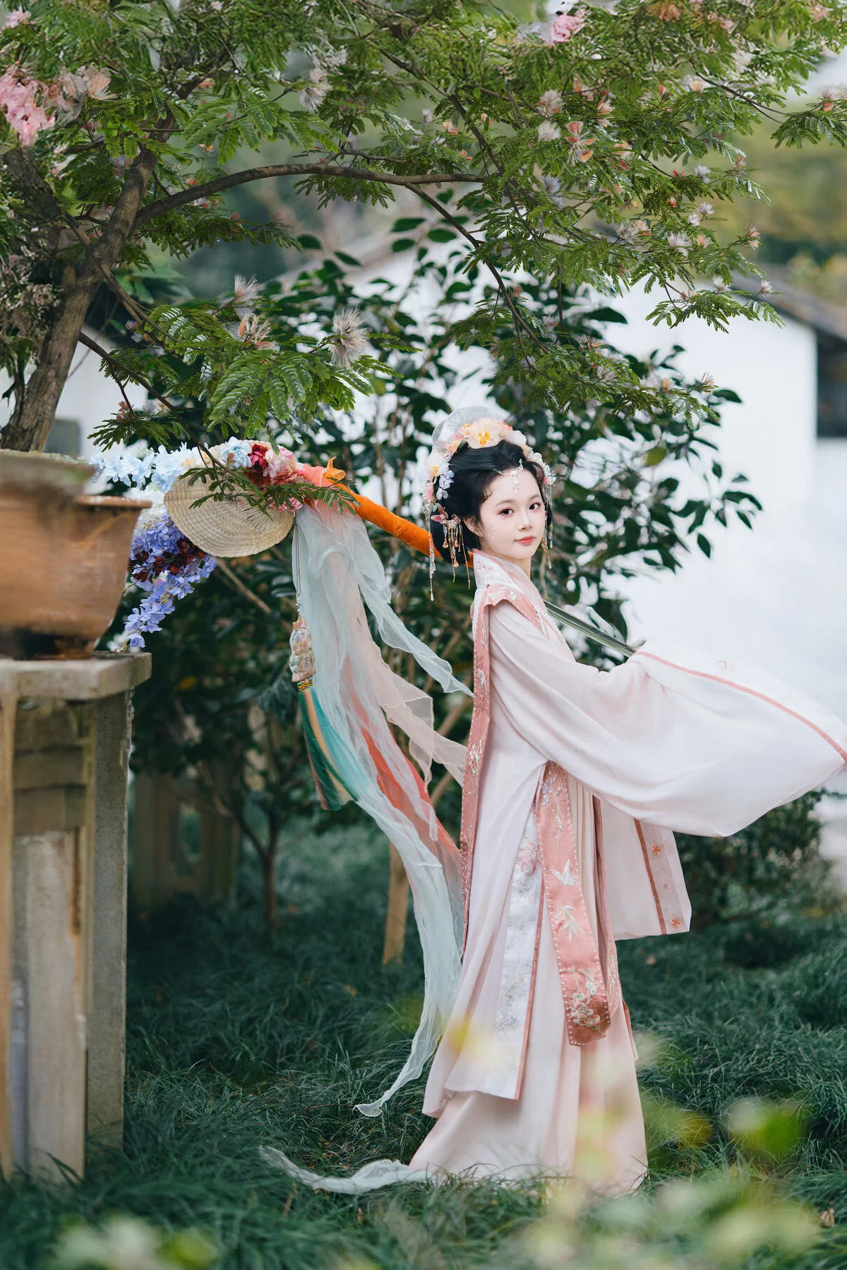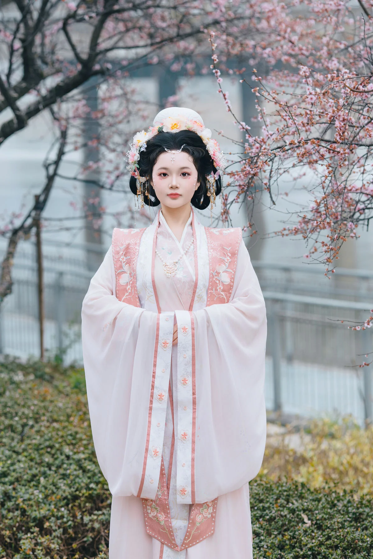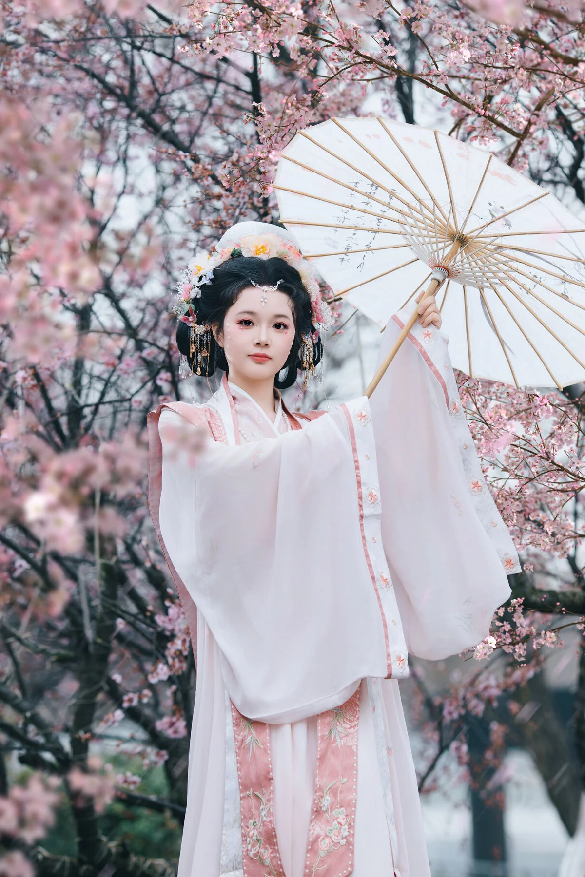 Immerse yourself in a dreamlike world with Jiao Tang Ma Qi Duo, a graceful model adorned in traditional Hanfu. She stands elegantly amidst a vibrant cherry blossom garden, creating a poetic spring tableau. Her exquisite white and pink attire, complemented by an elaborate updo embellished with flowers and pearls, highlights her serene and captivating East Asian beauty. Each captured moment is a harmonious blend of classical charm and modern photographic artistry, evoking feelings of peace and enchantment. This YiTuYu Vol.8761 collection is sure to delight those who appreciate refined aesthetics and traditional beauty.