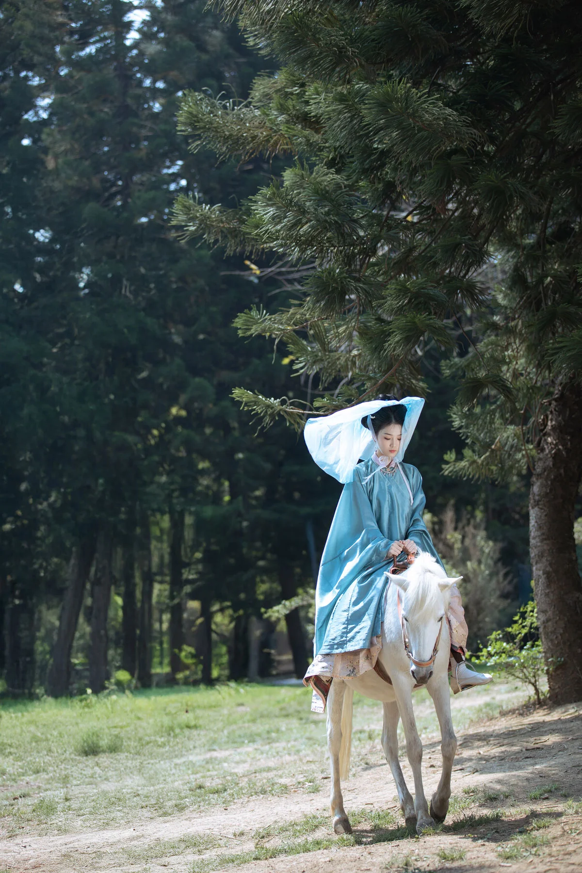 In this captivating image from YiTuYu Vol. 8831 model Zhi Zhi Qi embodies an ethereal traditional beauty gracefully riding a white horse through a serene forest landscape. Her flowing blue robe and elegant wide-brimmed hat evoke a sense of timeless charm and mystique. The gentle stride of the horse on the grassy path surrounded by lush greenery transports viewers to a scene straight out of an ancient tale or painting. Sunlight filters through the canopy casting dappled light that enhances the magical atmosphere. This photograph beautifully merges human elegance with the majesty of nature creating a tranquil and alluring visual narrative that invites contemplation and admiration.