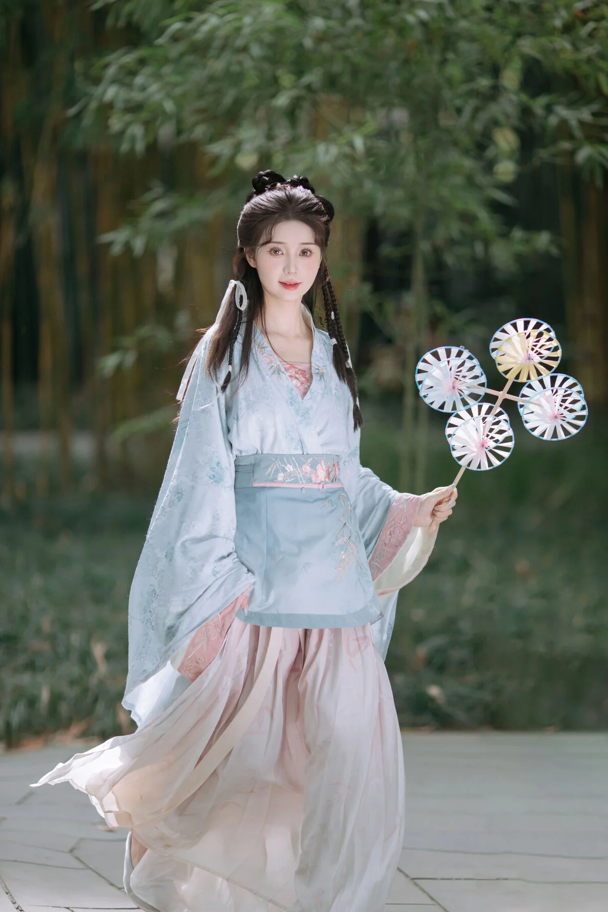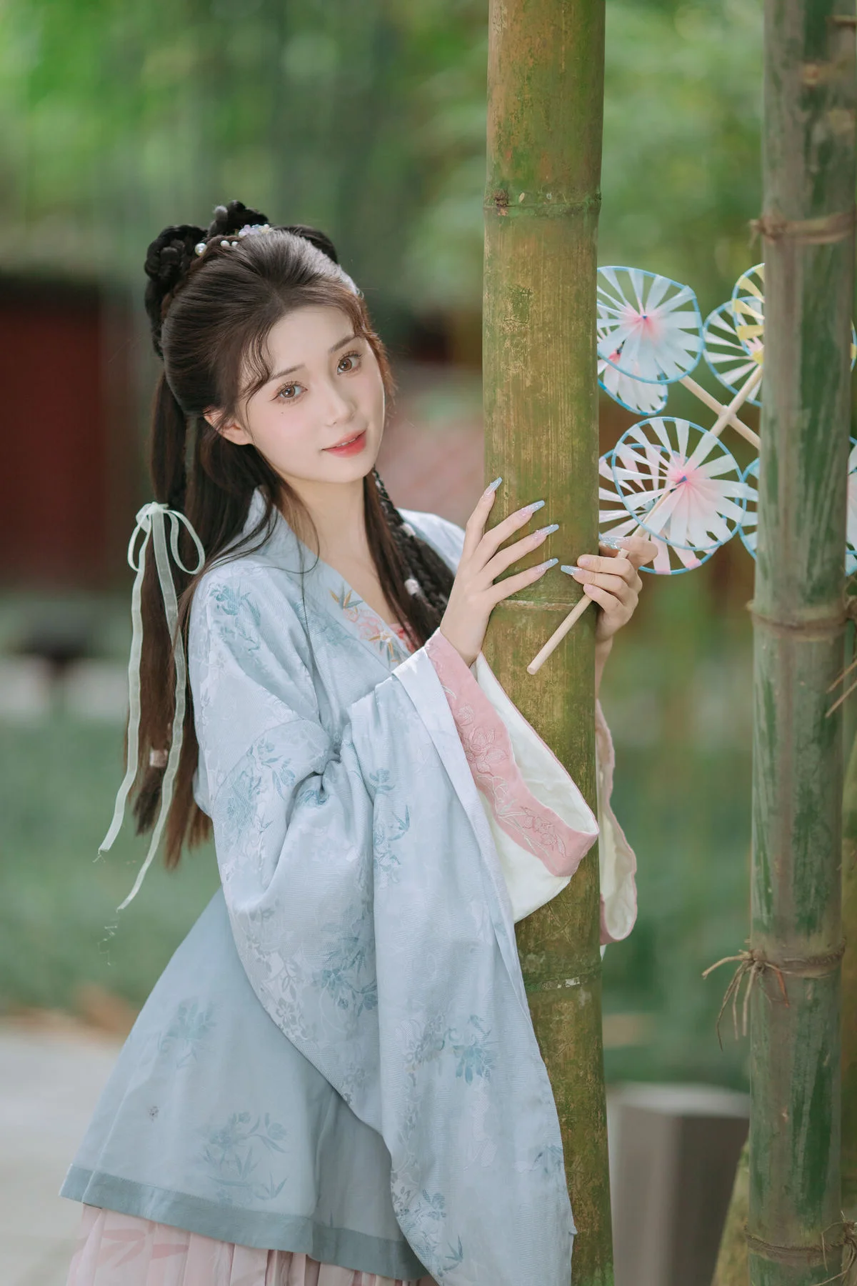 In the YiTuYu Vol.8800 photo collection Chu Yuan Yuan emerges like a muse from a fairy tale. She is adorned in delicate traditional Hanfu attire in soft pastel blue hues harmonizing beautifully with the natural scenery. Her elaborate updo is embellished with traditional accessories and her graceful smile exudes a gentle yet elegant charm. Holding a unique floral fan prop Chu Yuan Yuan poses expressively amidst a lush green backdrop evoking a poetic work of art. This collection perfectly blends human beauty with natural landscapes vividly showcasing the artistic language of YiTuYu.