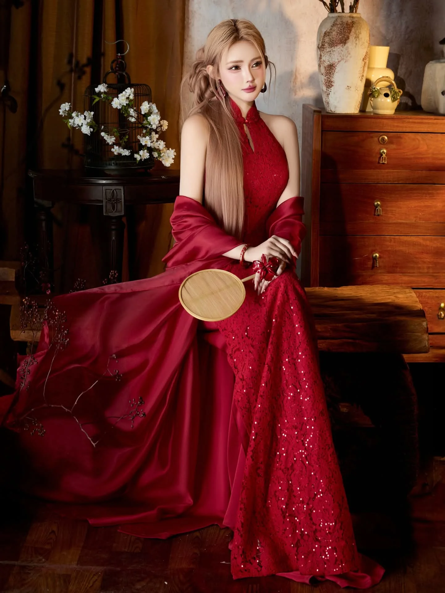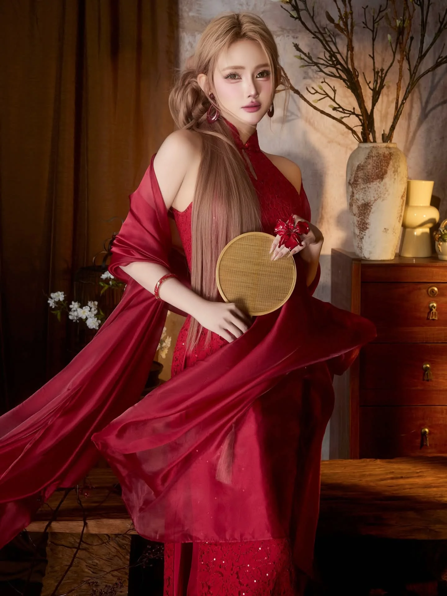 This captivating image portrays an enchanting East Asian beauty, where traditional charm blends seamlessly with modern allure. The central figure is a girl with long flowing hair, exuding elegance and grace. She wears a radiant red outfit, exquisitely designed with sparkling details that accentuate her graceful silhouette. A delicate, flowing red shawl adds softness and fluidity to her posture. In her hand, she holds a traditional round fan, a symbol of sophistication and ancient culture. The overall composition evokes a sense of both nostalgia and luxury, affirming the timeless appeal of mysterious East Asian beauty.