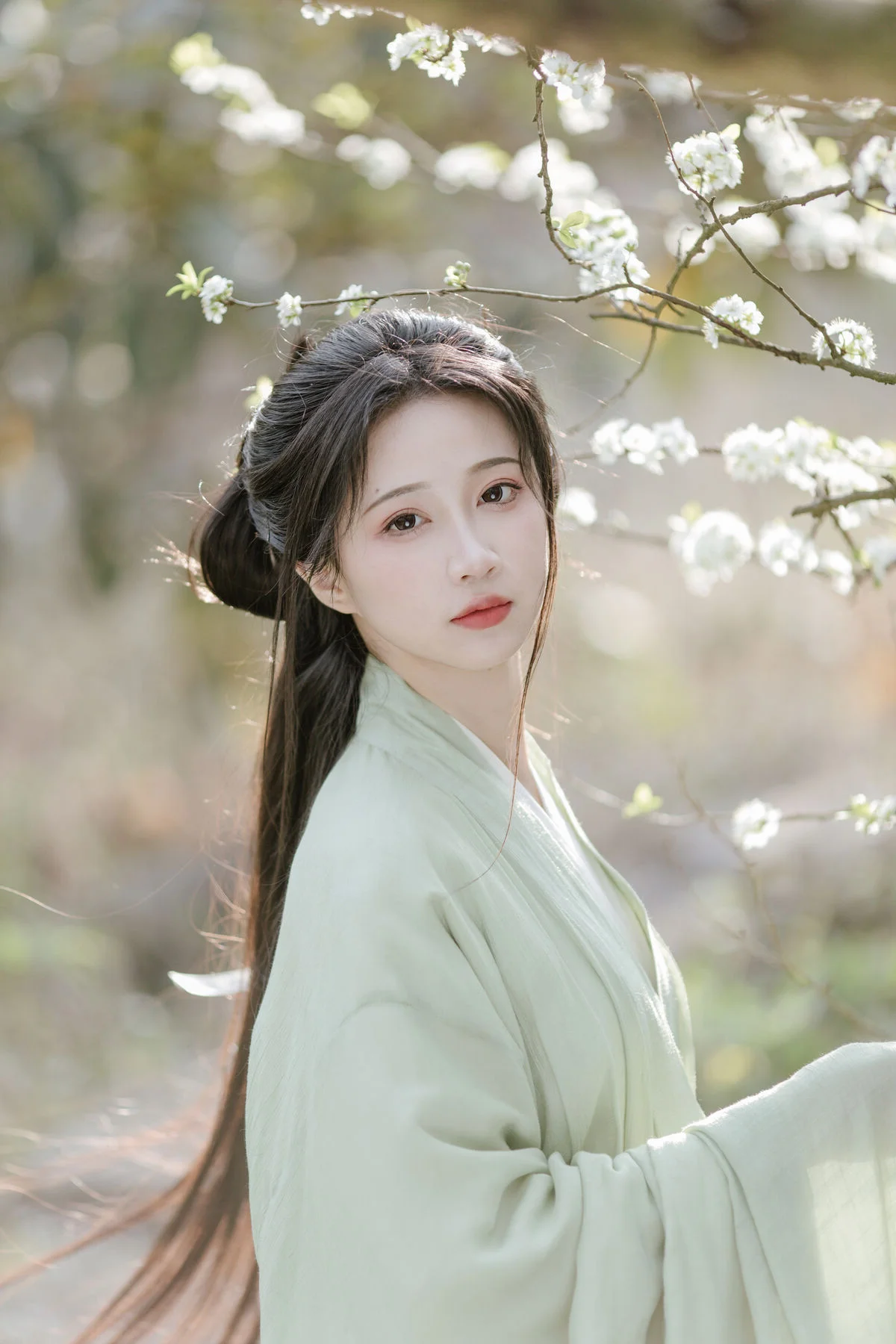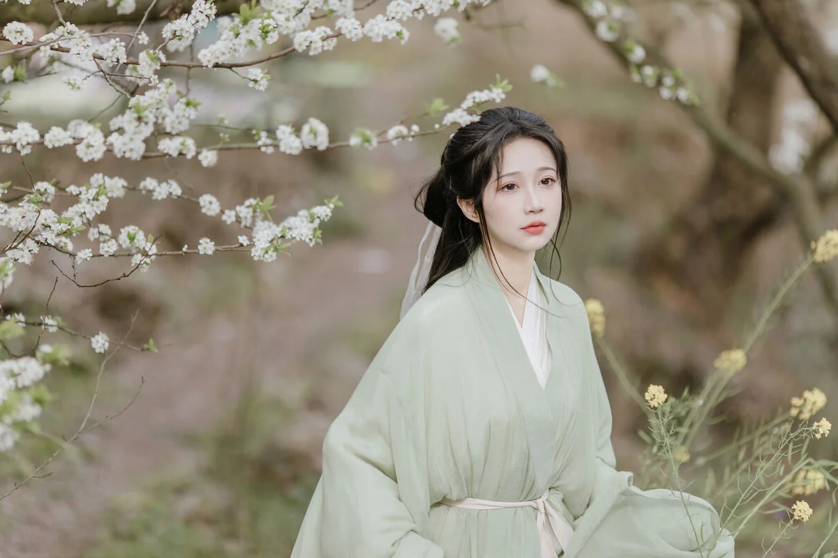 In the YiTuYu Vol.8817 photo collection, the muse Qi Luo Sheng De Xiao Su Su emerges with a captivating pure and gentle beauty. Dressed in a jade green traditional costume, she stands gracefully amidst a blooming spring garden, creating a vibrant and poetic tableau. Each delicate white blossom gently falling seems to adorn her refined dark hair styled in an elegant bun and her delicate face. Qi Luo Sheng De Xiao Su Su's dreamy gaze and shy smile evoke a classical, ethereal beauty. This collection is not just a spring trip but a perfect blend of graceful East Asian aesthetics and fresh natural scenery, offering viewers a sense of peace and romance. It is truly a compelling work of visual art.