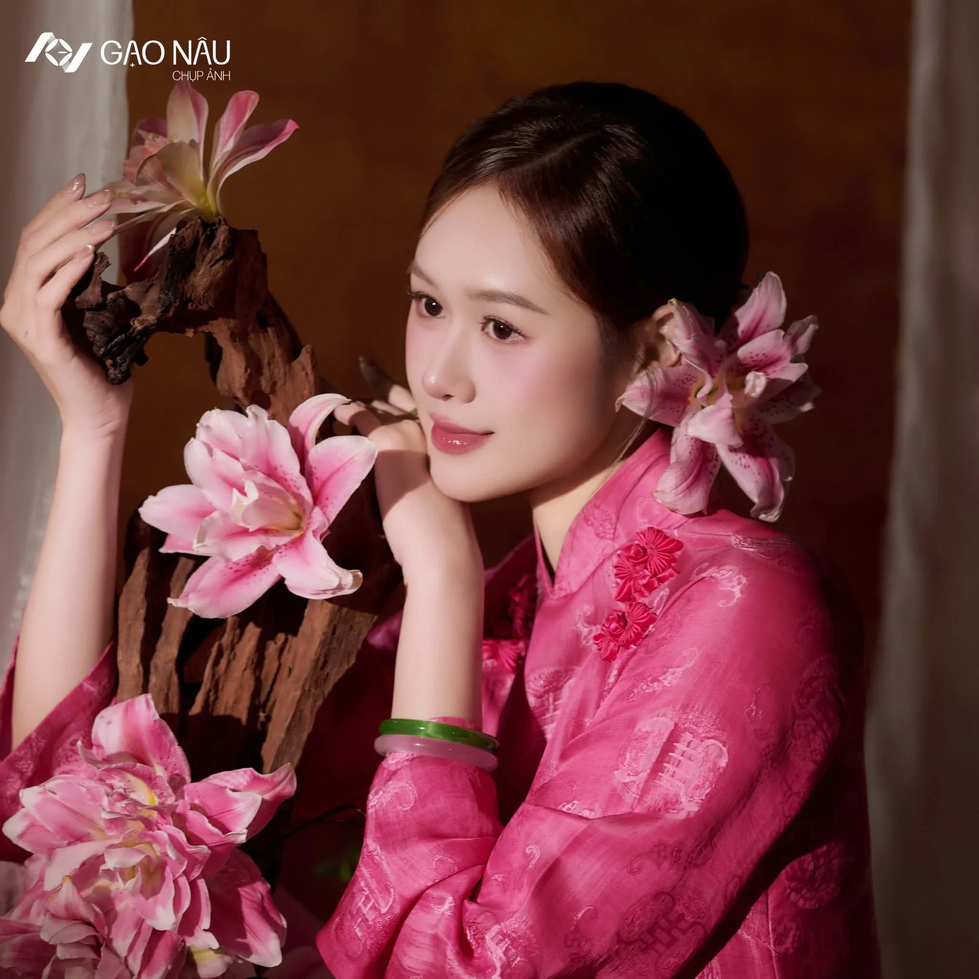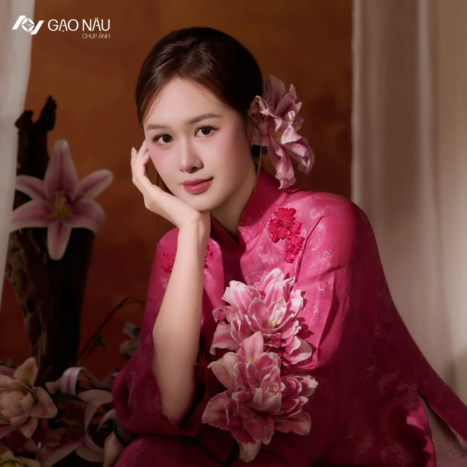 Capturing the essence of poetic Eastern beauty, this portrait radiates a sense of nostalgic elegance through the iconic Vietnamese Ao Dai. The subject exudes a gentle aura with her soft gaze and poised demeanor, perfectly embodying the sophisticated charm of traditional heritage. Dressed in a rich magenta silk ensemble, the outfit stands out with its exquisite 3D floral appliqués that add a tactile and luxurious dimension to the visual narrative. The warm lighting and earthy background tones harmonize beautifully with the vibrant fabric, creating a mood that is both intimate and grand. Every detail, from the delicate hair accessory to the intricate embroidery, reflects a high level of craftsmanship and a refined fashion sense. This visual story invites the viewer to appreciate the seamless blend of cultural tradition and contemporary artistic expression, celebrating a femininity that is as enduring as it is breathtaking.