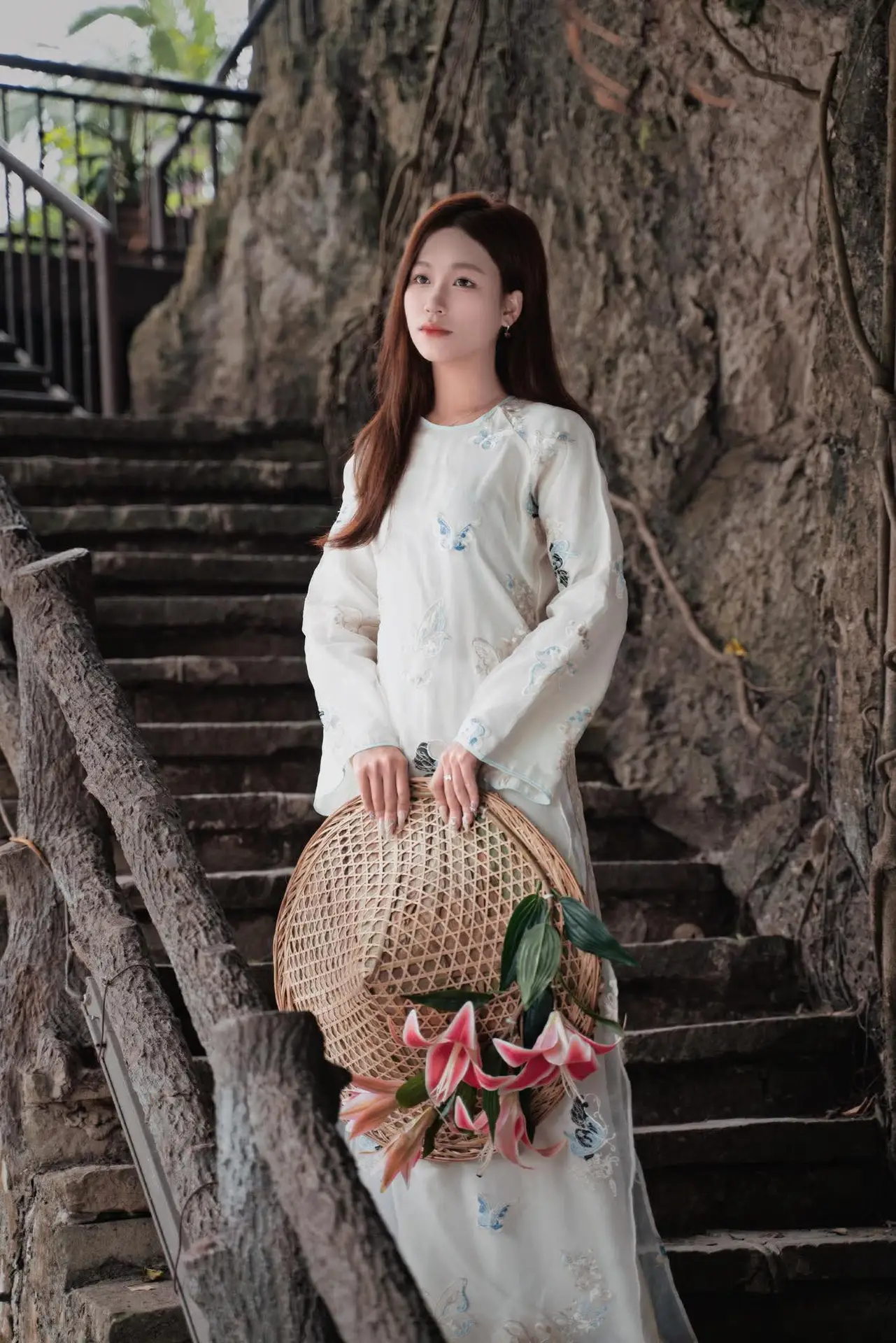 This captivating image portrays the gentle and elegant beauty of a Vietnamese girl adorned in a pristine white Ao Dai The traditional dress is subtly embellished with delicate blue floral patterns enhancing her graceful charm She sits gracefully on ancient stone steps her long hair flowing softly and her clear eyes gazing directly at the viewer Beside her rests a woven basket brimming with fresh pink lilies creating a harmonious and poetic scene This portrait not only showcases the timeless elegance of Vietnamese women but also evokes the enduring beauty of traditional Asian culture It is a perfect blend of human grace and a tranquil natural setting