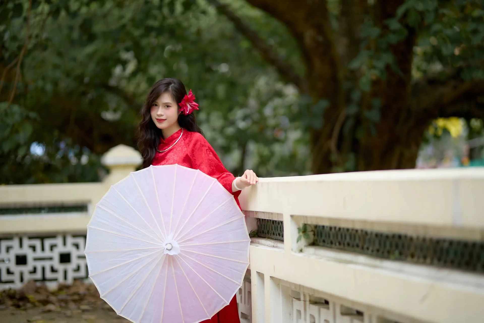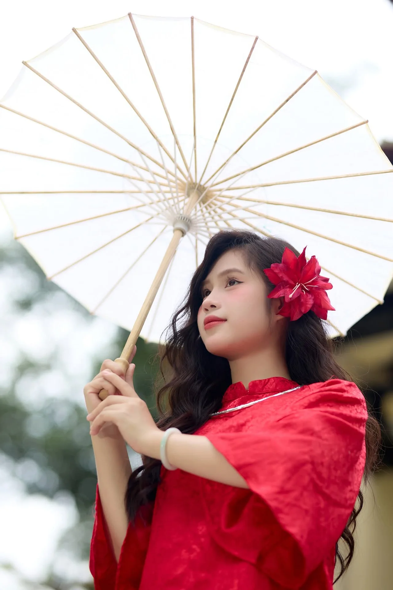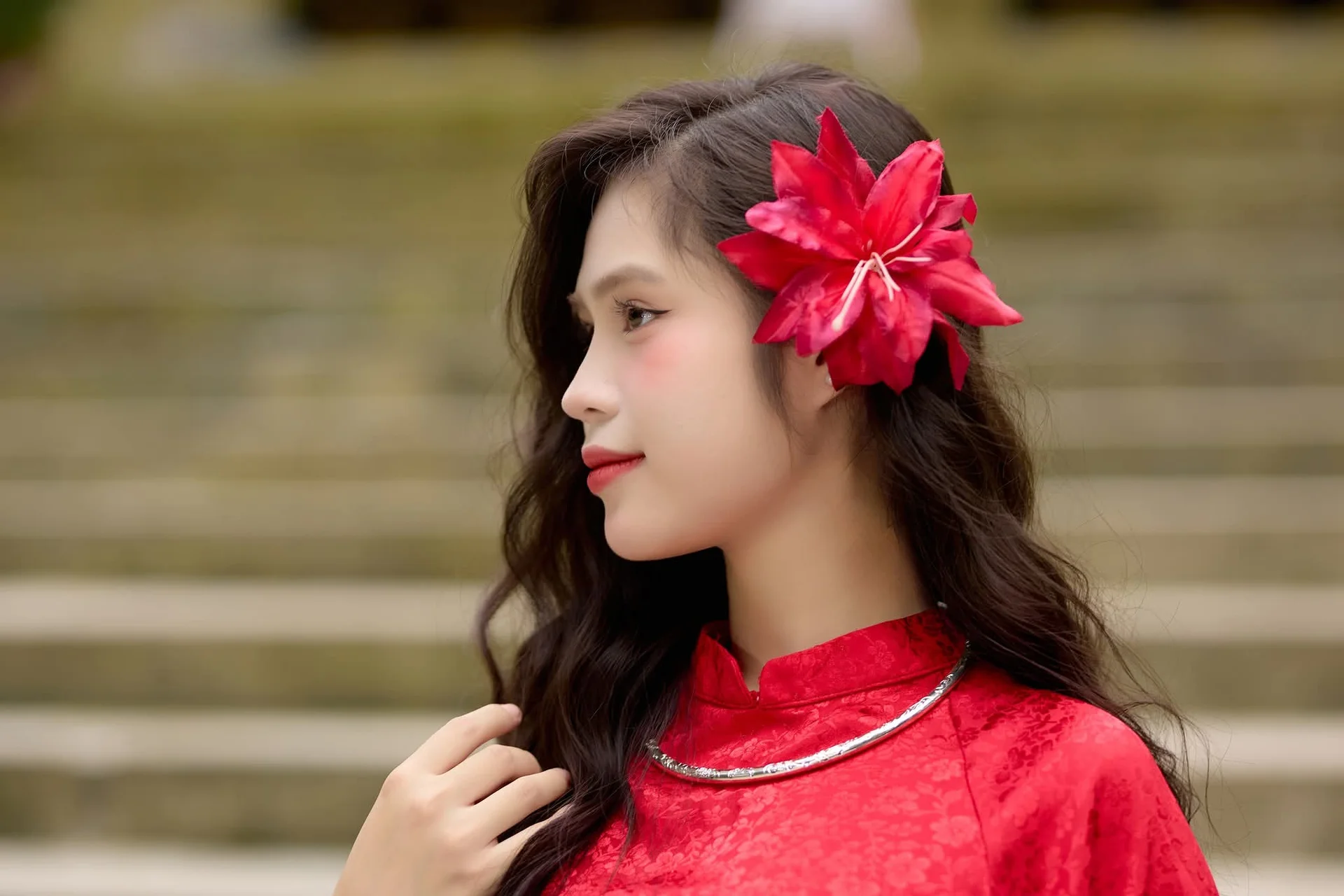 This stunning photograph captures a graceful Vietnamese woman elegantly clad in a vibrant red Ao Dai. Her sophisticated beauty is enhanced by a delicate pearl necklace and, notably, a striking red flower pinned in her hair, adding a captivating accent. Her gentle, dreamy gaze conveys a sense of modesty and the inherent charm characteristic of Vietnamese women. More than just a portrait, this image symbolizes the traditional beauty and rich culture of Vietnam, evoking pride and admiration. The Ao Dai remains a cherished garment, celebrating the noble and refined spirit of Vietnamese women.