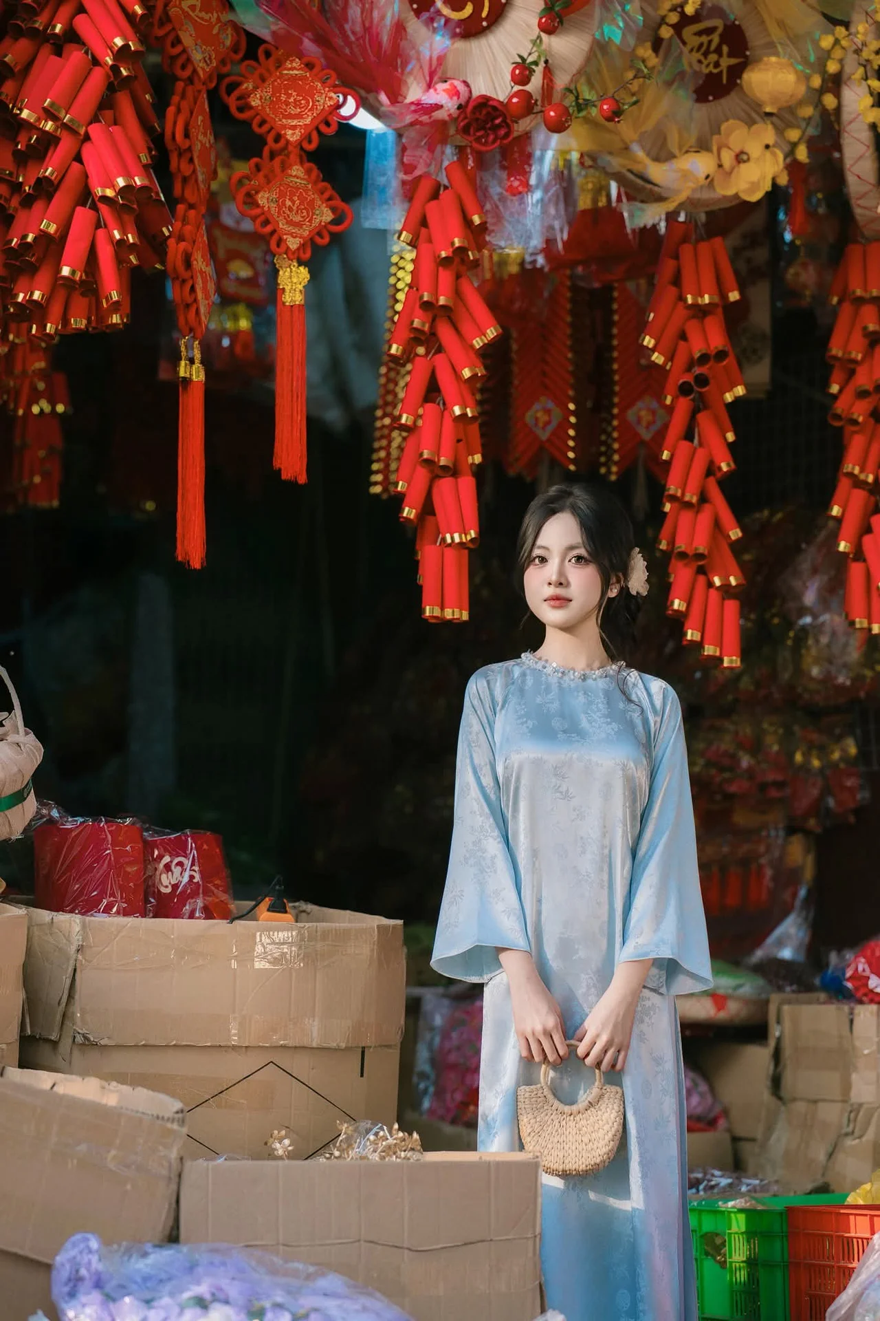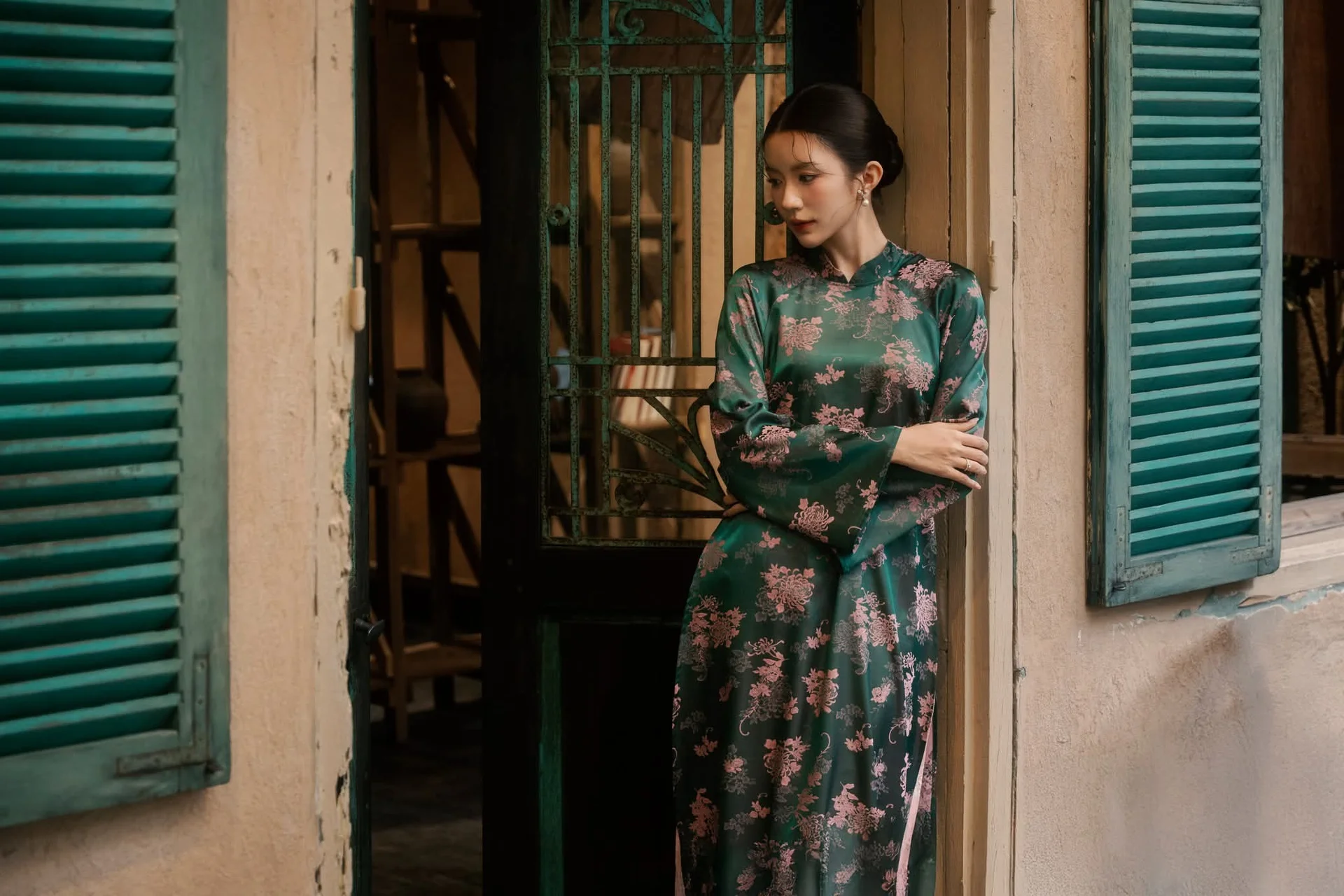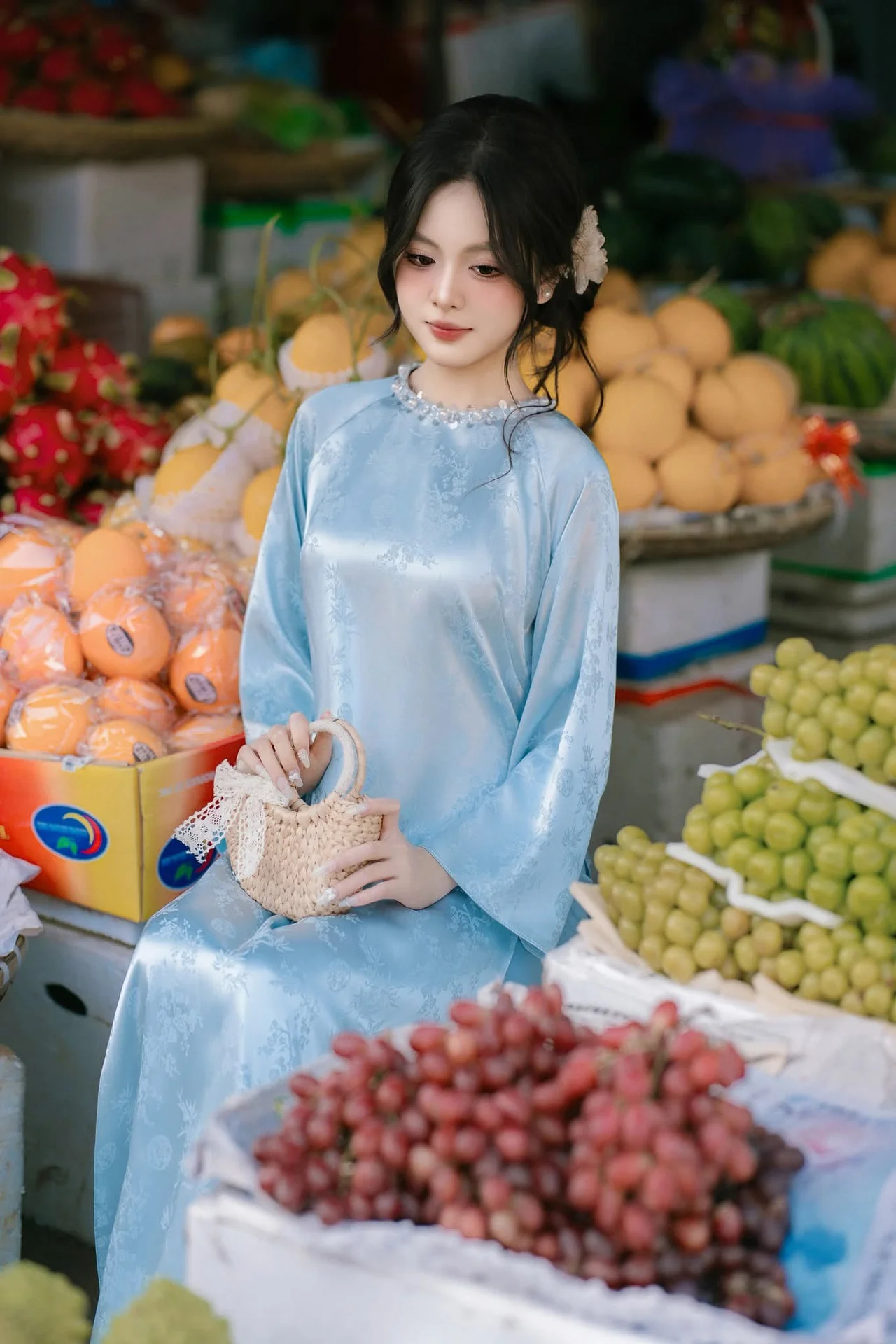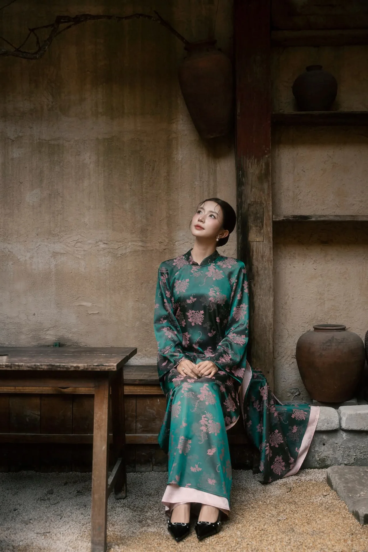 Experience the breathtaking blend of cultural heritage and modern sophistication as Ngọc Thảo showcases the timeless beauty of the Vietnamese Ao Dai. In this stunning visual series, she wears a delicate light blue silk tunic that perfectly captures a sense of serenity and grace. The soft pastel hue complements the intricate traditional backdrop, filled with wooden textures and artisanal ceramics that tell a story of rich history and artistic depth.