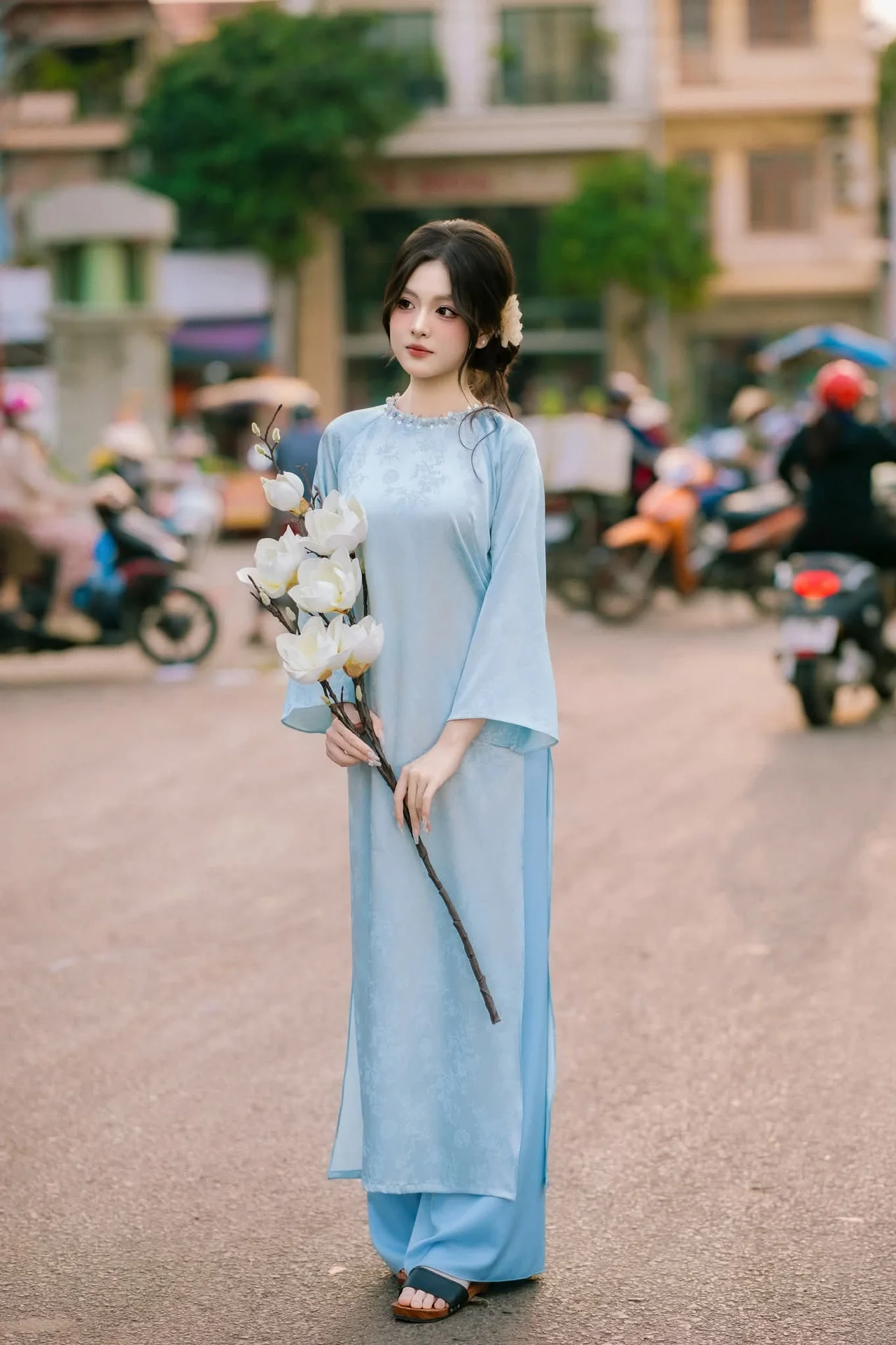 This image serves as a perfect inspiration for your next travel itinerary or cultural fashion mood board. Discover the soul of Vietnam through its streets, its people, and its exquisite traditional attire. Let the magic of Hanoi’s spring inspire your wanderlust and appreciation for global craftsmanship. For those looking to replicate this aesthetic, this style highlights the best of Vietnamese festive fashion. Please refer to the visual details for inspiration on your next cultural journey.