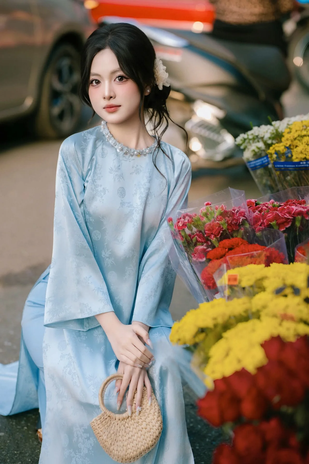 This beautiful photo captures a Vietnamese girl radiating charm in a gentle light blue Ao Dai. Her elegant Asian beauty exudes grace and sophistication. Her neatly tied black hair adorned with a pristine white flower further accentuates her delicate features. Posing beside vibrant bouquets of red and yellow fresh flowers she seems to blend seamlessly into a serene and poetic setting. This image not only celebrates the traditional beauty of Vietnamese women but also showcases the harmonious blend of human elegance and nature creating a sense of peace and enchantment. It is a timeless symbol of Vietnamese cultural beauty.