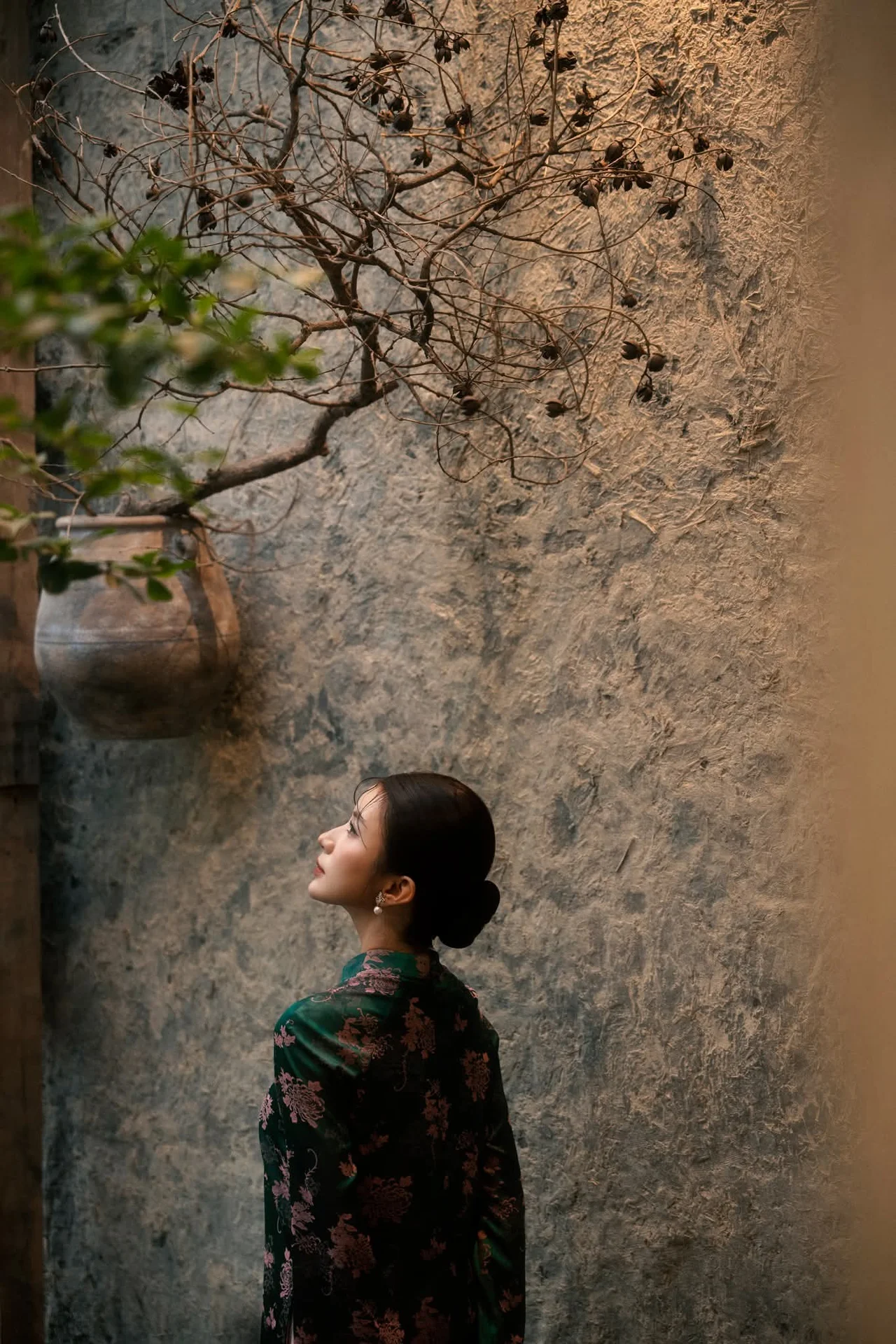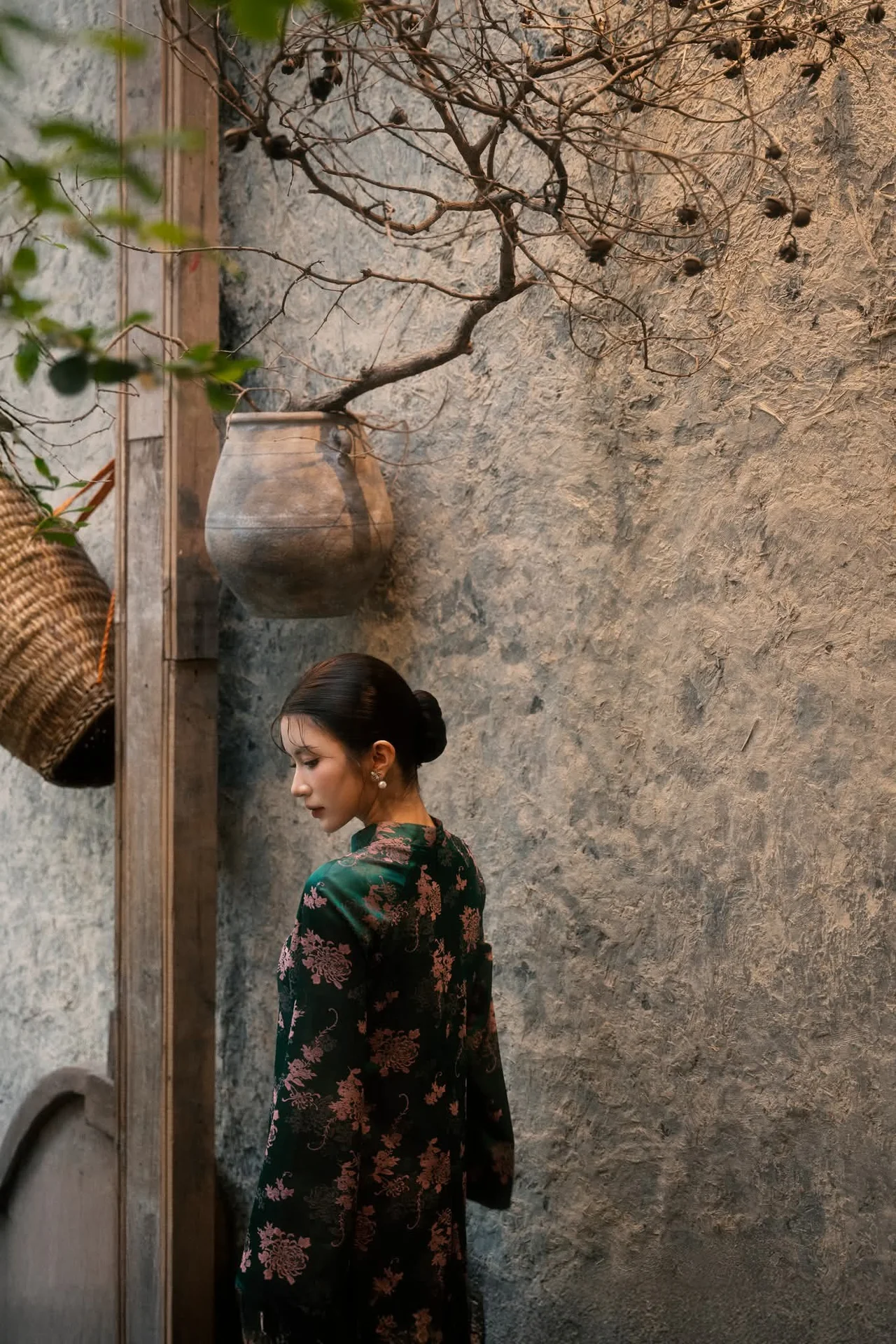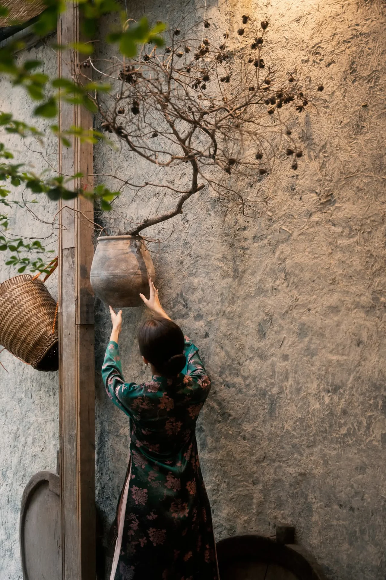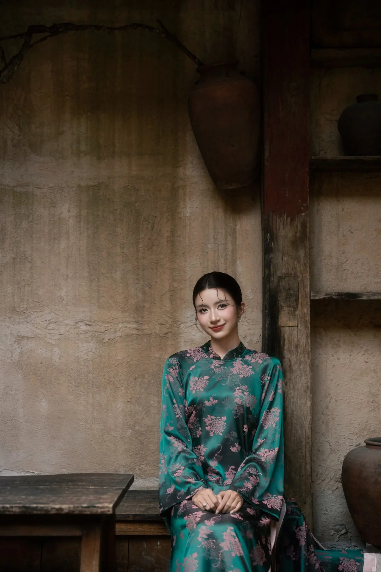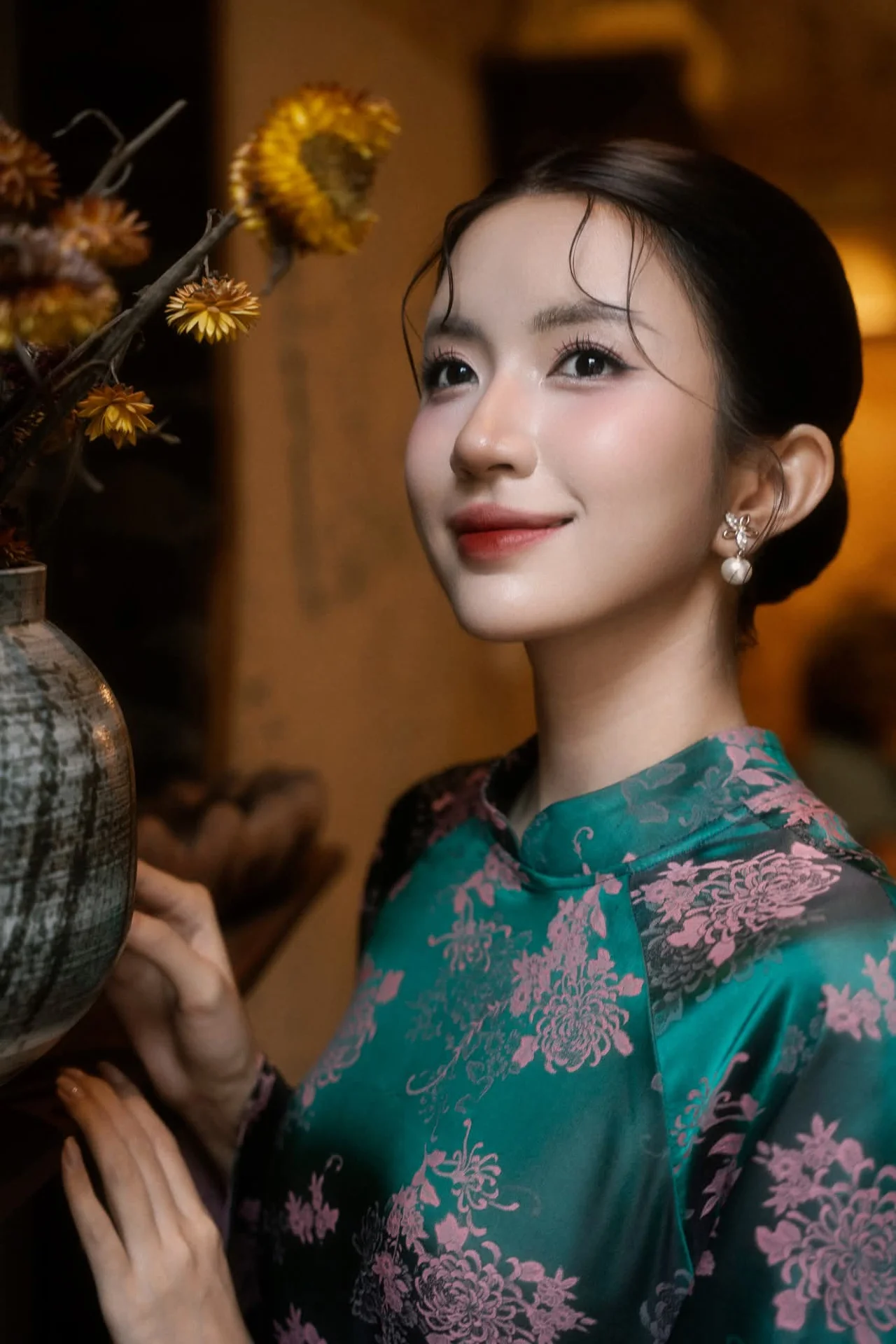 This captivating image features an elegant Asian woman, exuding a gentle, refined, and captivating beauty. She is adorned in a modernized teal traditional dress, intricately patterned with delicate pink florals, showcasing both sophistication and cultural heritage. Her gaze, filled with quiet contemplation, is directed softly to the side, creating an atmosphere rich with poetic charm. Her graceful hands gently touch a classic ceramic vase, holding warm-toned dried flowers, resting on a rustic wooden shelf. This harmonious composition of person and object, blending contemporary style with vintage aesthetics, evokes a profound sense of peace, introspection, and cultural beauty.