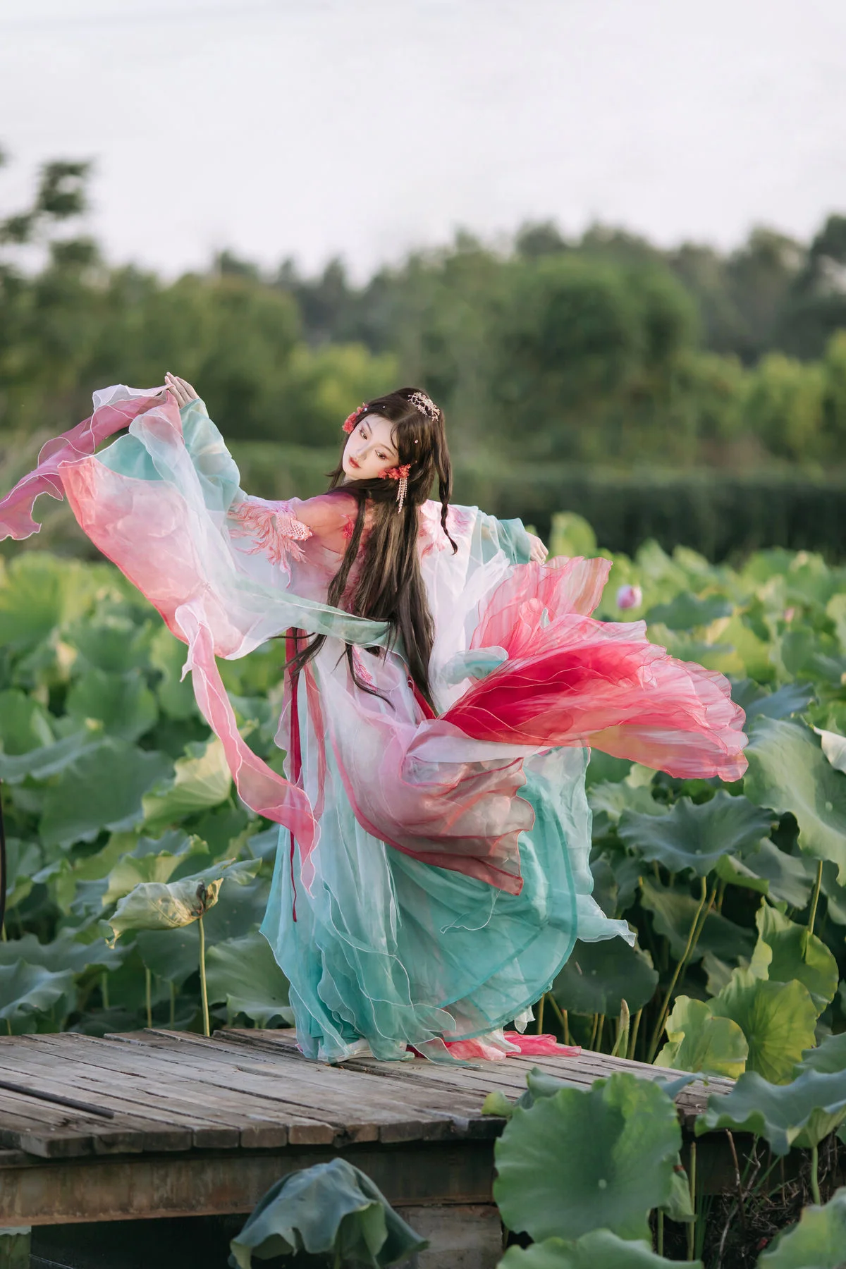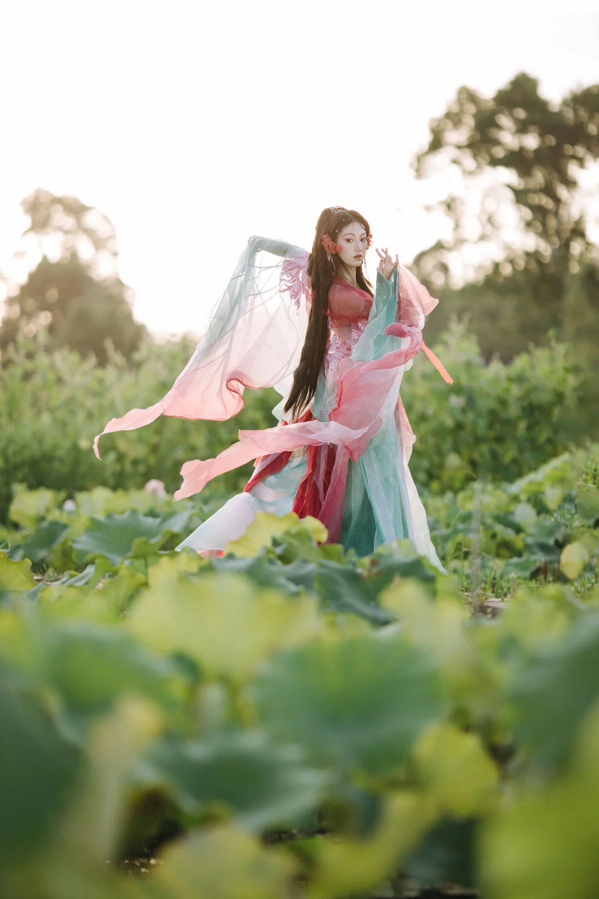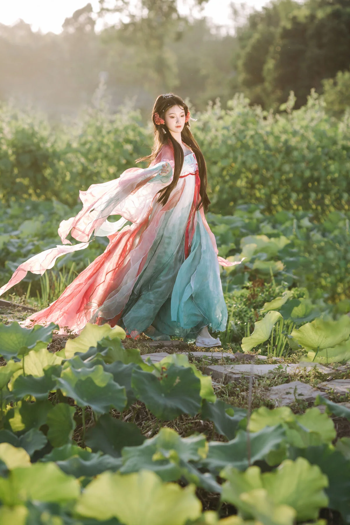 This captivating image features Dong Chu Liu in a moment of poetic grace. She is adorned in exquisite traditional Chinese attire, with soft hues of pink and teal that highlight her pure and gentle beauty. Her long hair is elaborately styled, embellished with large, elegant flowers resembling lotus or peonies, creating a magnificent and classic aesthetic. The soft golden light of dawn or dusk bathes the scene, accentuating her fair skin and delicate facial features. This is an artistic photographic piece from YiTuYu Vol.8746, showcasing a harmonious blend of human beauty and nature. It evokes a sense of tranquility and enchantment, with Dong Chu Liu embodying the timeless elegance of an ancient Asian muse.