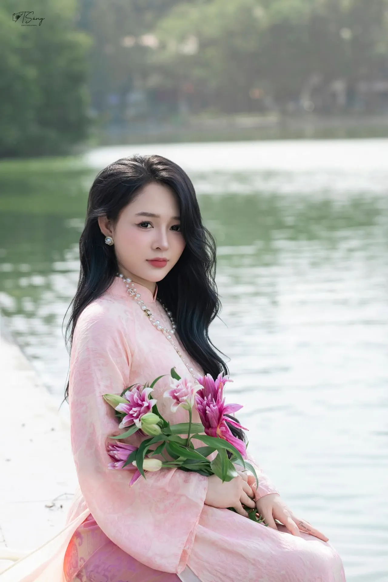 Discover the Elegant Charm of Vietnamese Beauty in a Pink Ao Dai by the Serene Lake