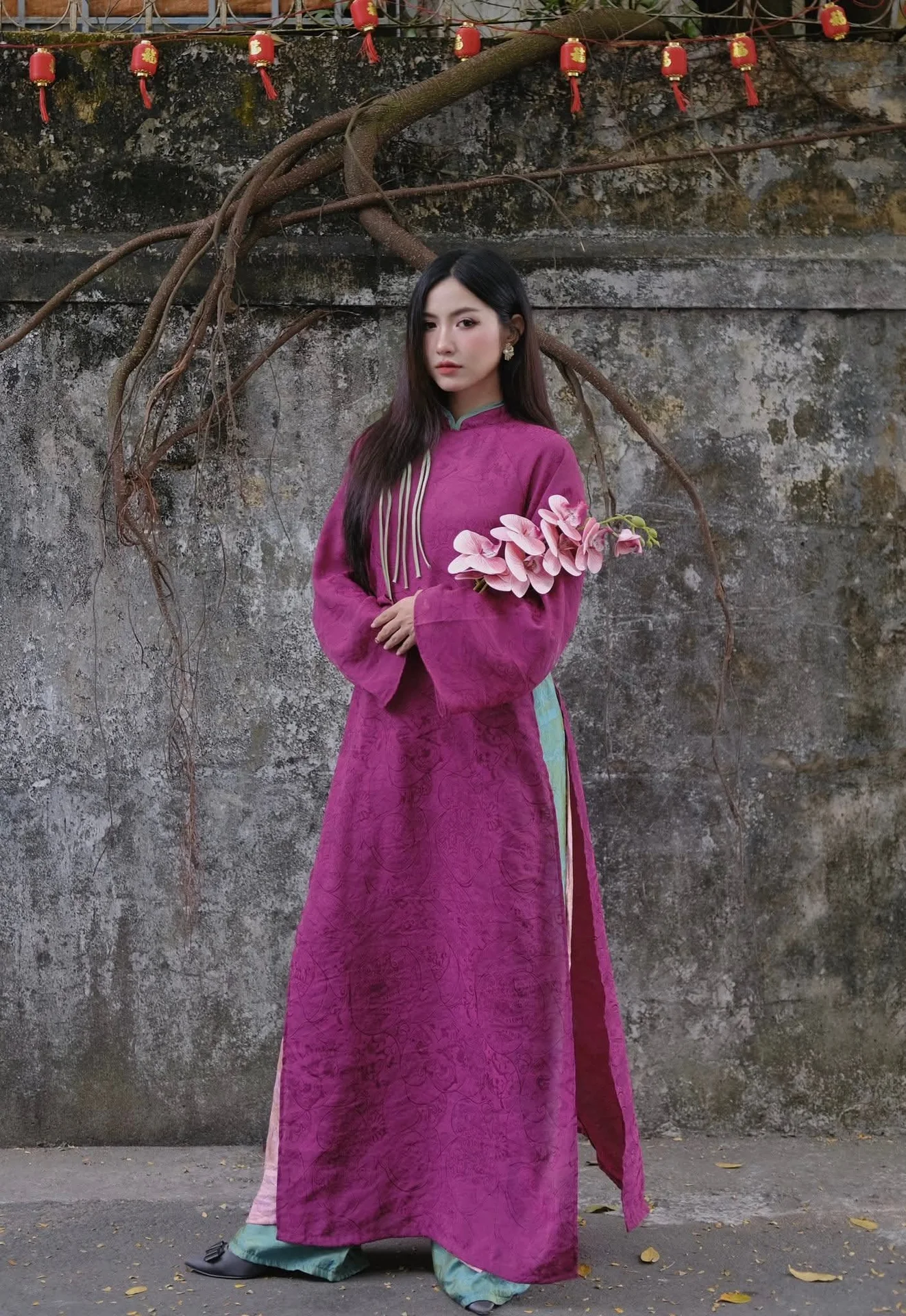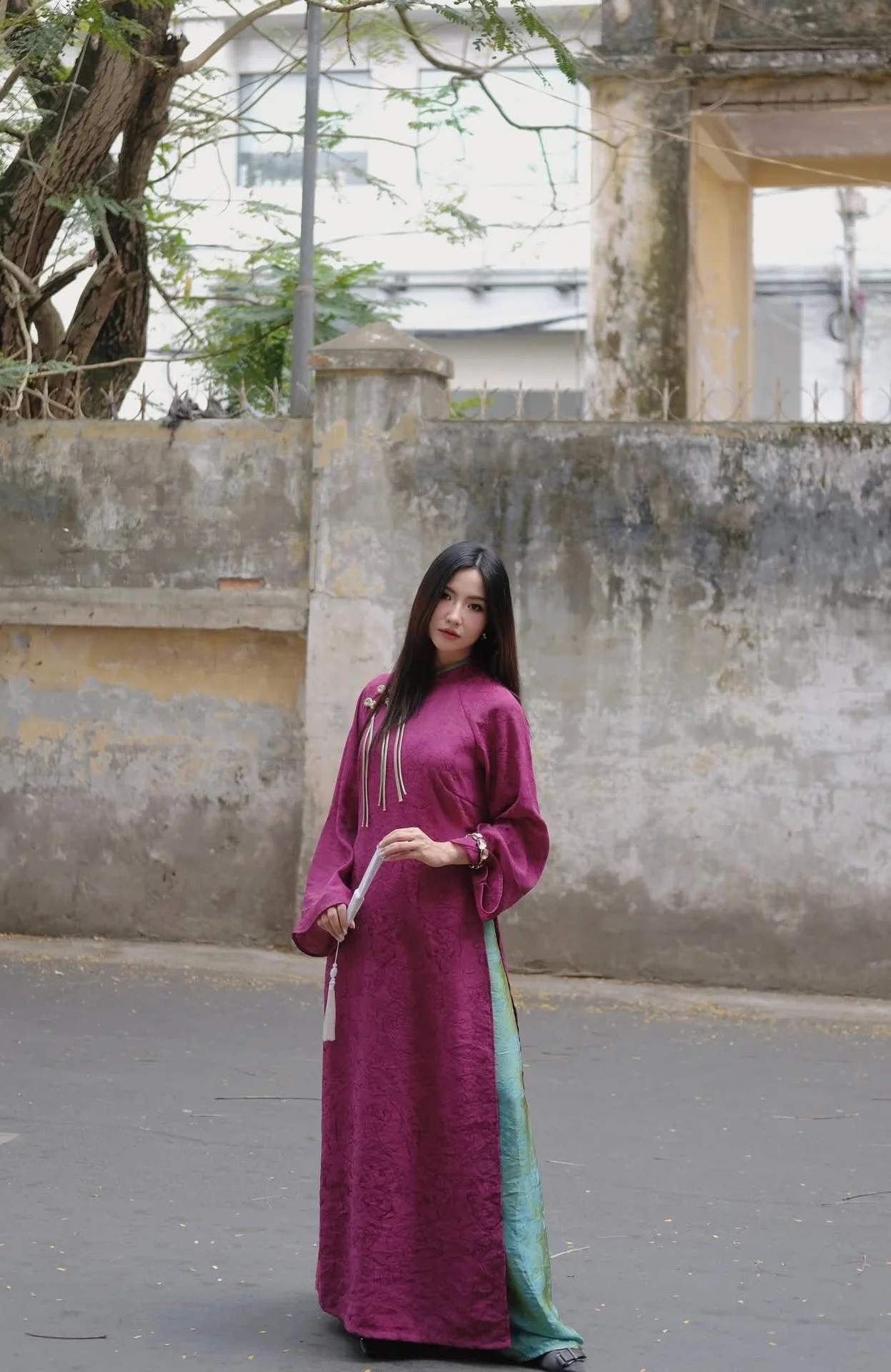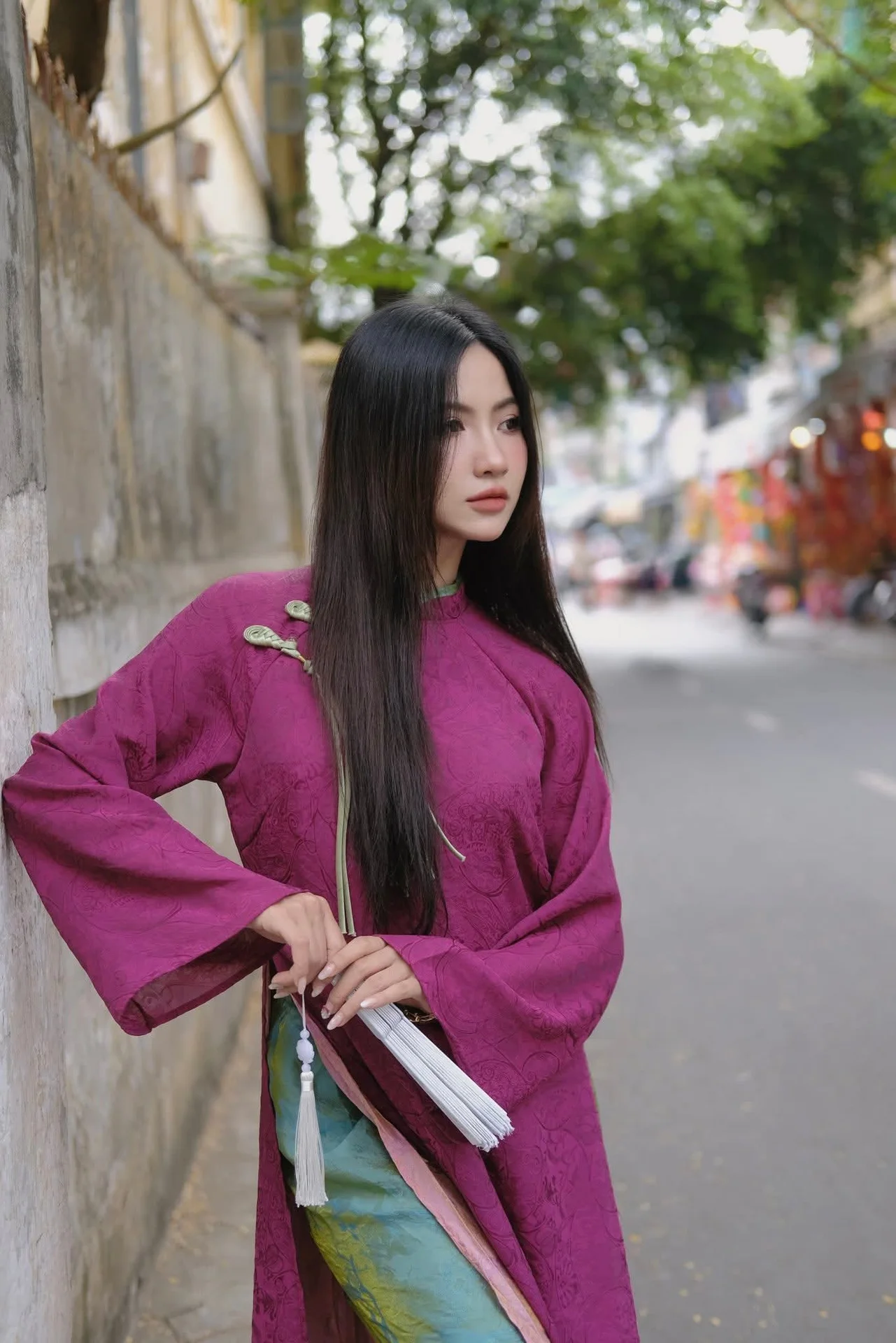Amidst the bustling energy of the city, the image of a young woman in a deep plum-purple traditional dress stands out like a poetic pause in time. The outfit, crafted from luxurious fabric with delicate traditional fastenings and flowing wide sleeves, evokes the graceful charm of ancient noble ladies within a nostalgic Indochine setting. Her pensive gaze and naturally flowing long black hair create an aura that is both gentle and mysteriously captivating, instantly drawing the viewer in. The artistic color pairing of the rich purple top with the teal undertones of the lower garment showcases a sophisticated visual aesthetic that bridges the gap between eras. Set against the backdrop of weathered walls in the Old Quarter under soft natural light, the scene beautifully highlights the timeless beauty of heritage. This is more than just a fashion shot; it is a visual narrative of the intersection between traditional values and modern soul, bringing a sense of peace and a touch of romance to any art-loving soul.#Vietnamese #AoDai #HaNoiStreetStyle #TraditionalElegance #TravelVietnam #VintageVibe