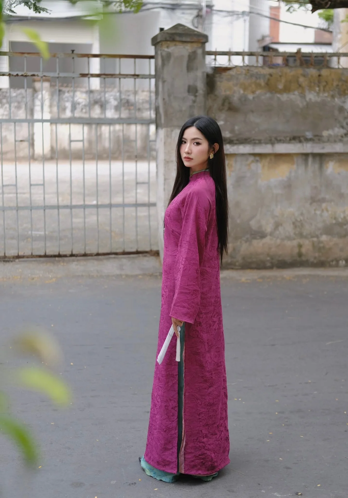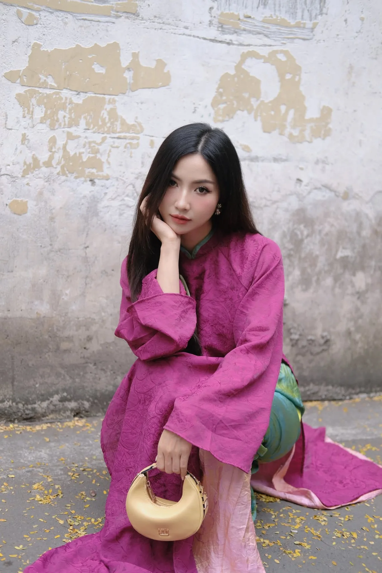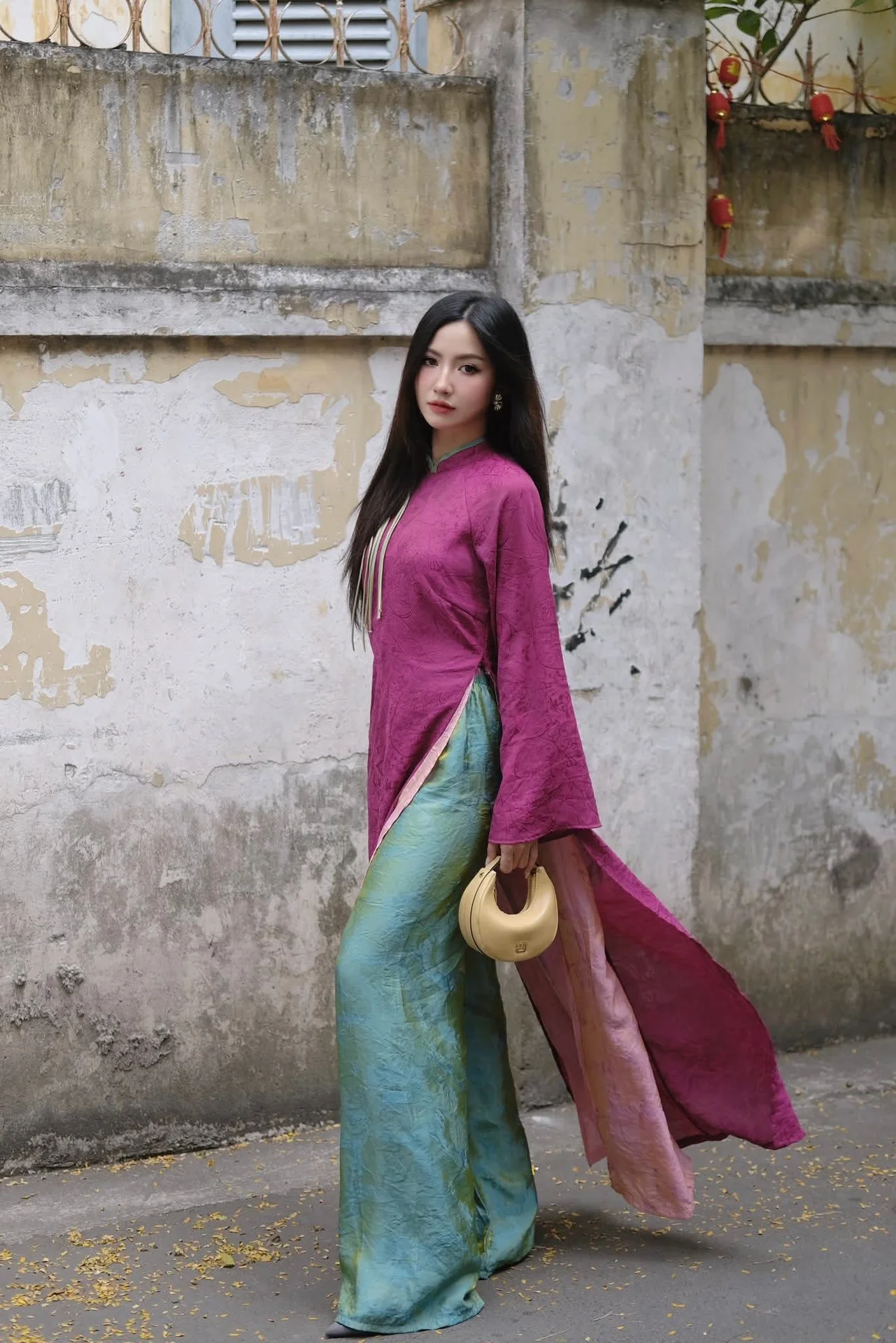 Amidst the bustling energy of the city, the image of a young woman in a deep plum-purple traditional dress stands out like a poetic pause in time. The outfit, crafted from luxurious fabric with delicate traditional fastenings and flowing wide sleeves, evokes the graceful charm of ancient noble ladies within a nostalgic Indochine setting. Her pensive gaze and naturally flowing long black hair create an aura that is both gentle and mysteriously captivating, instantly drawing the viewer in. The artistic color pairing of the rich purple top with the teal undertones of the lower garment showcases a sophisticated visual aesthetic that bridges the gap between eras. Set against the backdrop of weathered walls in the Old Quarter under soft natural light, the scene beautifully highlights the timeless beauty of heritage. This is more than just a fashion shot; it is a visual narrative of the intersection between traditional values and modern soul, bringing a sense of peace and a touch of romance to any art-loving soul.#Vietnamese #AoDai #HaNoiStreetStyle #TraditionalElegance #TravelVietnam #VintageVibe