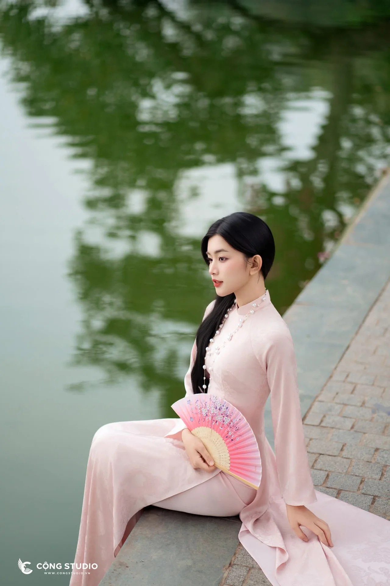 This moment feels like a gentle love song dedicated to the traditional beauty of Vietnamese women. Dressed in a soft pastel pink Ao Dai, the muse radiates an ethereal and pure elegance that is truly captivating. The delicate pearl buttons along the collar and the vintage folding fan add a touch of nostalgic charm, creating a look that is both sophisticated and timeless. Her dreamy gaze and serene presence transport the viewer back to a bygone era where grace was the language of the soul. The smooth fabric gracefully drapes over her silhouette, blending perfectly with the elegant pastel tones to showcase a refined aesthetic and a deep appreciation for cultural heritage. This is more than just a portrait; it is an inspiring piece of visual art for those who cherish a minimalist yet poetic lifestyle.#VietnameseBeauty #AoDai #TraditionalElegance #VintageVibe #MusePhotography