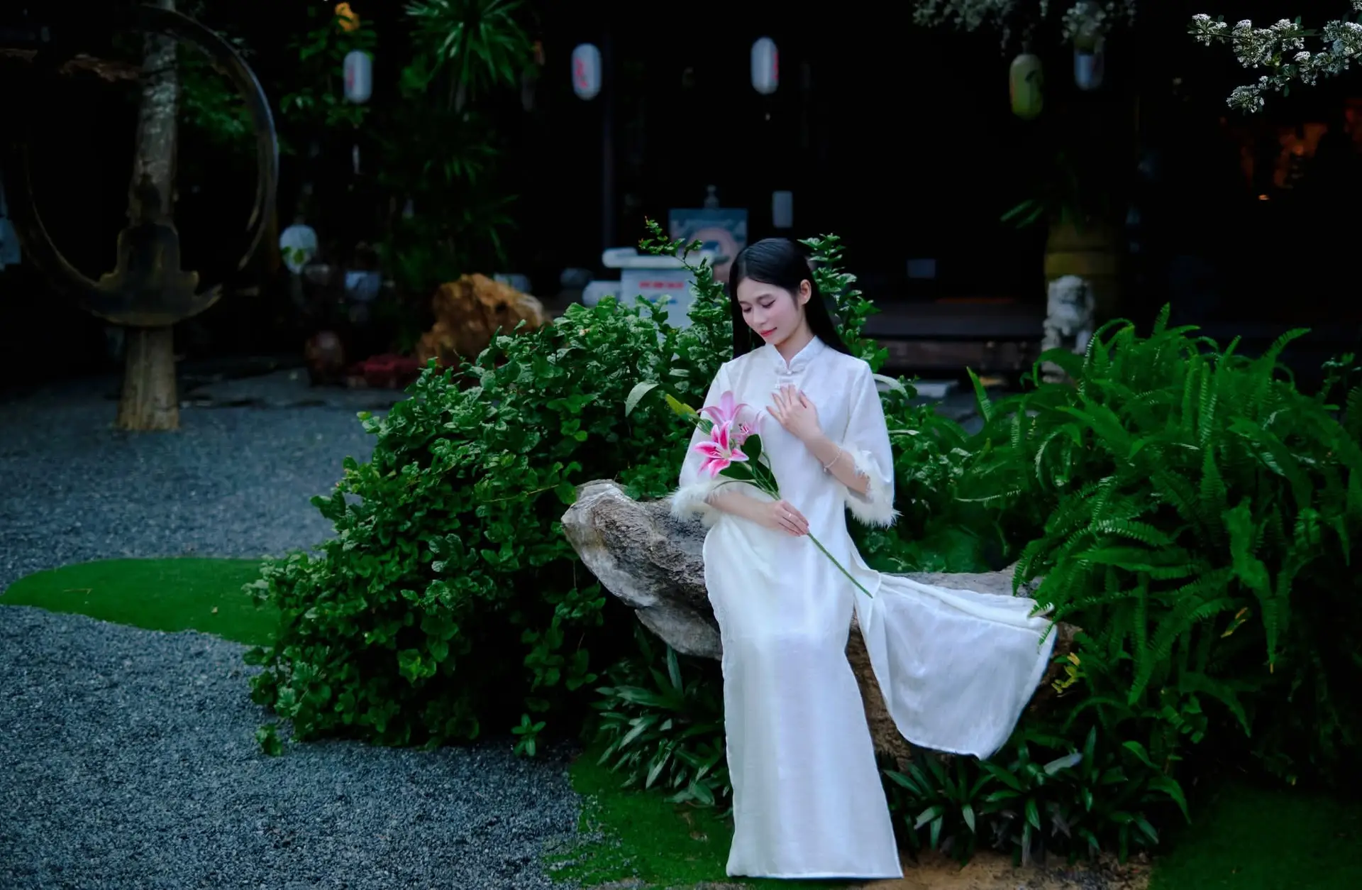 This stunning photograph captures a moment of exquisite grace featuring a Vietnamese woman adorned in a pristine white Ao Dai. She sits elegantly amidst the lush greenery of a tranquil garden, gently cradling a delicate pink lotus flower. The traditional Ao Dai beautifully accentuates her slender figure, highlighting the gentle and refined beauty of Vietnamese femininity. The harmonious blend of traditional attire, the womans natural charm, and the pure essence of the lotus creates a poetic tableau, evoking a deep sense of Vietnamese culture and spirit. More than just a fashion shot, this image is a timeless symbol of enduring beauty and profound cultural significance.